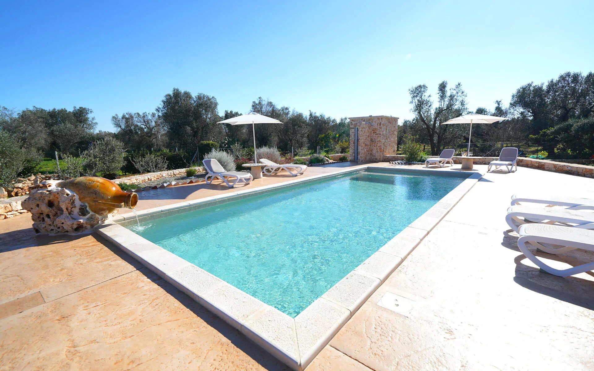 La grande piscina privata è circondata da un solarium dotato di lettini prendisole: il luogo perfetto per trascorrere lunghe giornate estive sotto il sole del Salento, rilassandosi e rinfrescandosi in compagnia di amici e familiari.