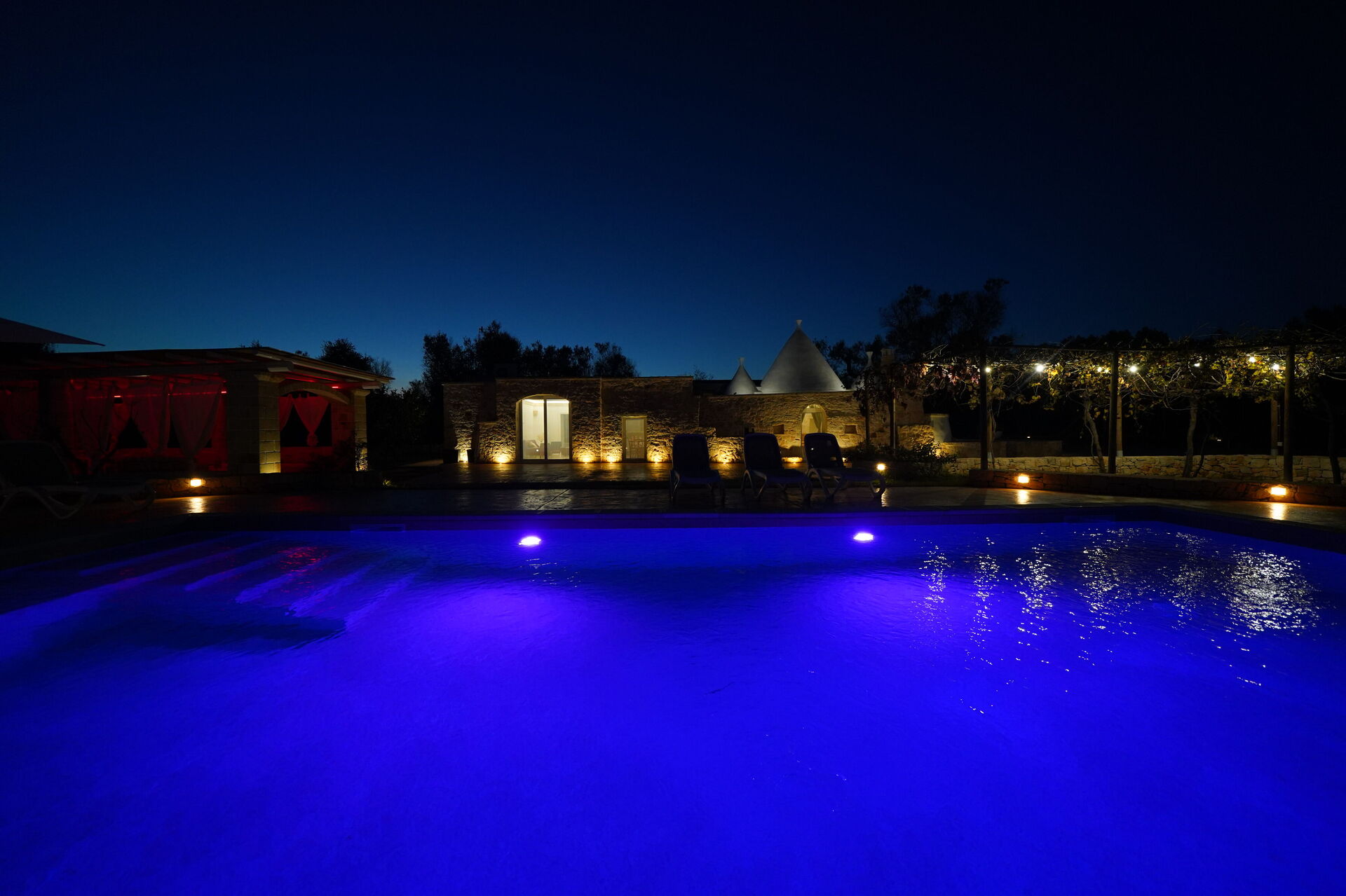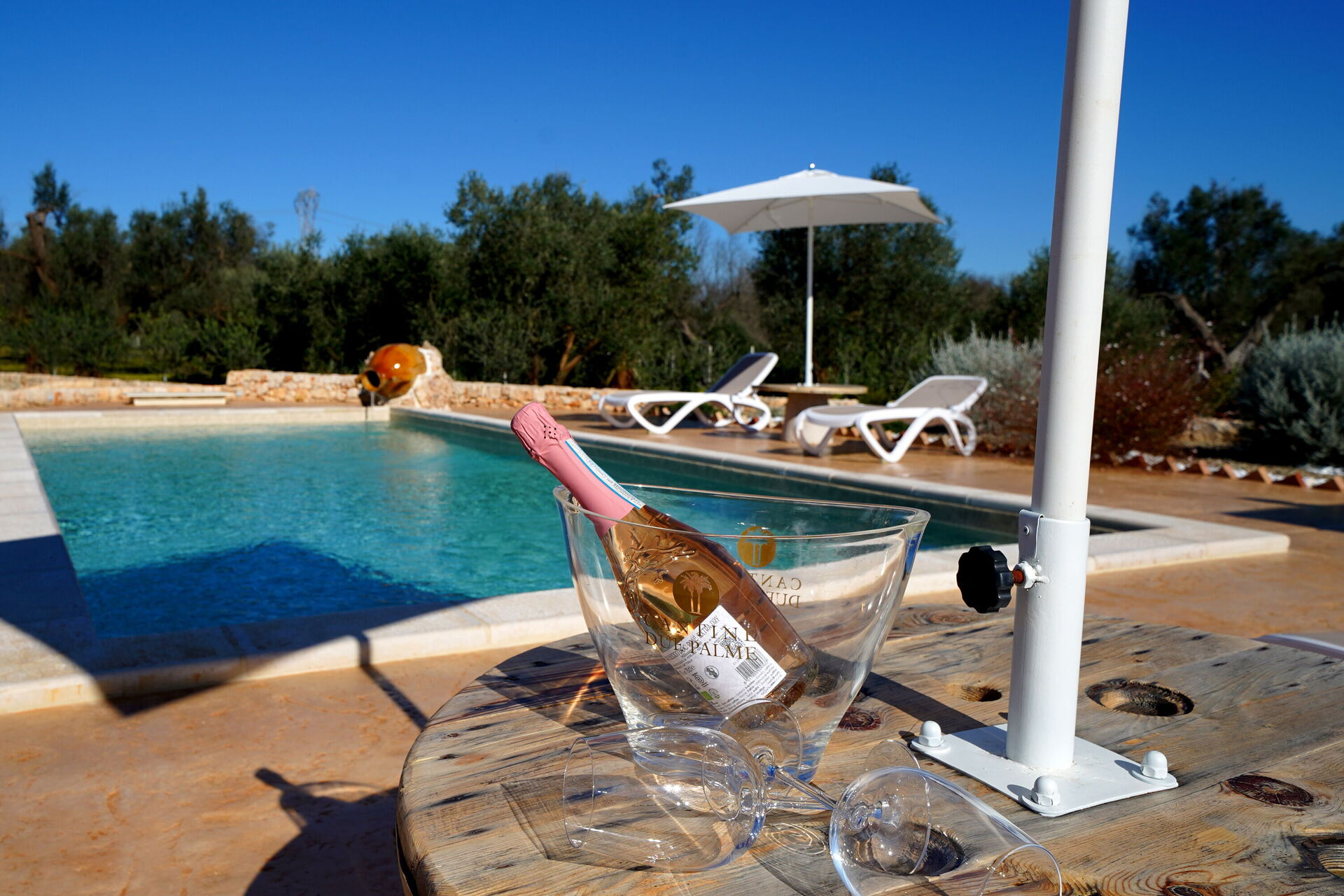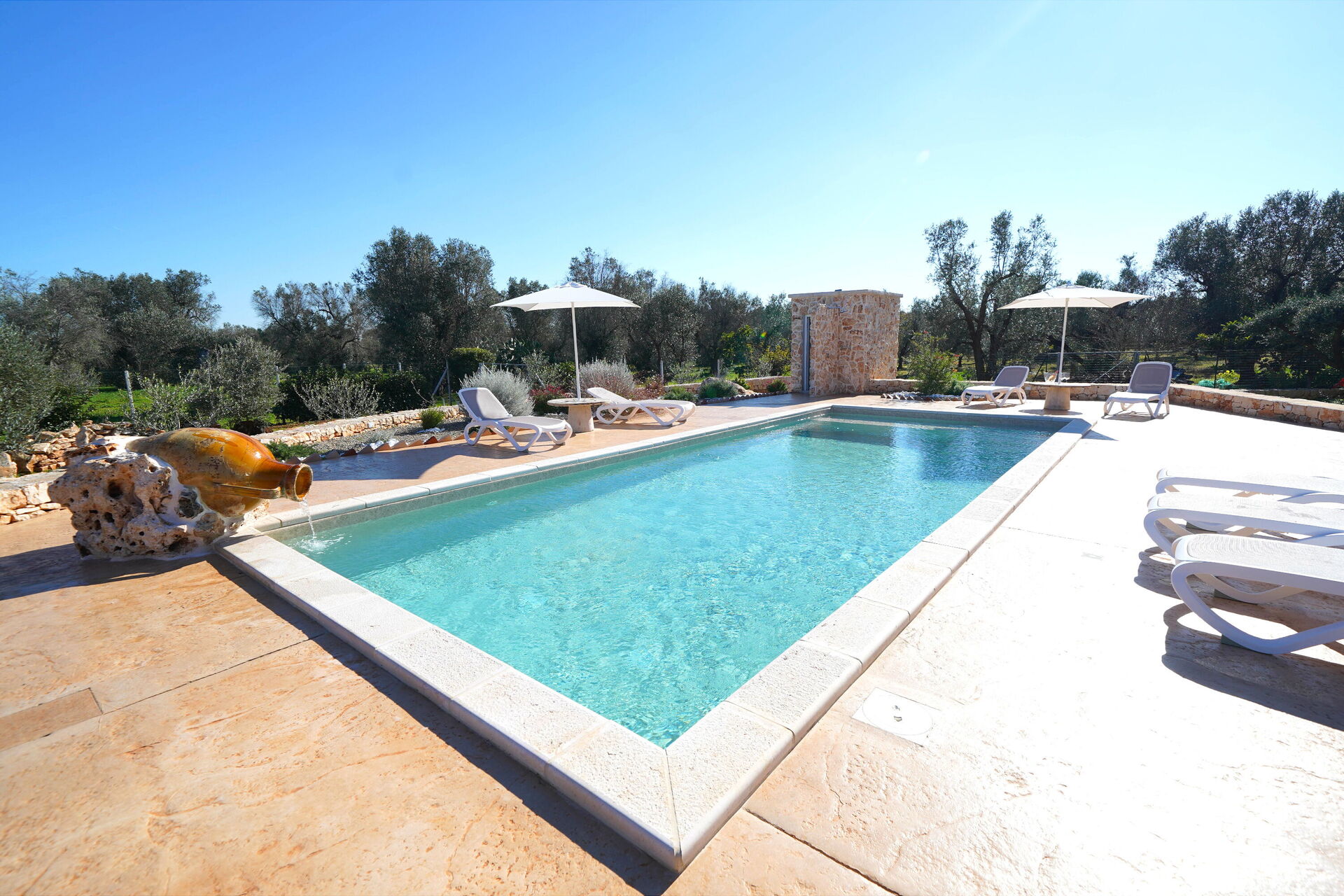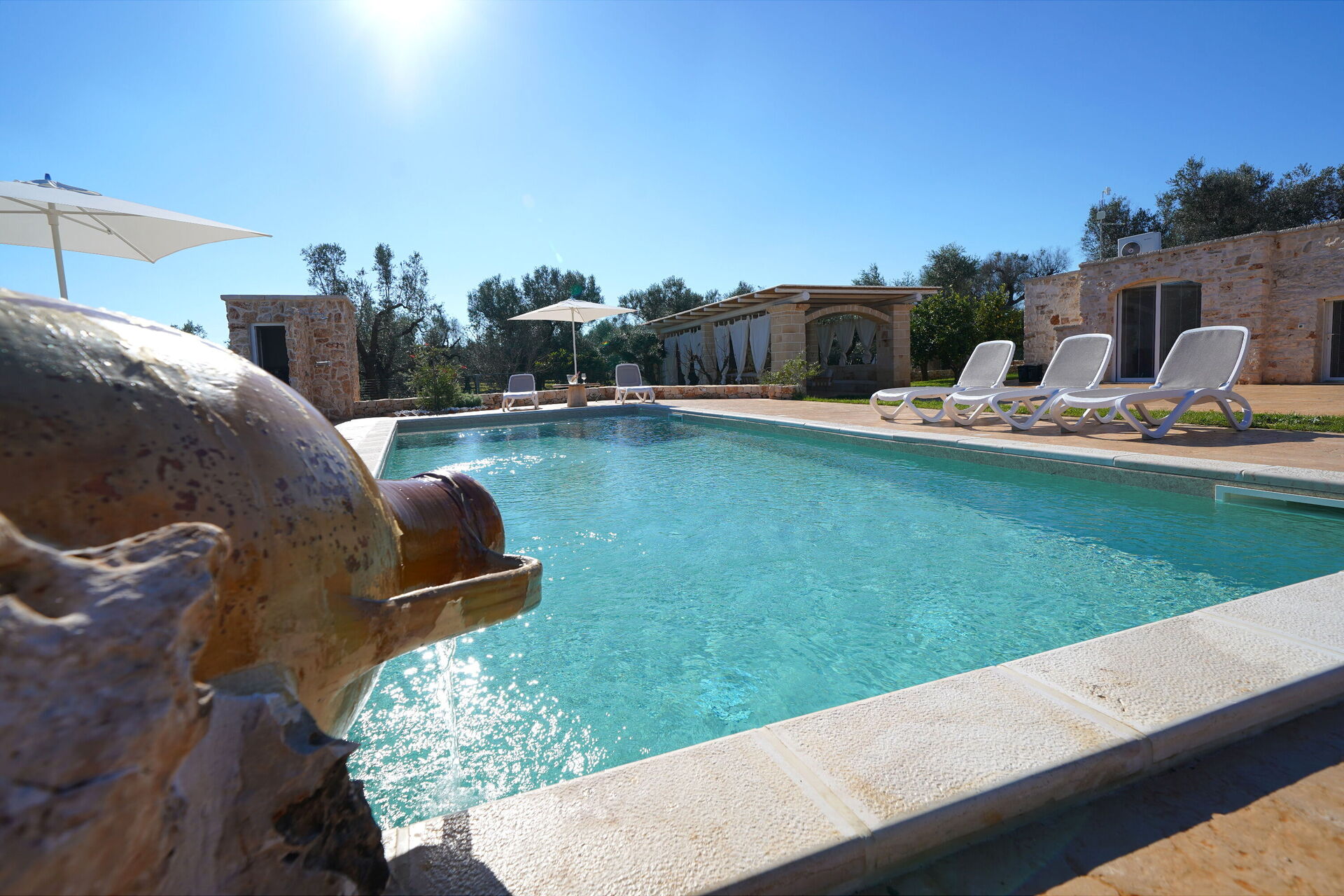 La grande piscina privata è circondata da un solarium dotato di lettini prendisole: il luogo perfetto per trascorrere lunghe giornate estive sotto il sole del Salento, rilassandosi e rinfrescandosi in compagnia di amici e familiari.