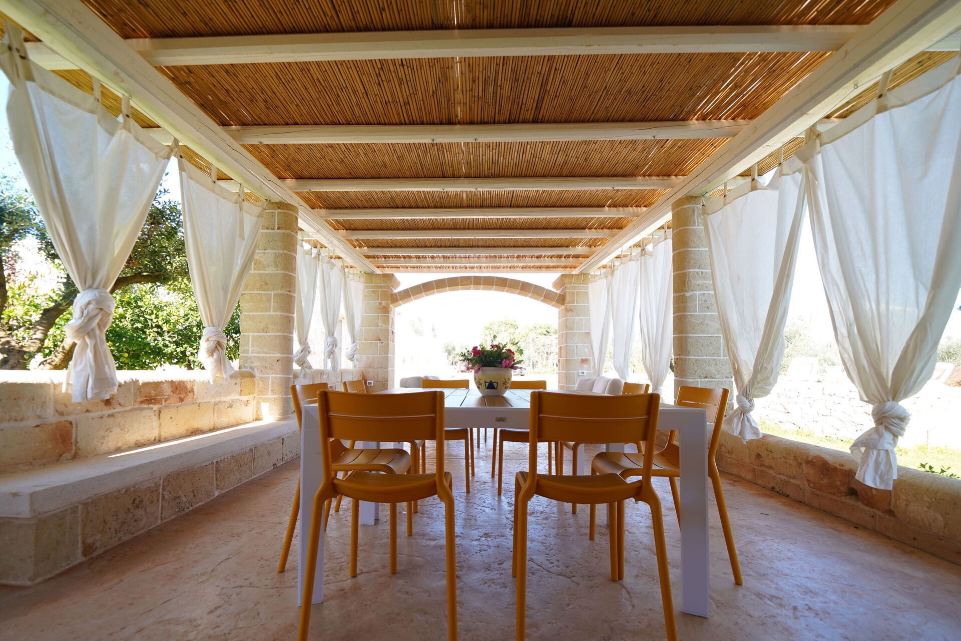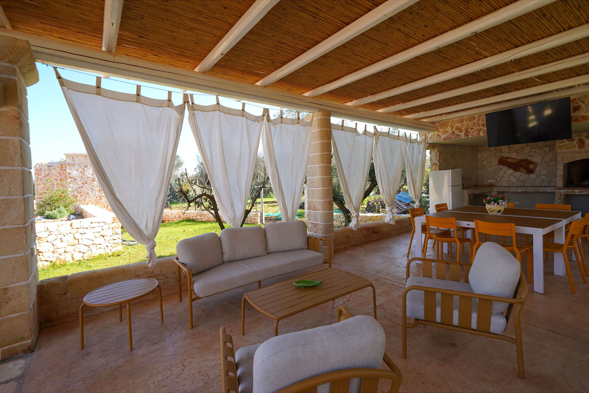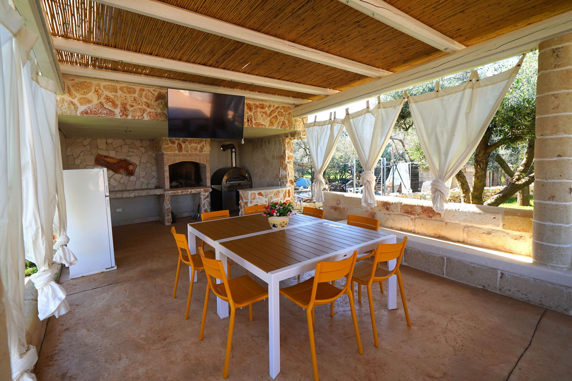 Una bella veranda attrezzata con tavolo, sedie e barbecue è a disposizione degli ospiti: qui potrete organizzare grigliate, mangiare all'aria aperta, ammirare lo splendido paesaggio rurale che circonda la proprietà e godere della vista panoramica sulla campagna della Puglia.
