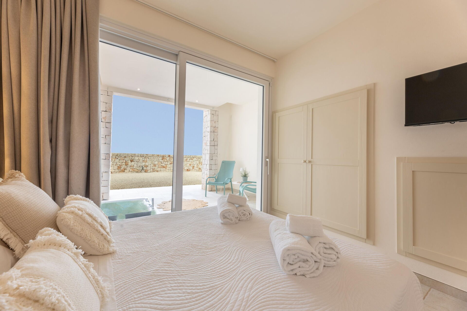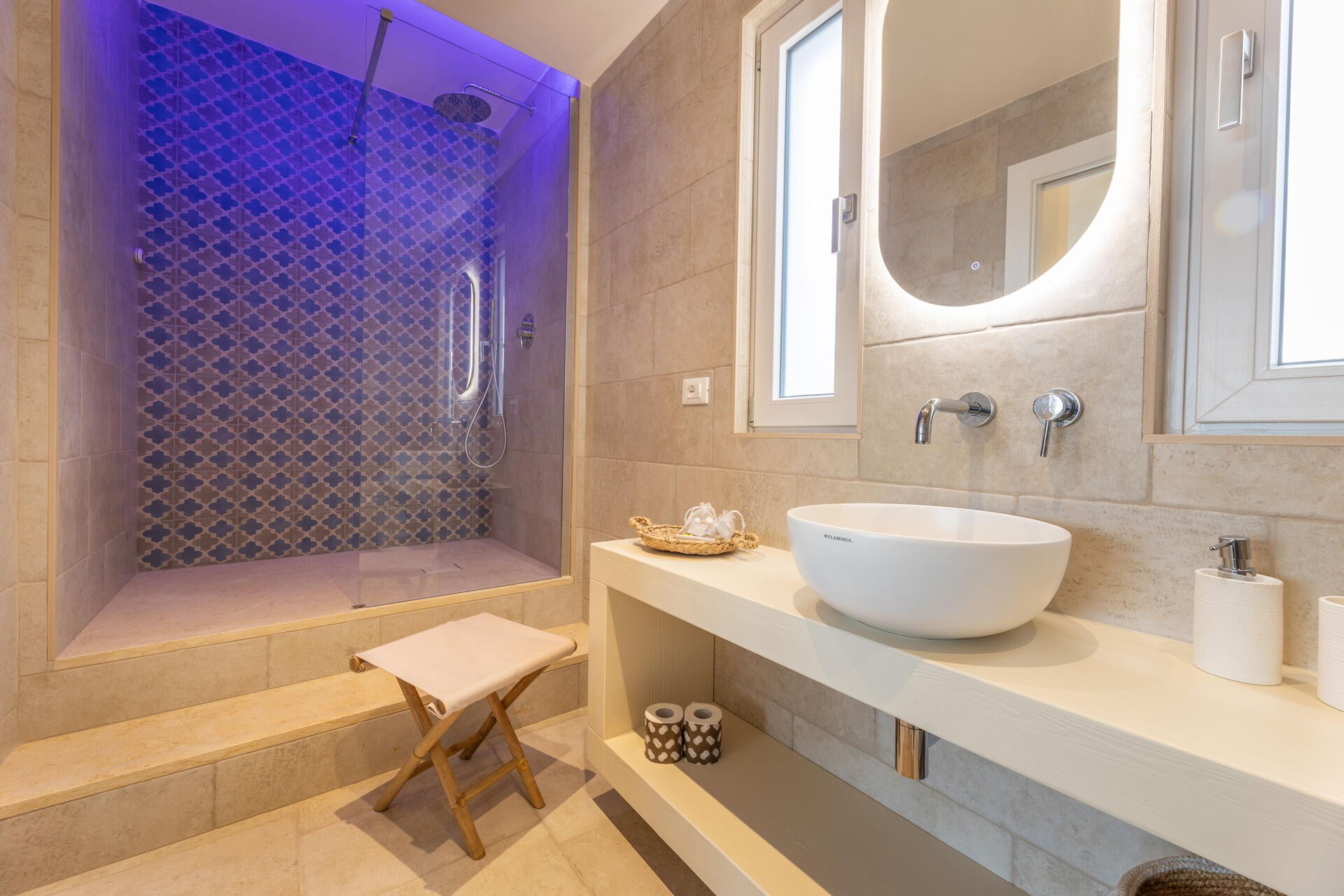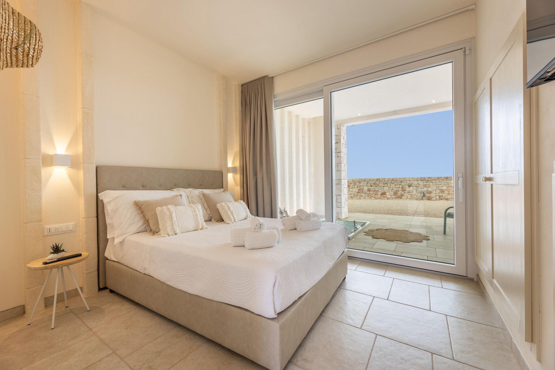 Piano terreno: (accessibili solo dall'esterno e non collegata internamente fra di loro e al resto della villa): 3 camere matrimoniali con bagno privato con doccia e con vasca idromassaggio esterna (1.80 x 1.20 metri; profondità 0,40 metri; riscaldata a 28-32°C)
