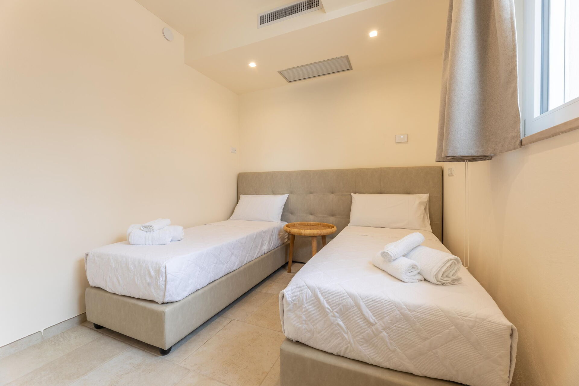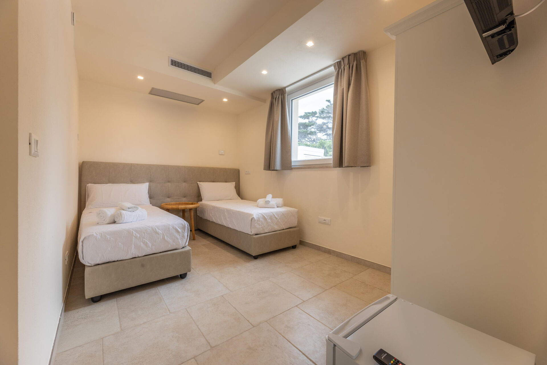 Piano terreno: camera matrimoniale (aria condizionata), bagno con doccia, camera con 2 letti singoli (aria condizionata).