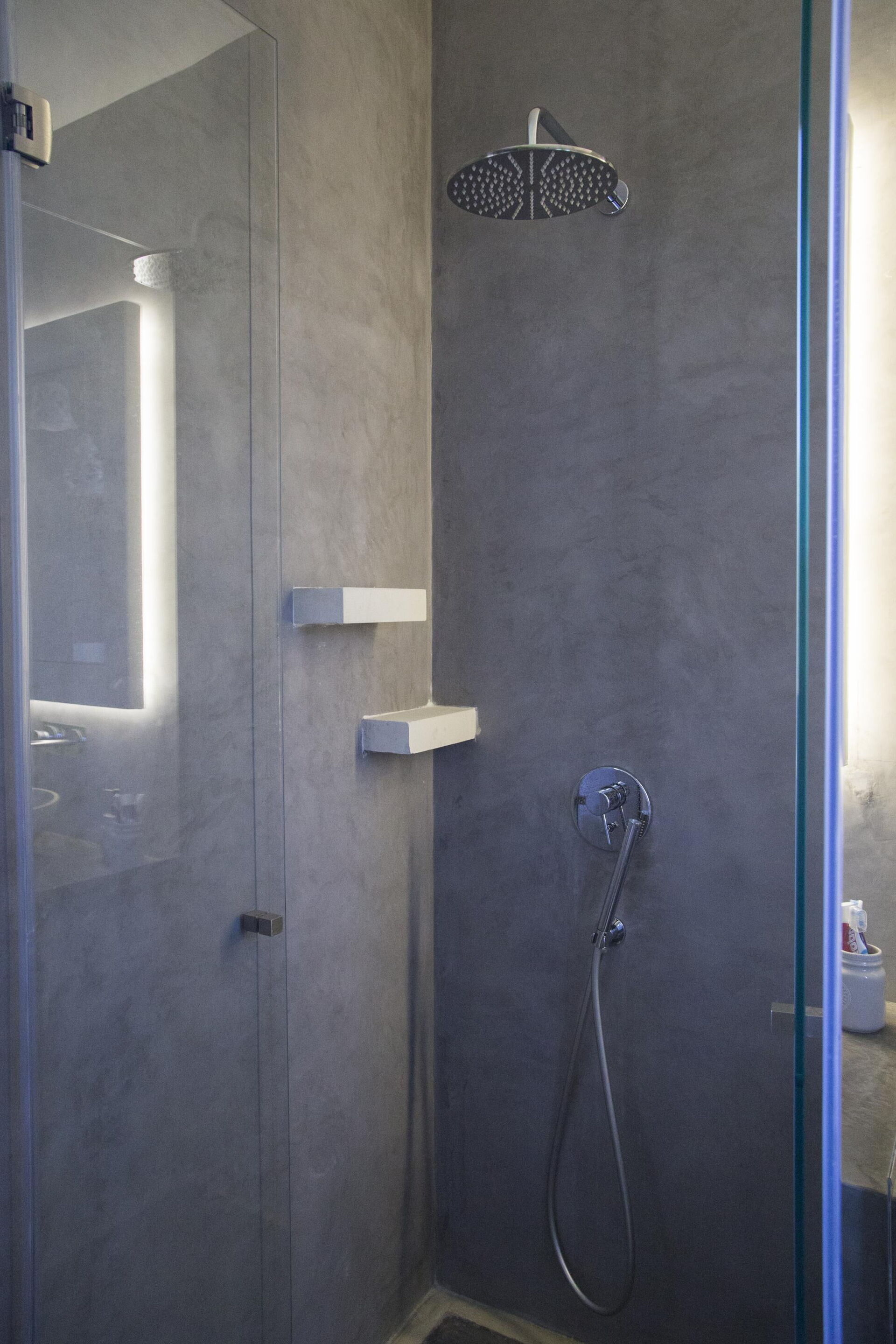 Camera con letto matrimoniale (aria condizionata) e bagno con doccia (senza finestra).