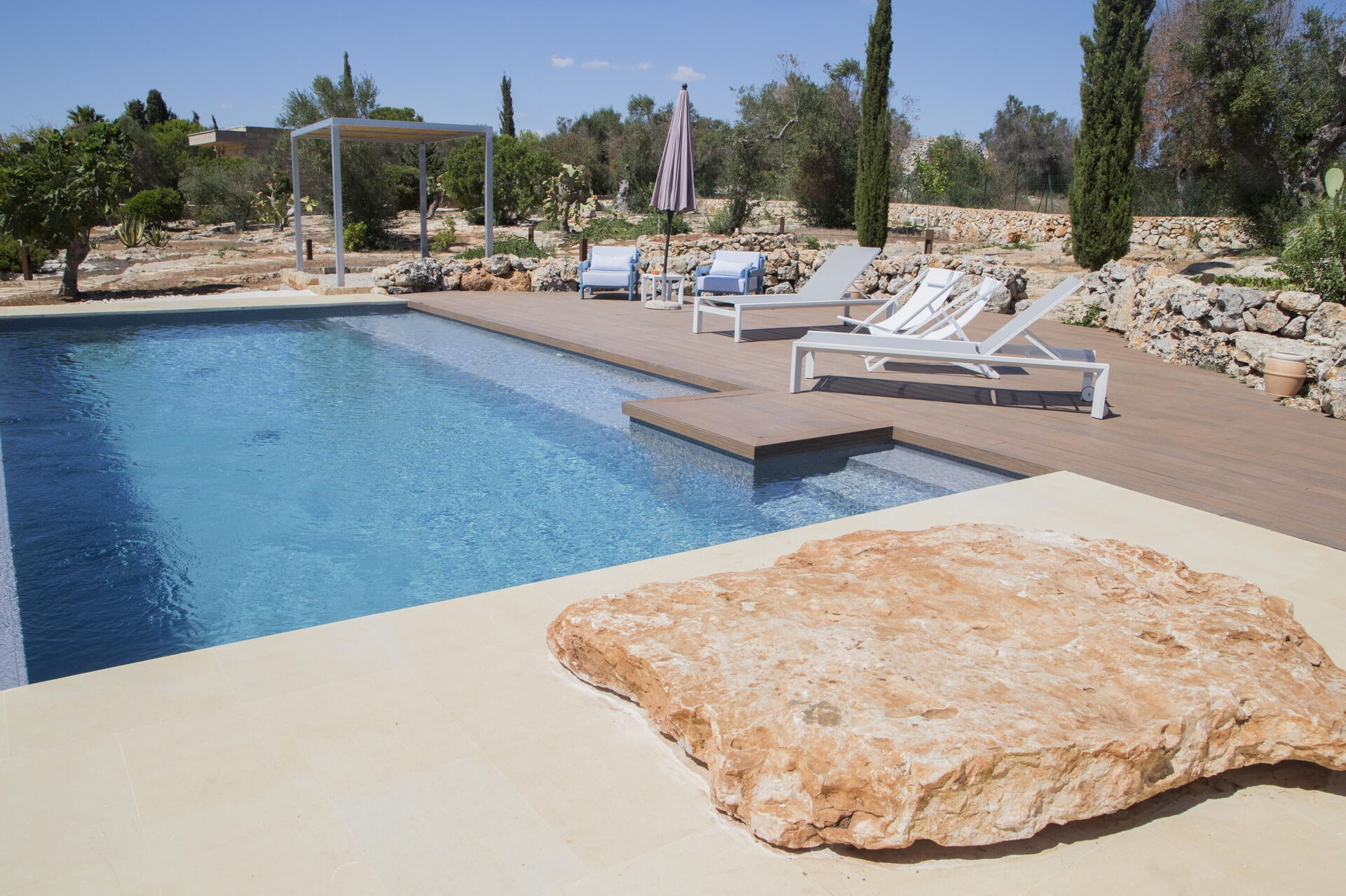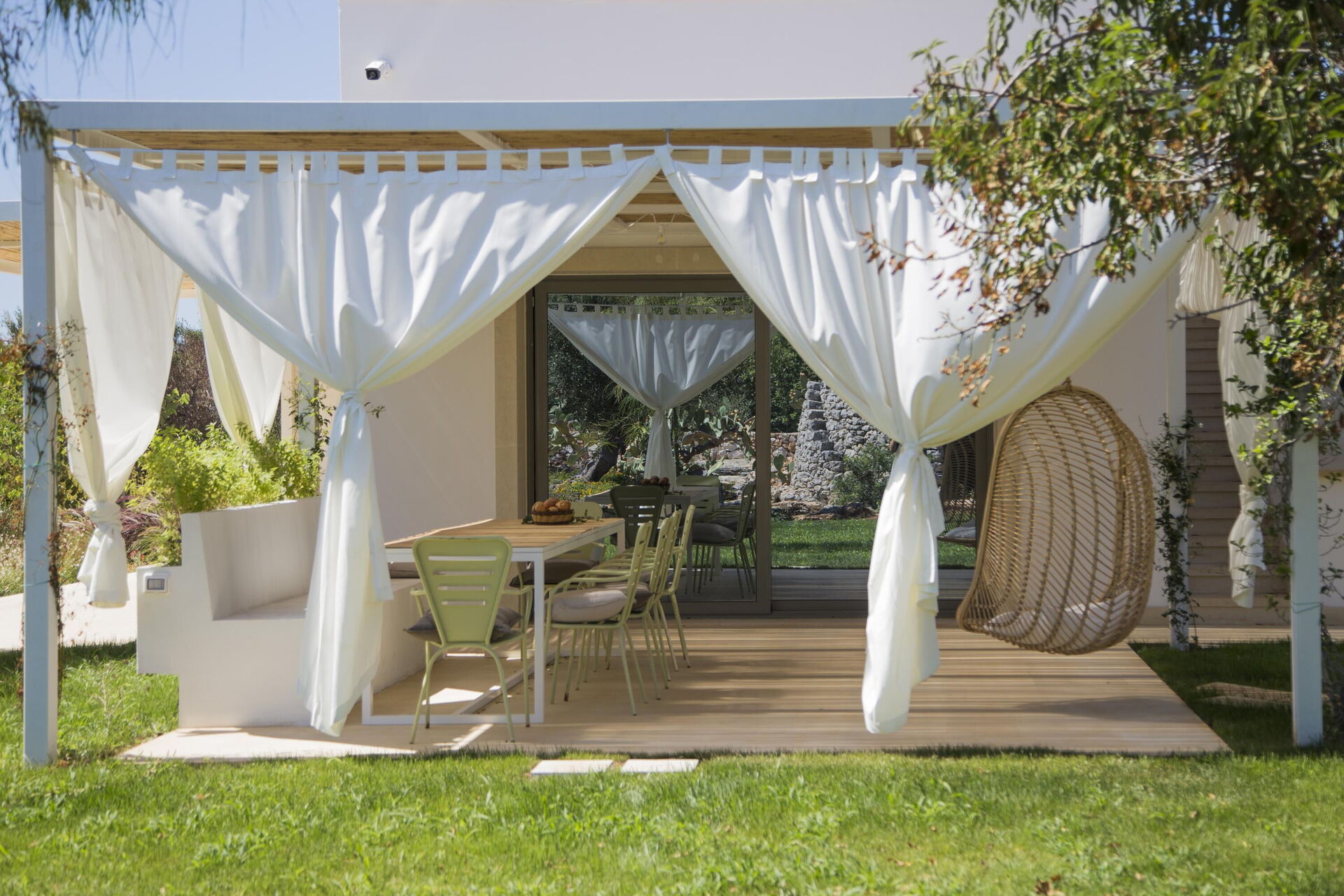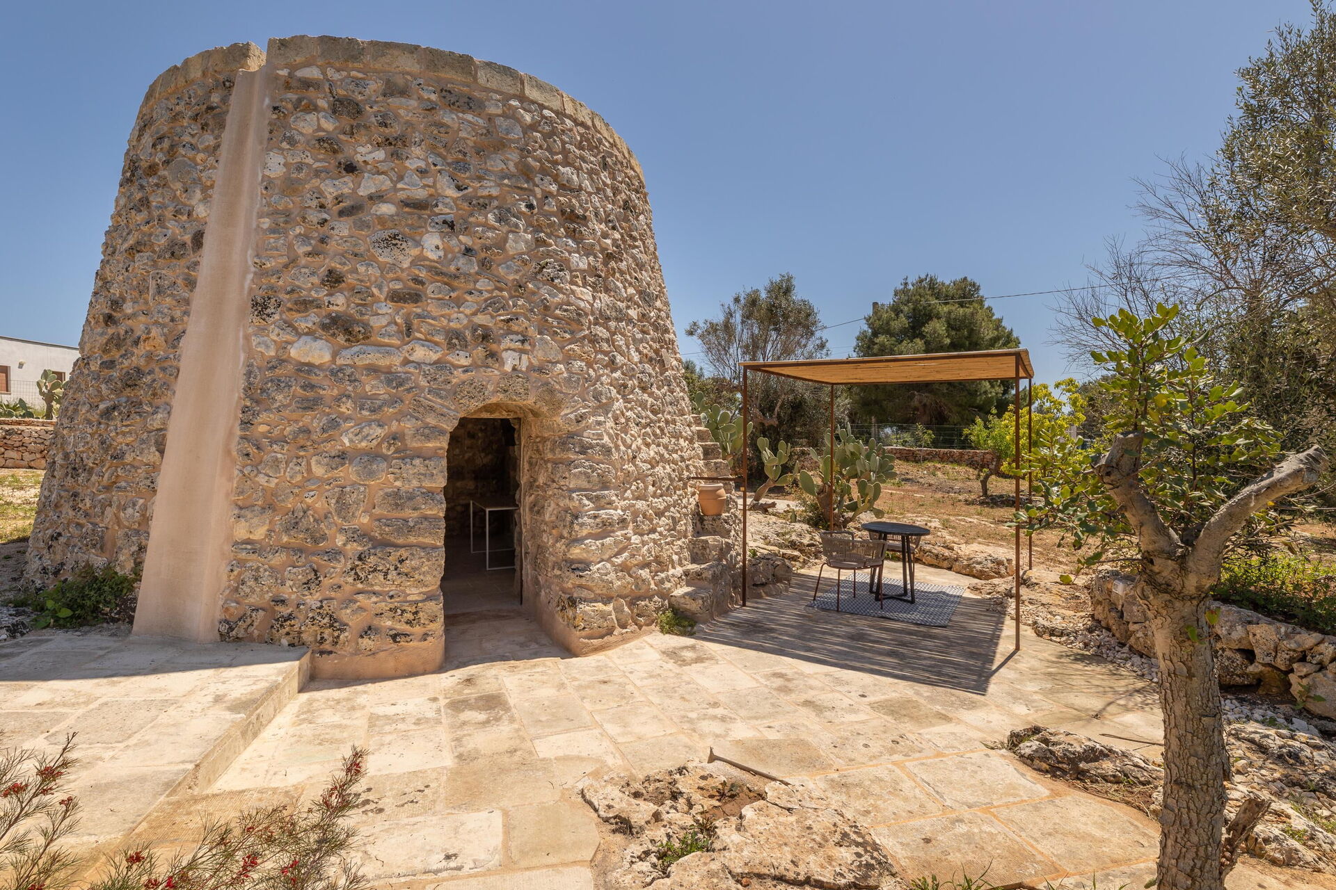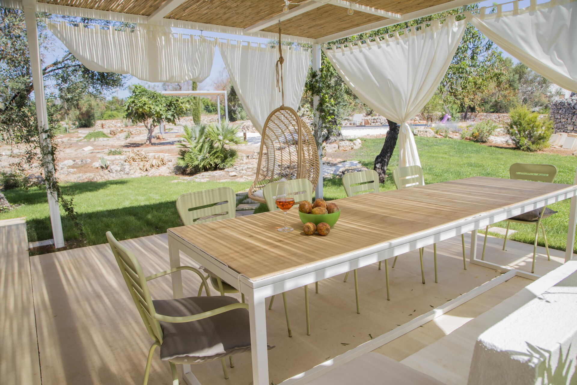 Muretti a secco e ampi spazi esterni dove è presente una piscina privata caratterizzano questa tipica proprietà pugliese. Un'area barbecue e una veranda attrezzata con tavoli e sedie permettono agli ospiti di organizzare gustose grigliate da condividere con amici e familiari, godendo della quiete che avvolge la proprietà.