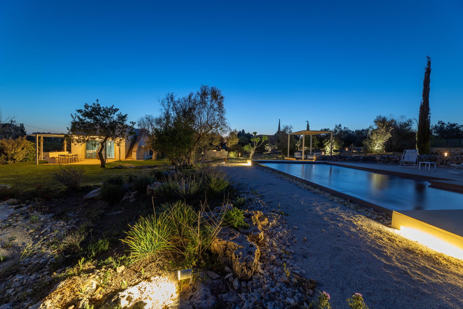 Villa Platino è circondata da uno splendido oliveto del Salento e da un ampio giardino di circa 4000 m2 con piante di macchia mediterranea.
