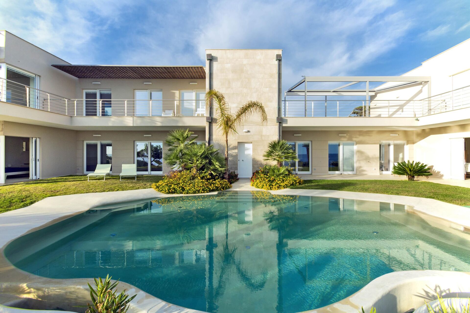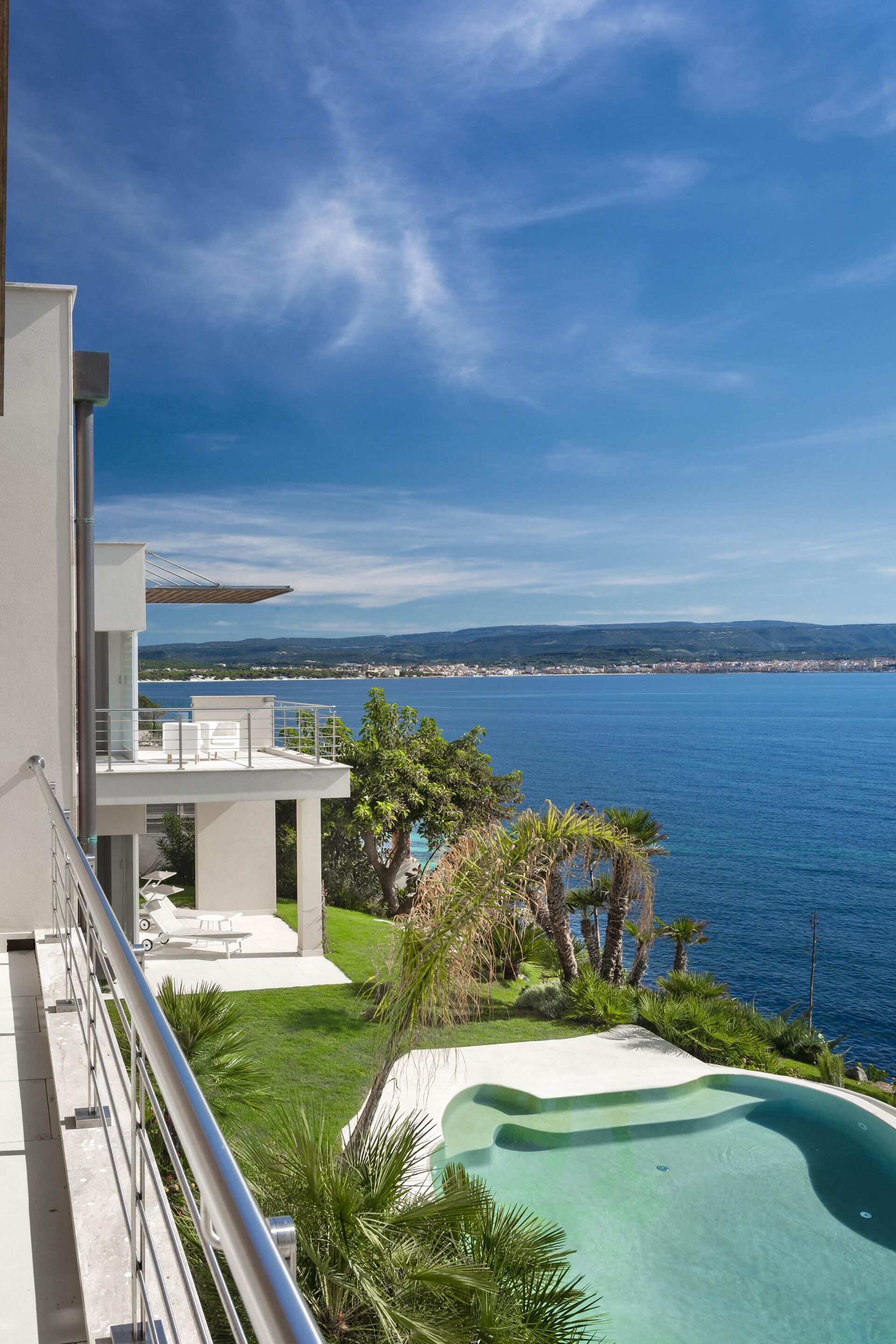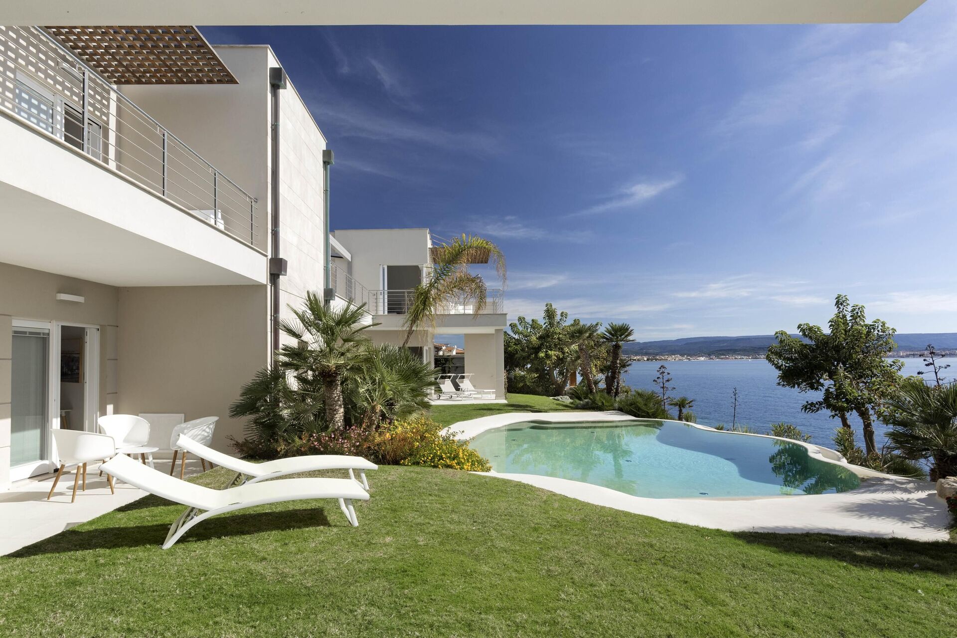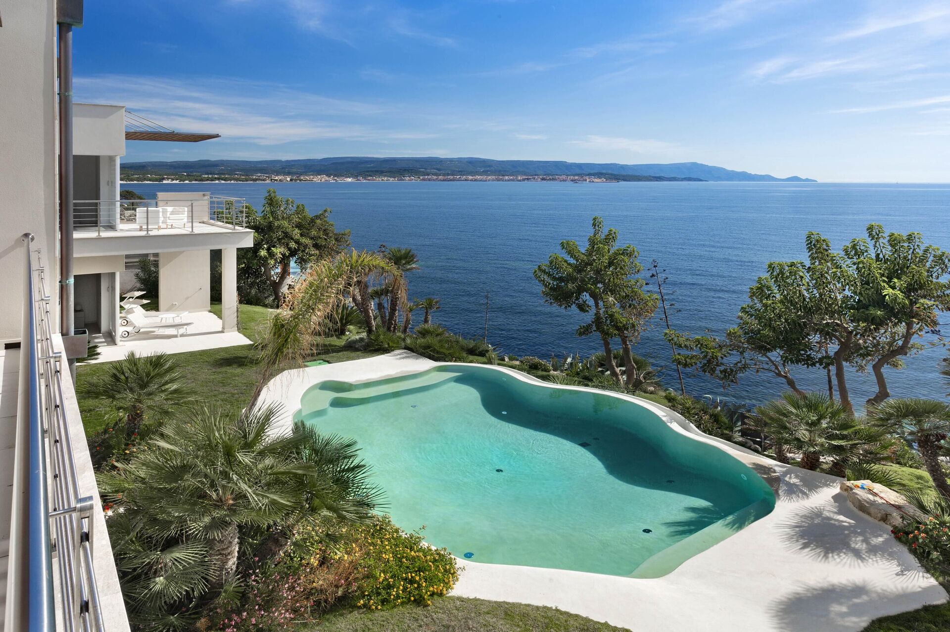 La bellissima villa in affitto dispone di 8 camere, ospitando quindi fino a 16 persone, e si sviluppa su due piani. Gli interni sono moderni e dotati di ogni comfort. Una elegante terrazza corre su tutto un lato del primo piano, la quale ha inoltre un grande pergolato con una zona pranzo all’aperto. Nell’ampio giardino che circonda tutta la proprietà è presente la piscina privata ad uso esclusivo degli ospiti, la quale si affaccia sul mare, offrendovi la possibilità di ammirare dei tramonti fantastici. Varie zone relax sono dislocate attorno alla piscina e alla struttura.