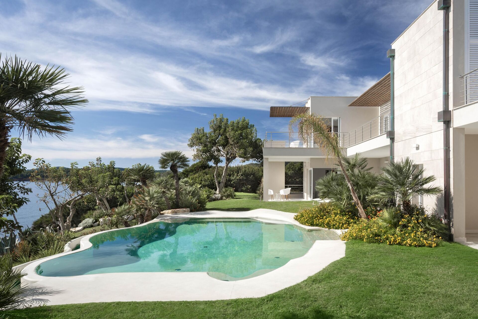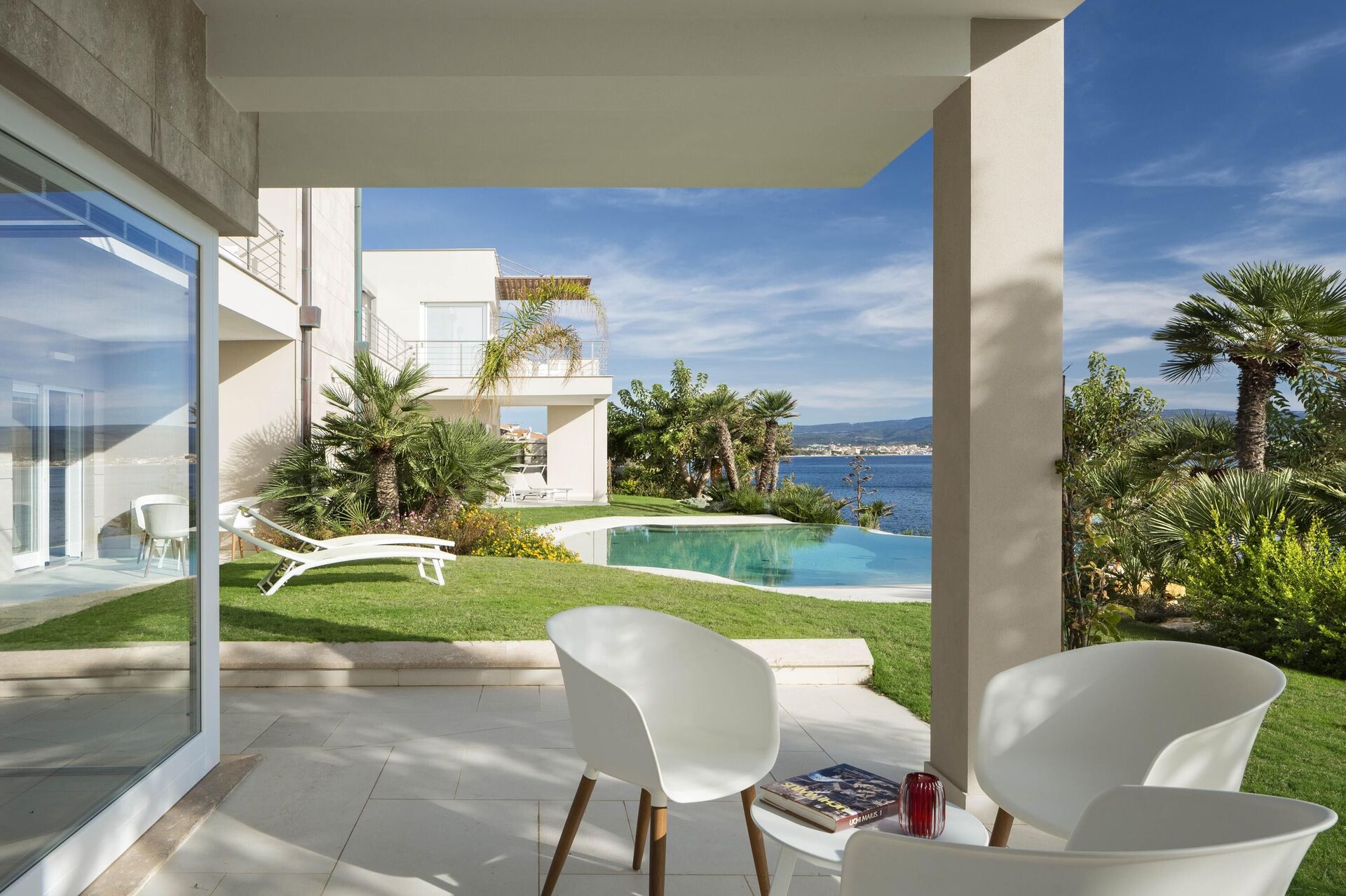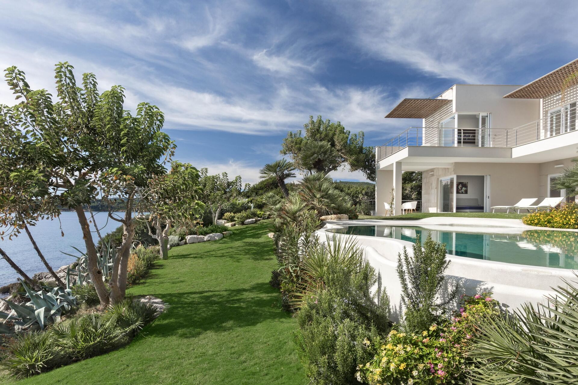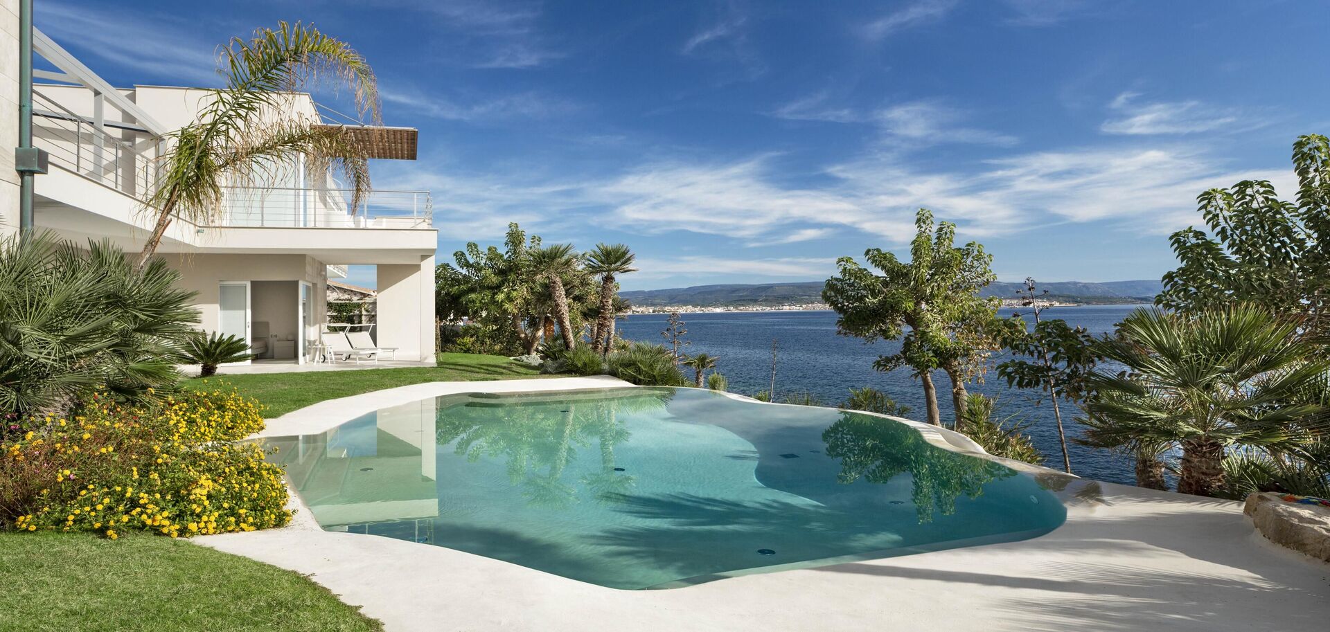 La bellissima villa in affitto dispone di 8 camere, ospitando quindi fino a 16 persone, e si sviluppa su due piani. Gli interni sono moderni e dotati di ogni comfort. Una elegante terrazza corre su tutto un lato del primo piano, la quale ha inoltre un grande pergolato con una zona pranzo all’aperto. Nell’ampio giardino che circonda tutta la proprietà è presente la piscina privata ad uso esclusivo degli ospiti, la quale si affaccia sul mare, offrendovi la possibilità di ammirare dei tramonti fantastici. Varie zone relax sono dislocate attorno alla piscina e alla struttura.