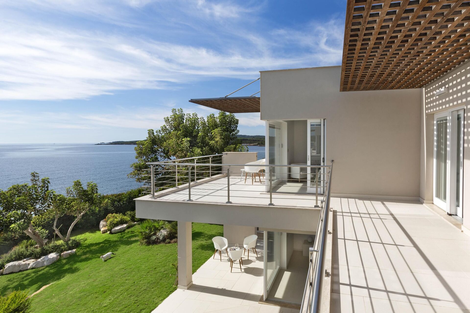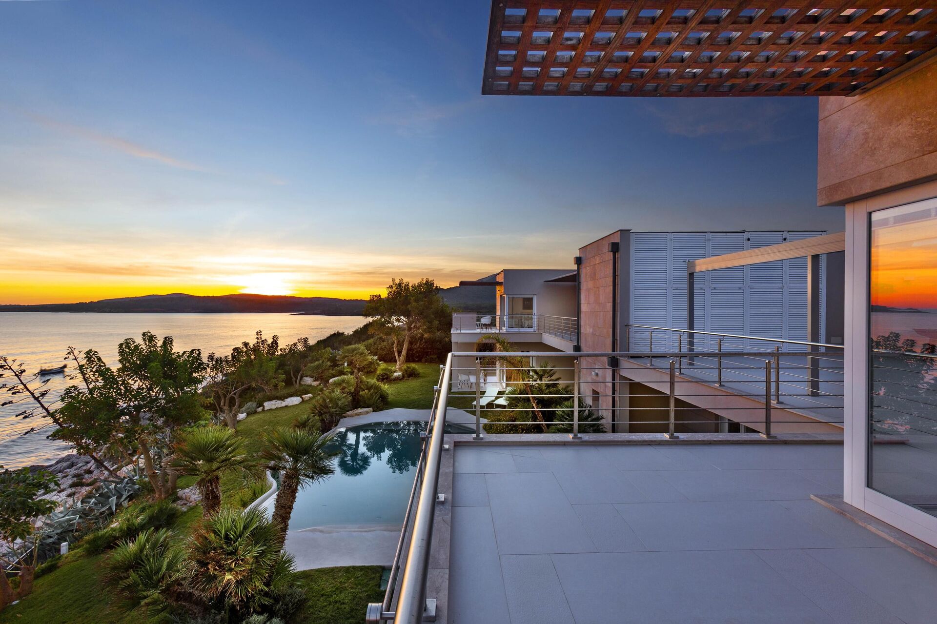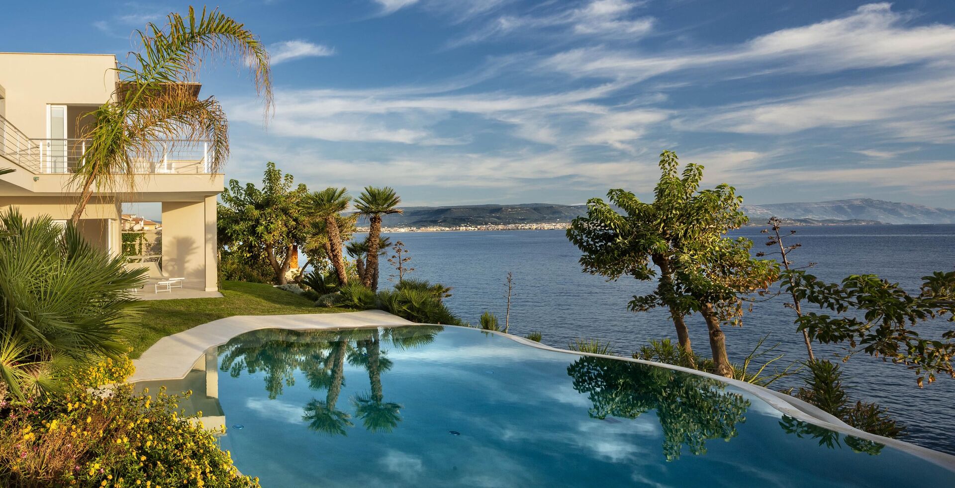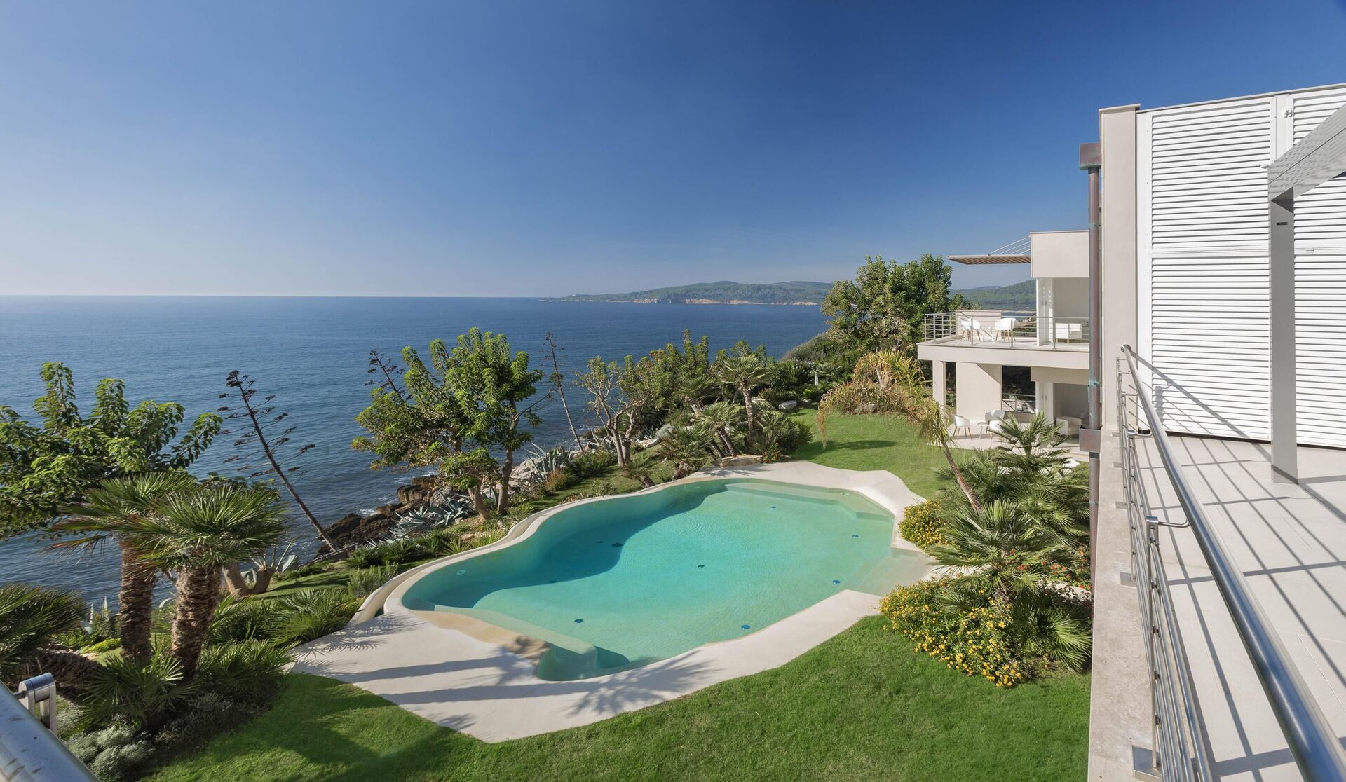 La bellissima villa in affitto dispone di 8 camere, ospitando quindi fino a 16 persone, e si sviluppa su due piani. Gli interni sono moderni e dotati di ogni comfort. Una elegante terrazza corre su tutto un lato del primo piano, la quale ha inoltre un grande pergolato con una zona pranzo all’aperto. Nell’ampio giardino che circonda tutta la proprietà è presente la piscina privata ad uso esclusivo degli ospiti, la quale si affaccia sul mare, offrendovi la possibilità di ammirare dei tramonti fantastici. Varie zone relax sono dislocate attorno alla piscina e alla struttura.
