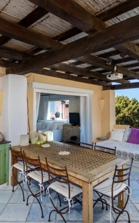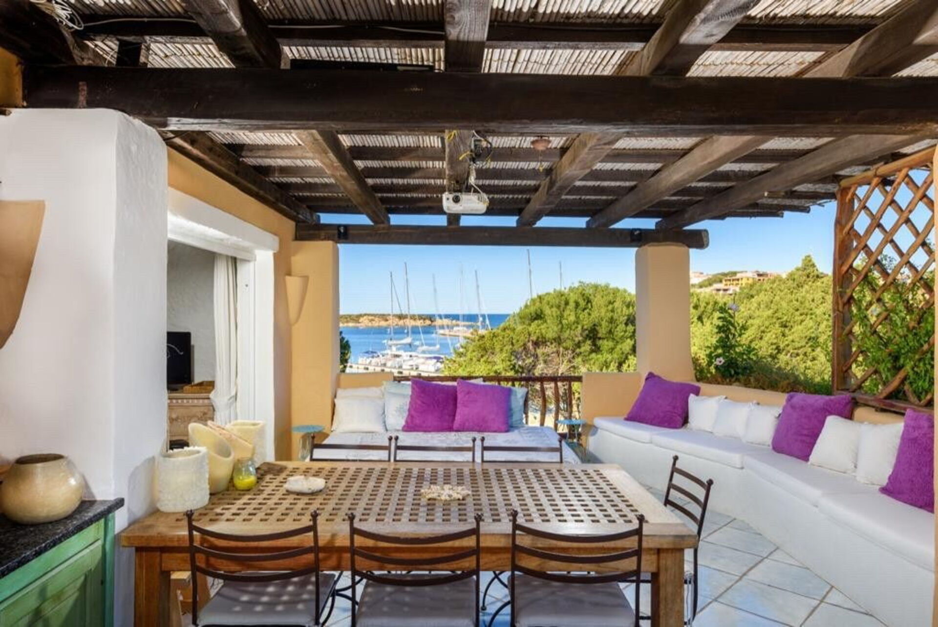La casa dispone di una panoramica veranda coperta e attrezzata con tavolo e sedie per mangiare all’aria aperta e godere di una piacevole vista sul vecchio molo della baia di Porto Cervo.