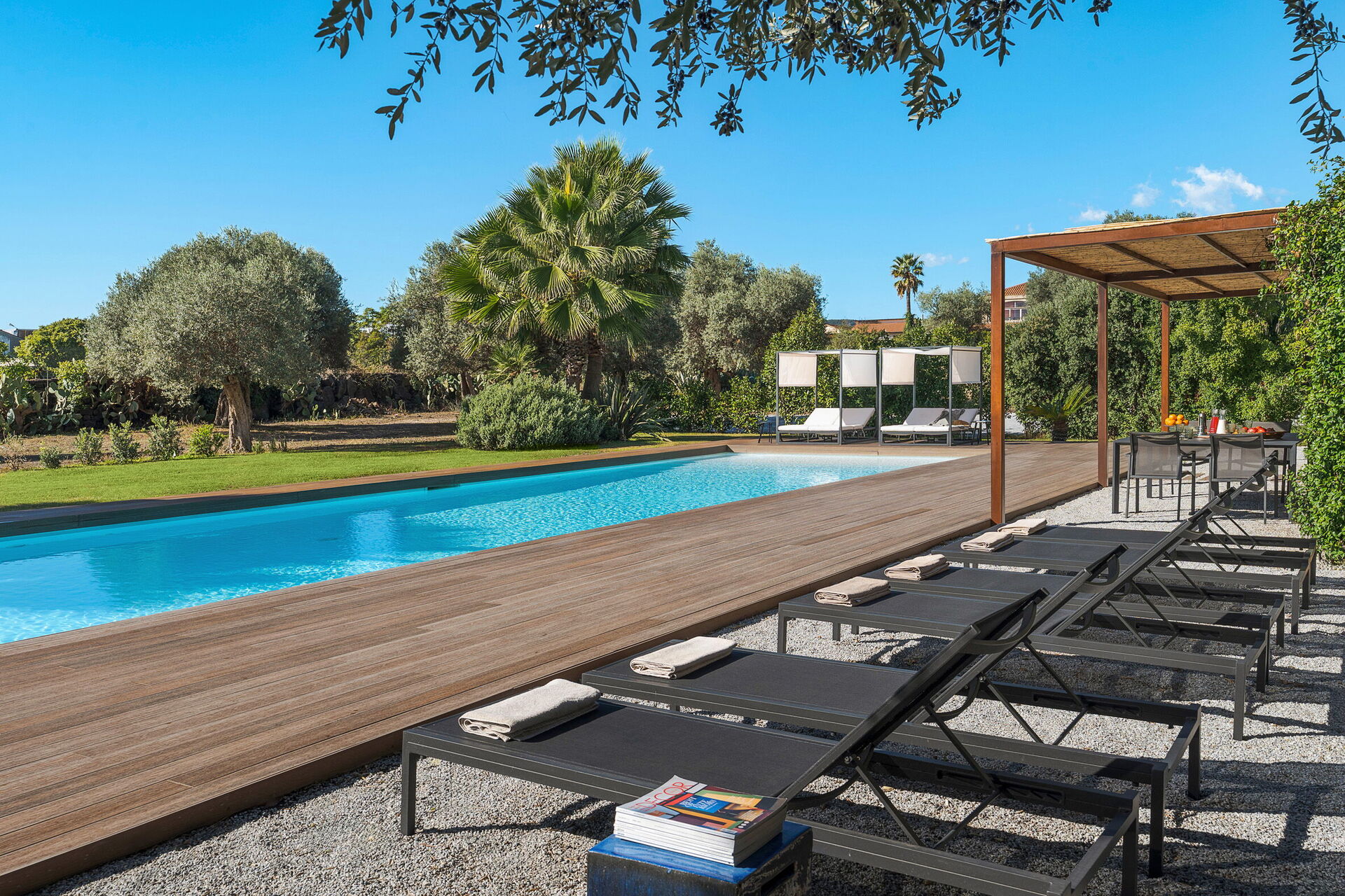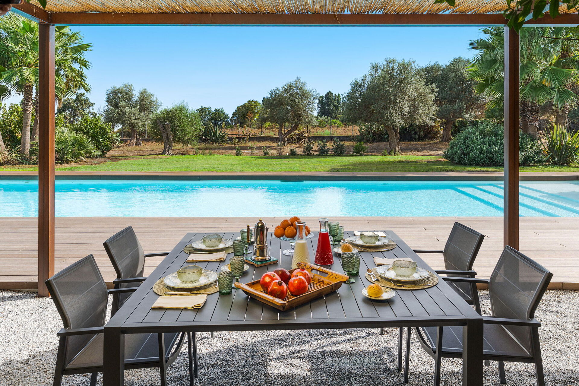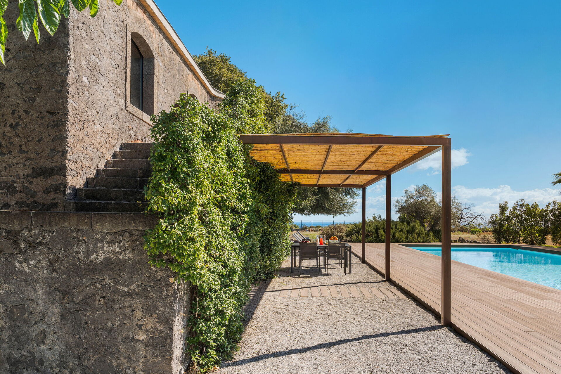 La meraviglia di Muna Retreat si riflette anche sugli esterni: il bellissimo giardino ricco di piante tipiche della campagna siciliana ospita una bella e grande piscina privata depurata al sale. I lettini prendisole e gli ombrelloni a bordo piscina vi permetteranno di godere di momenti di relax tra i profumi e il sole della Sicilia.