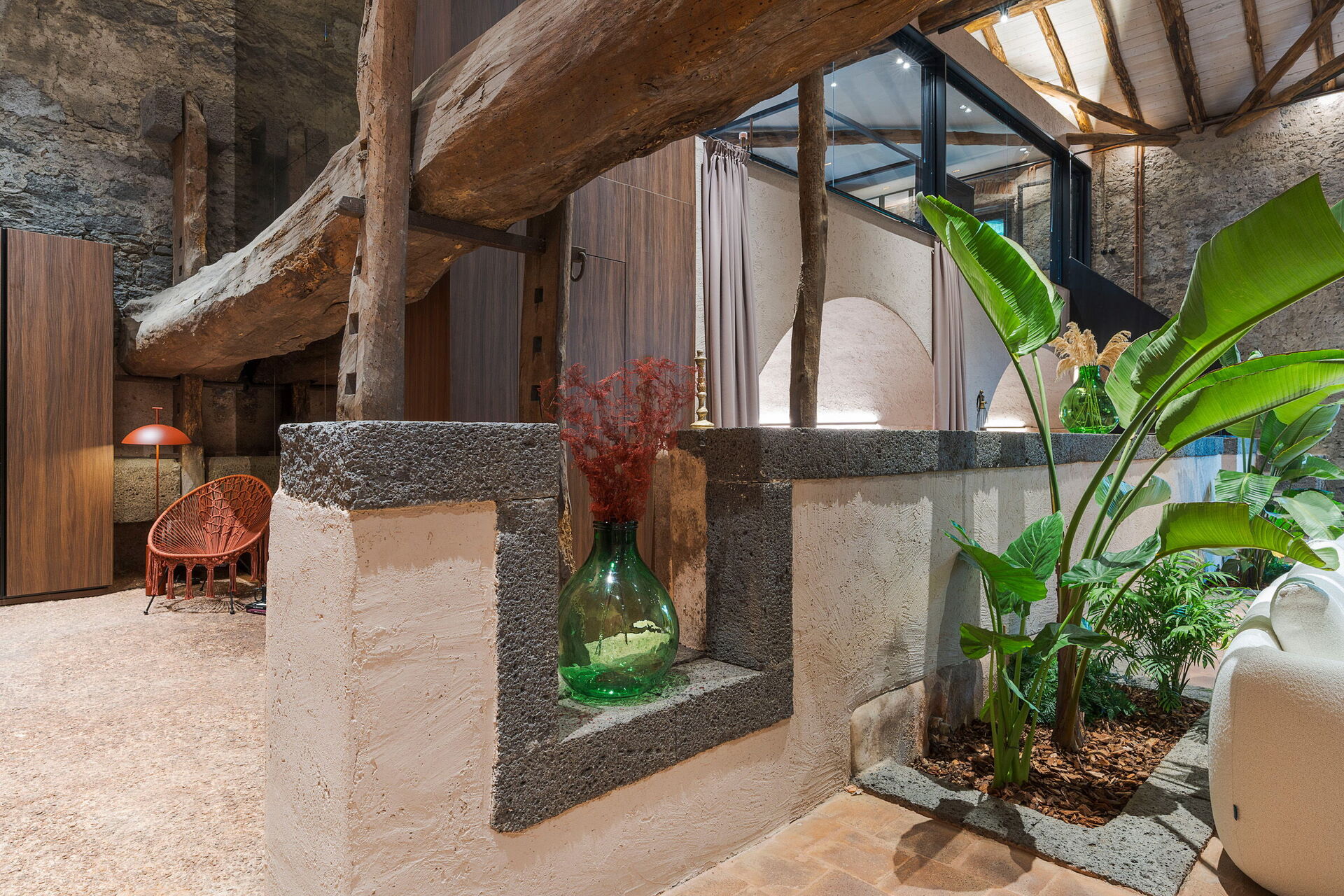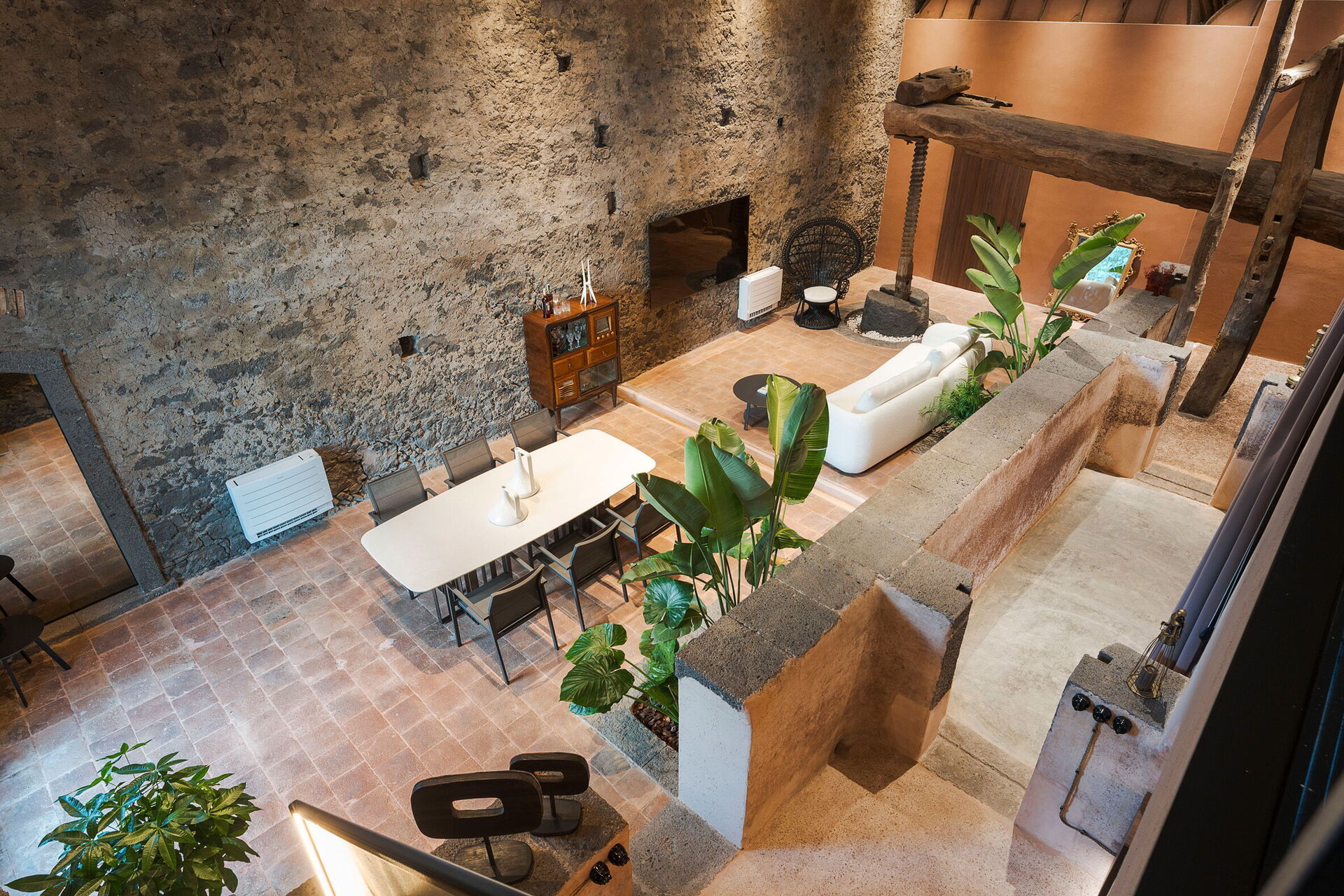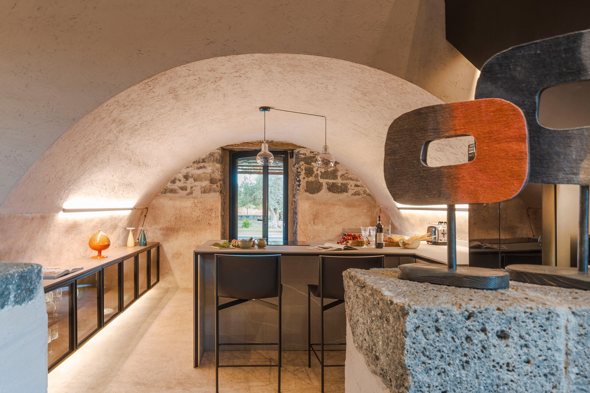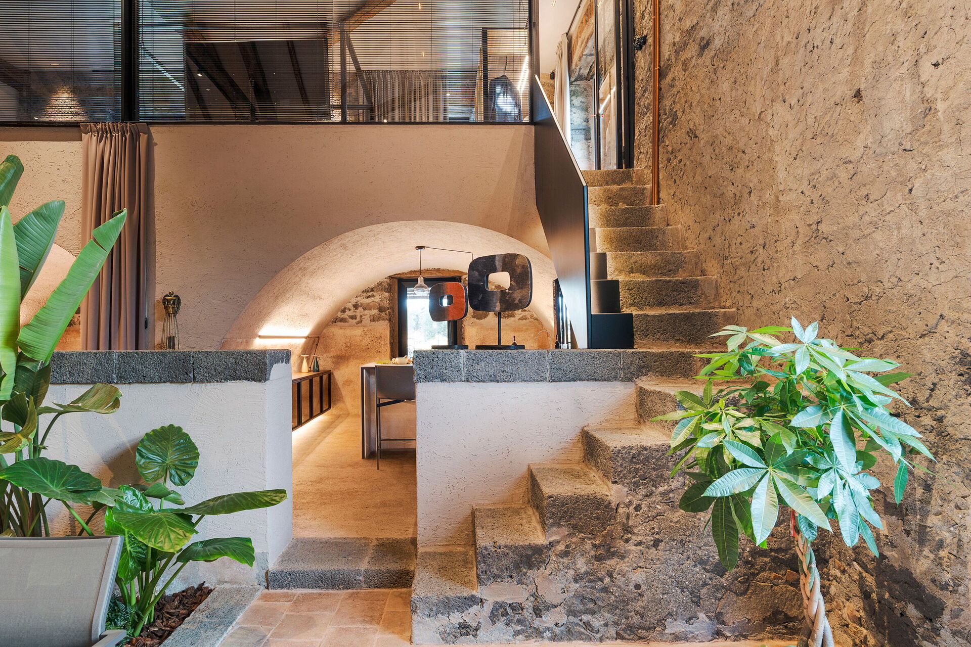 Gli interni e tutti gli ambienti hanno un grande fascino e sono arredati con gusto e cura dei particolari. Il grigio della pietra e il colore del legno sono il filo conduttore della mobilia interna ed esterna. La tradizionale architettura siciliana è rievocata in ogni spazio: travi ai soffitti, scale in pietra e grandi archi mattonati che coronano i muri o separano le varie zone.