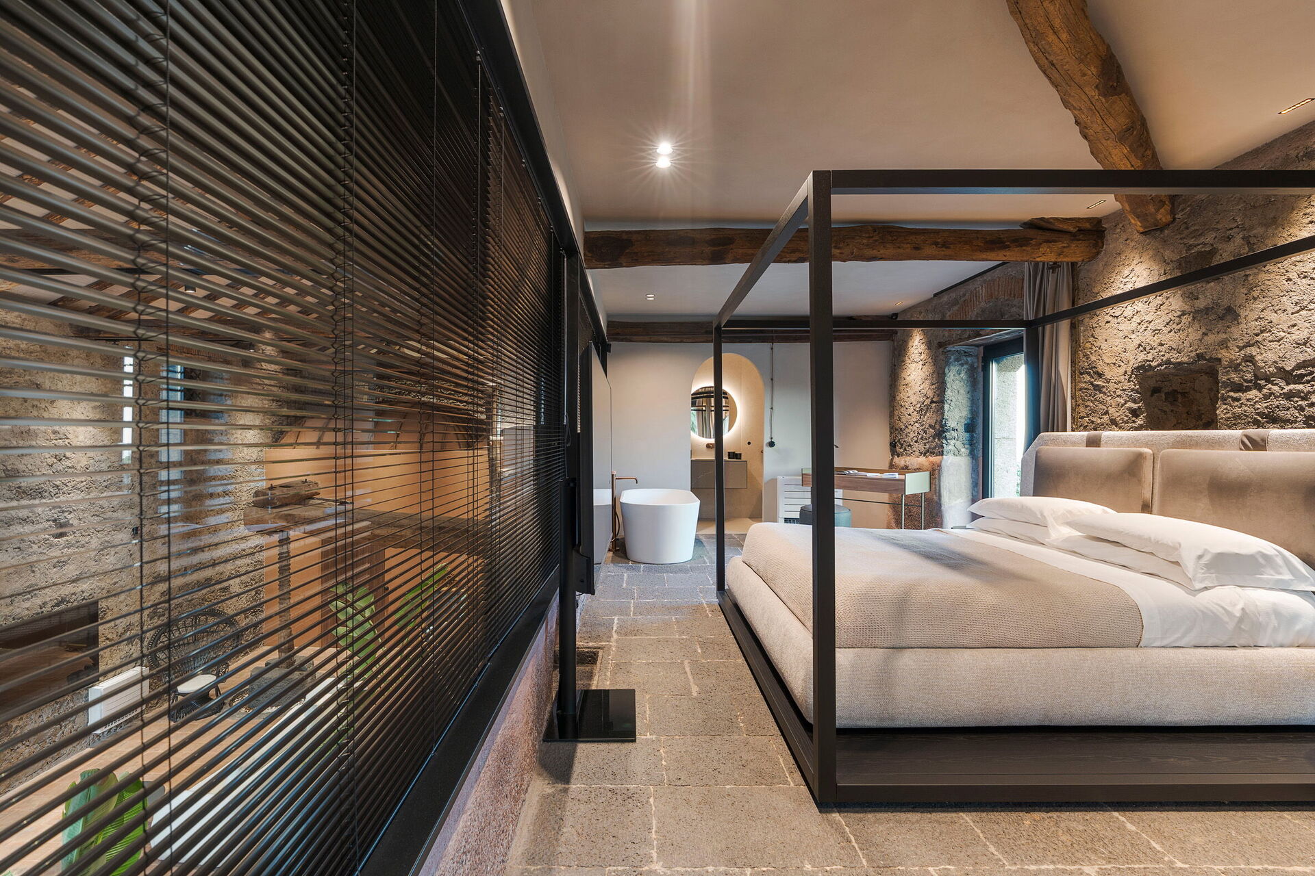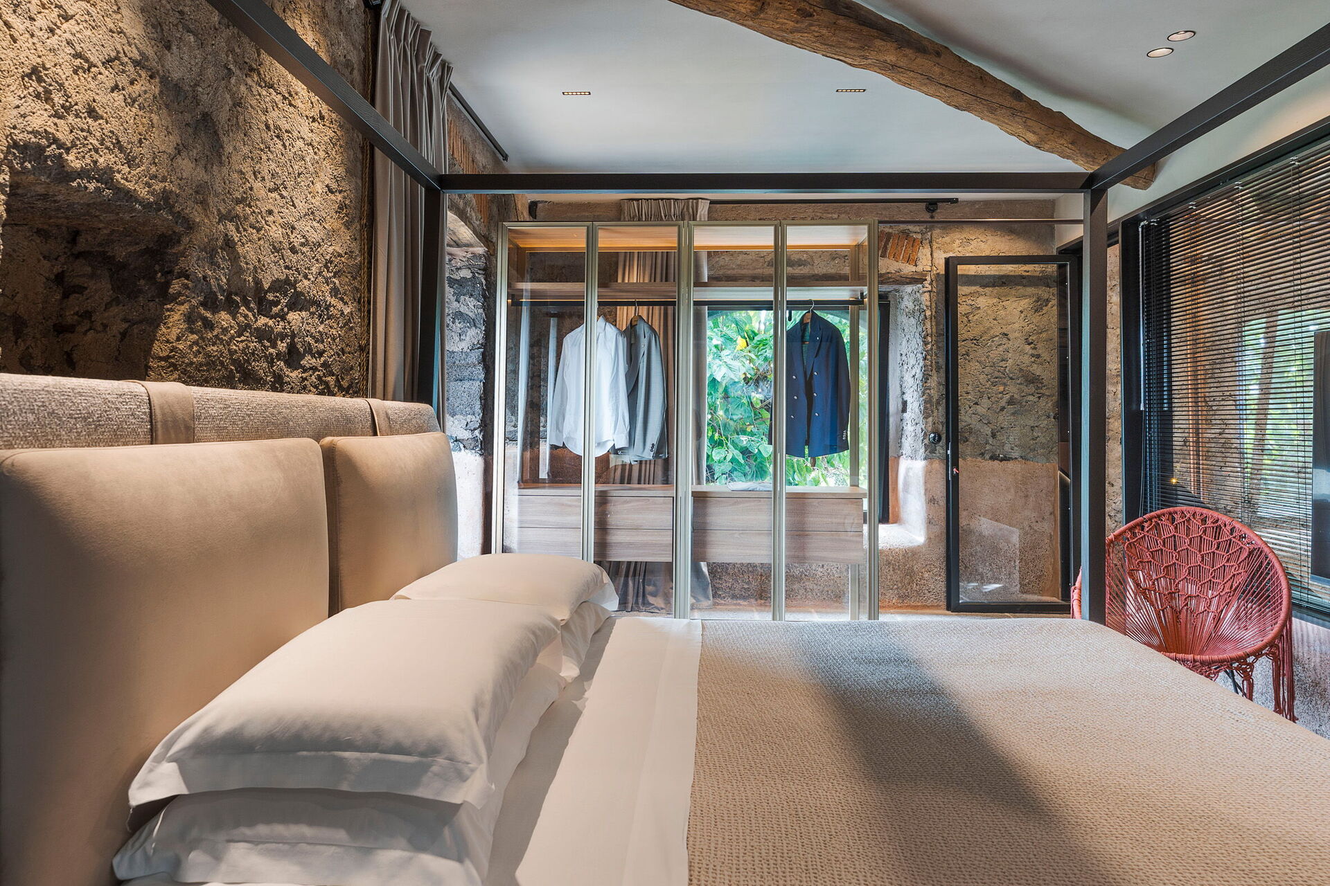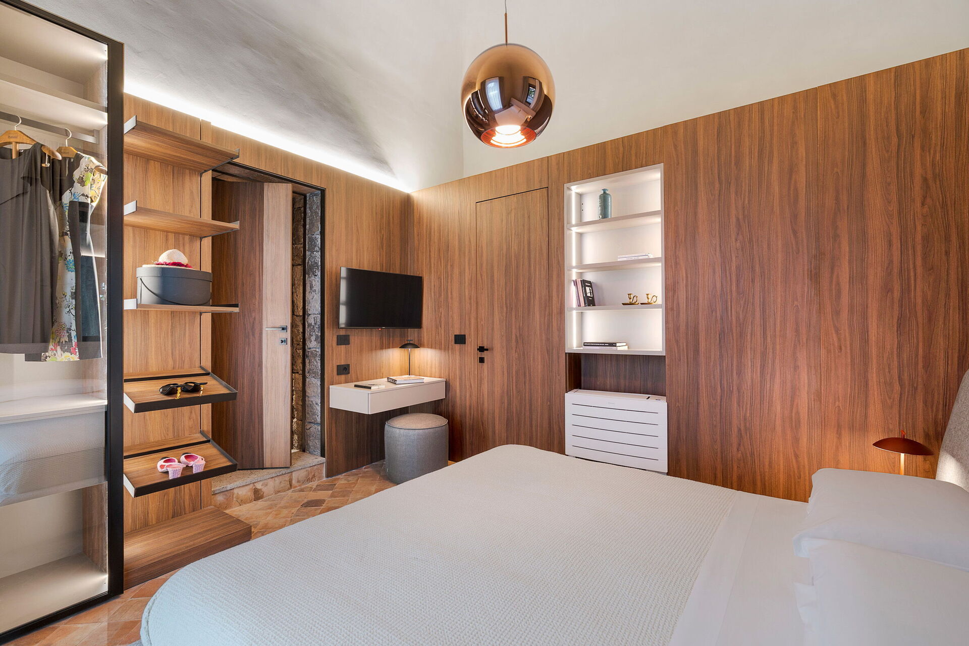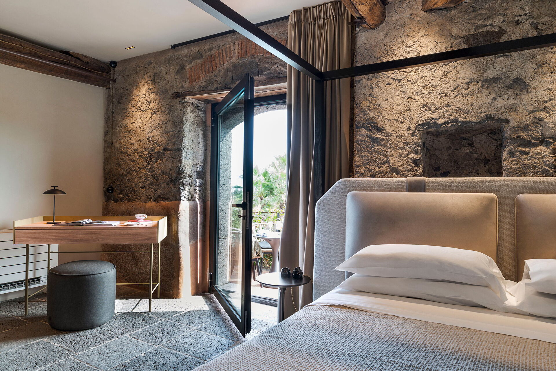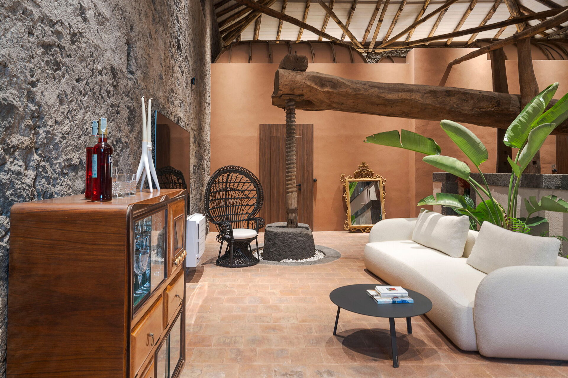 Gli interni e tutti gli ambienti hanno un grande fascino e sono arredati con gusto e cura dei particolari. Il grigio della pietra e il colore del legno sono il filo conduttore della mobilia interna ed esterna. La tradizionale architettura siciliana è rievocata in ogni spazio: travi ai soffitti, scale in pietra e grandi archi mattonati che coronano i muri o separano le varie zone.