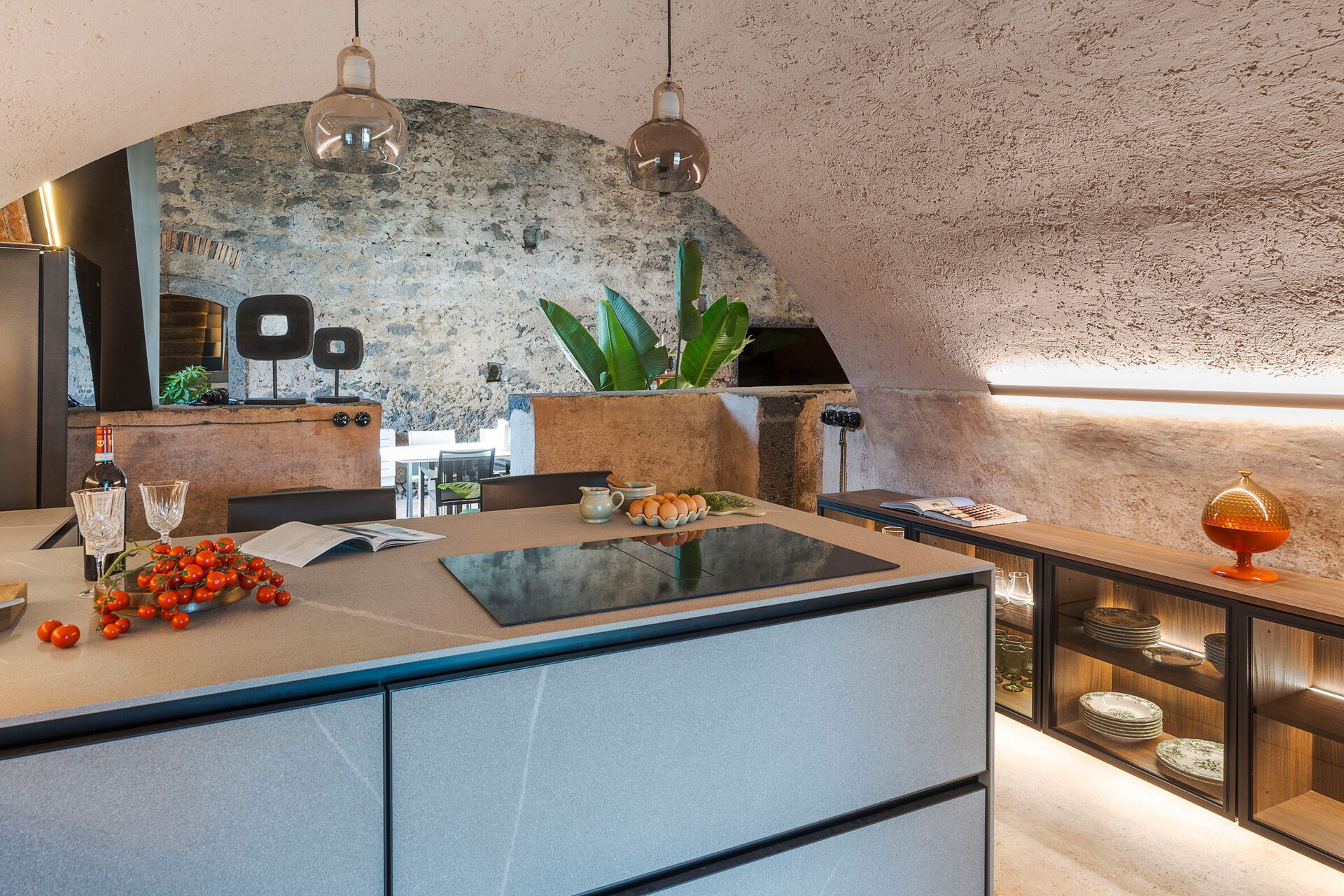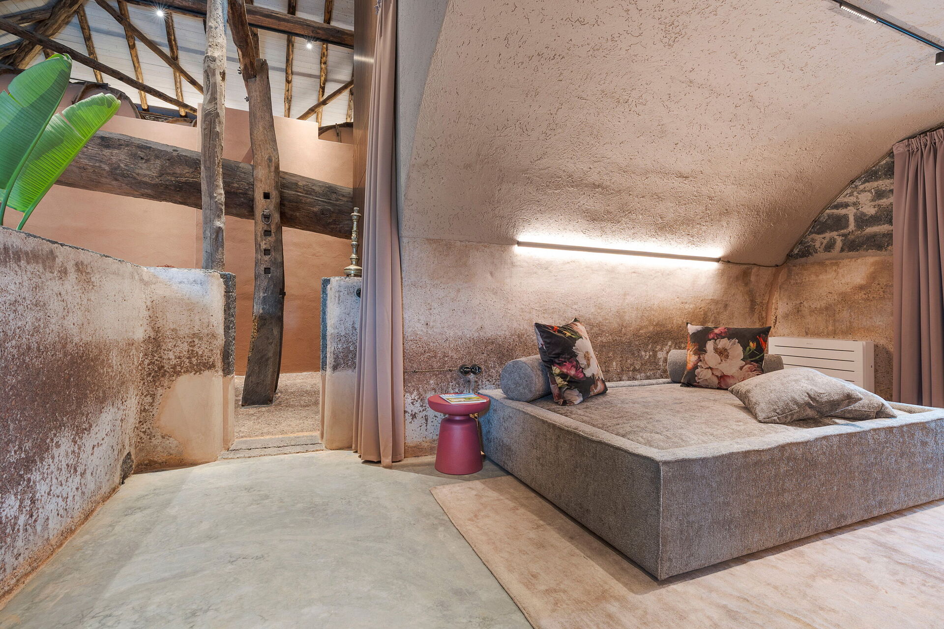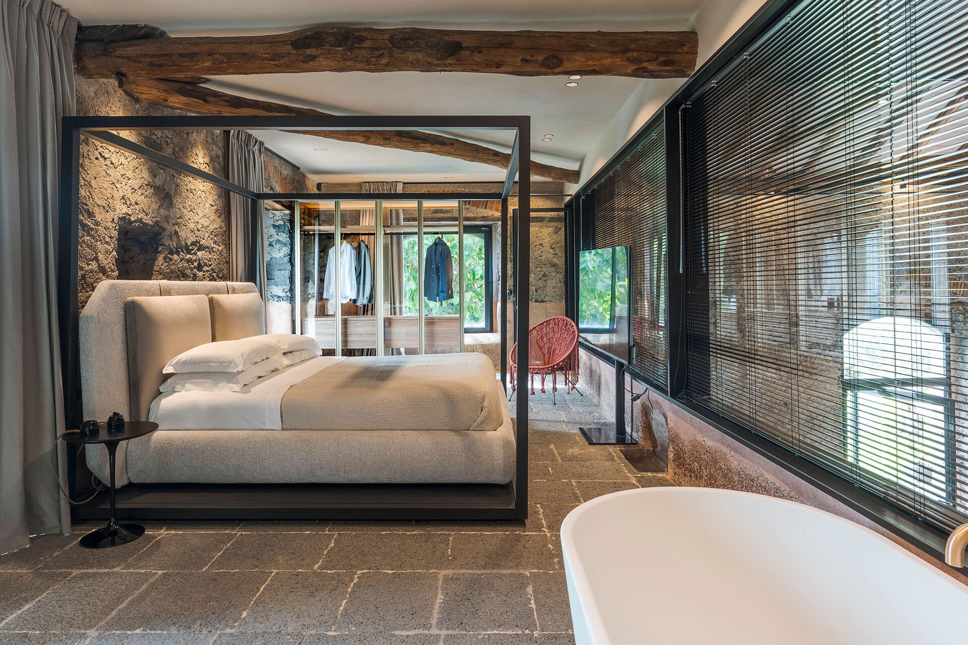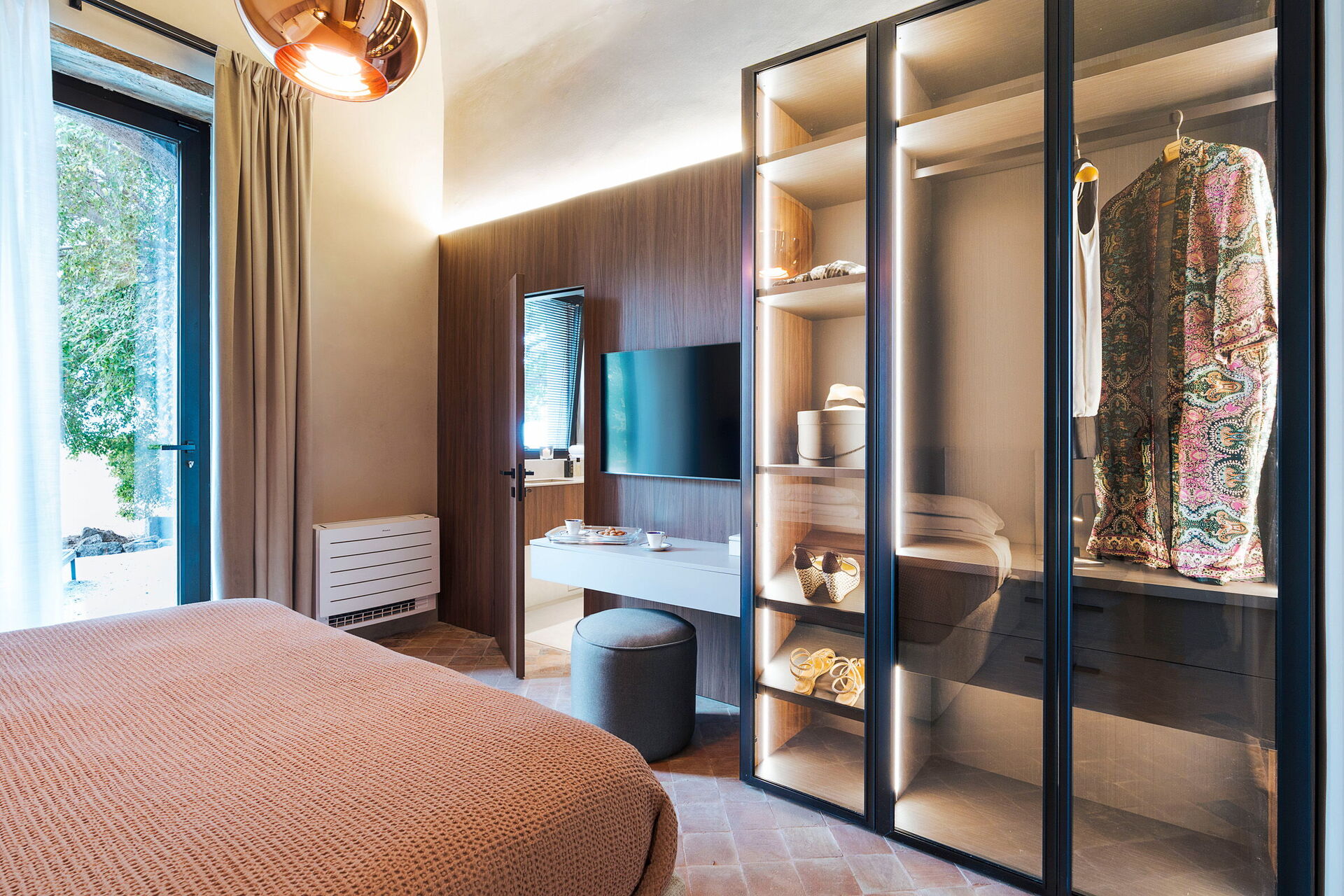 Gli interni e tutti gli ambienti hanno un grande fascino e sono arredati con gusto e cura dei particolari. Il grigio della pietra e il colore del legno sono il filo conduttore della mobilia interna ed esterna. La tradizionale architettura siciliana è rievocata in ogni spazio: travi ai soffitti, scale in pietra e grandi archi mattonati che coronano i muri o separano le varie zone.