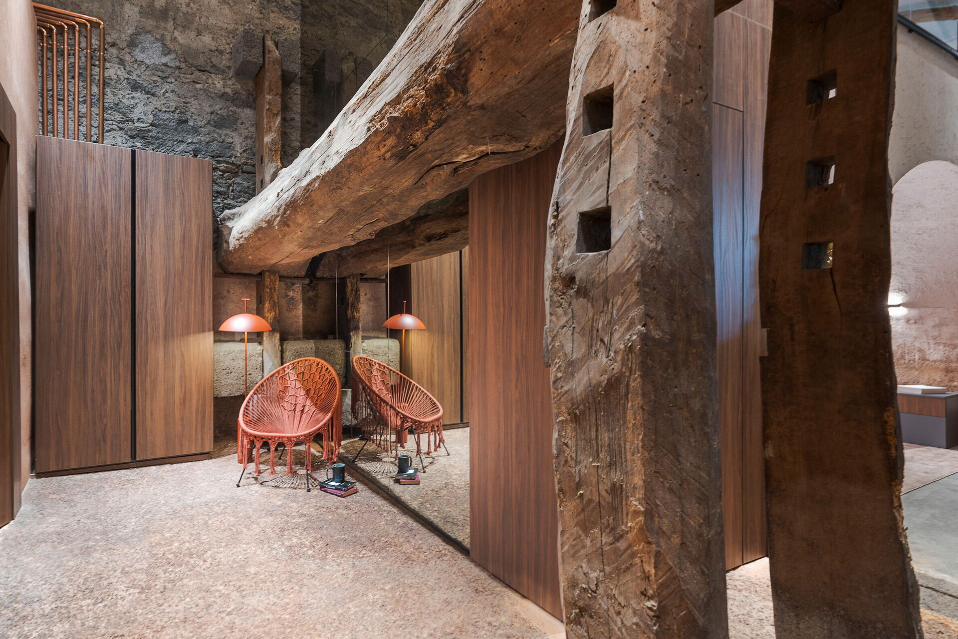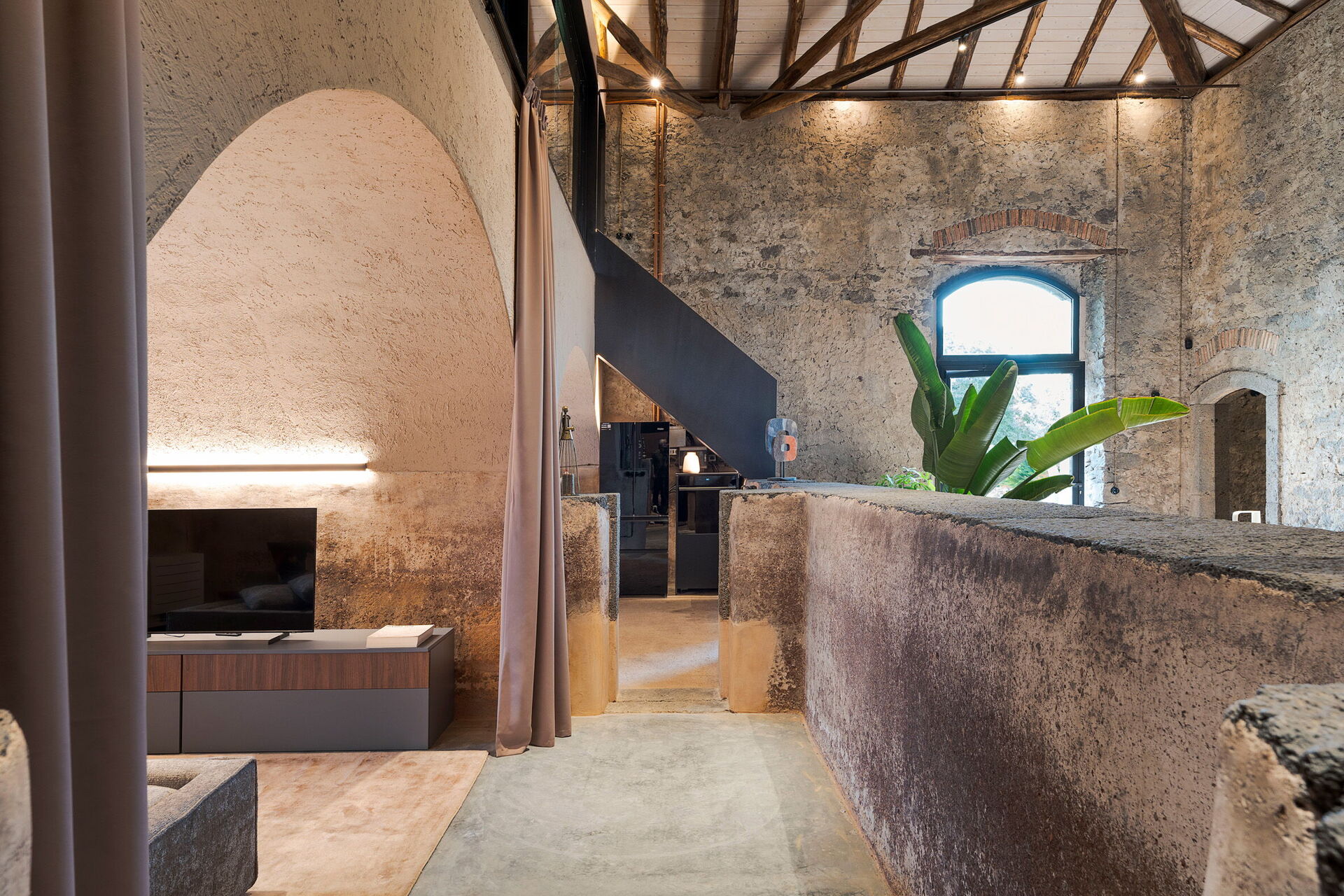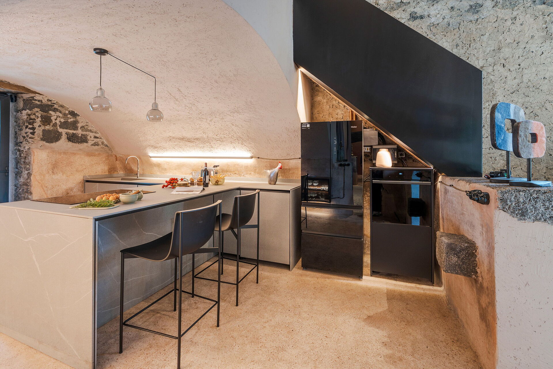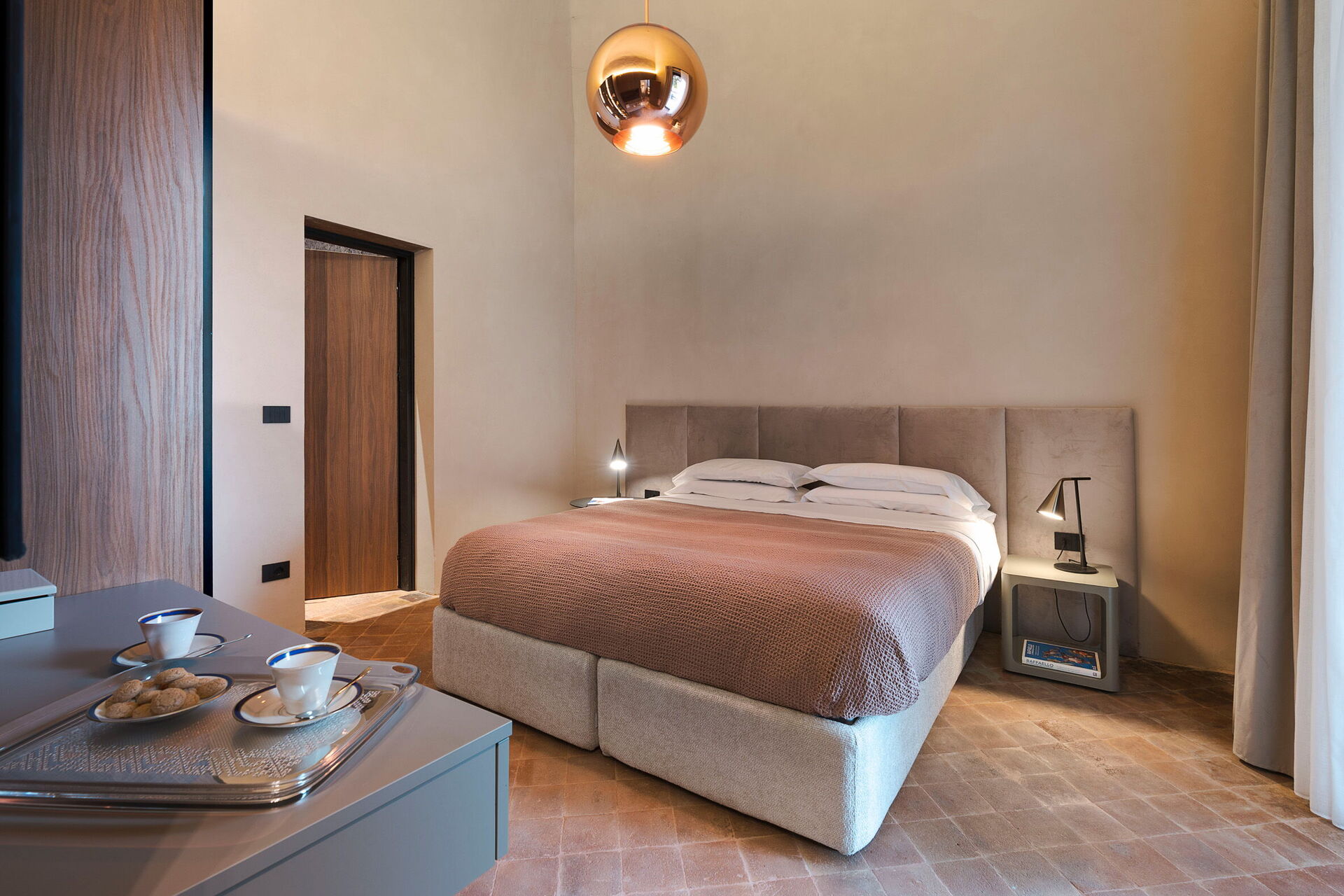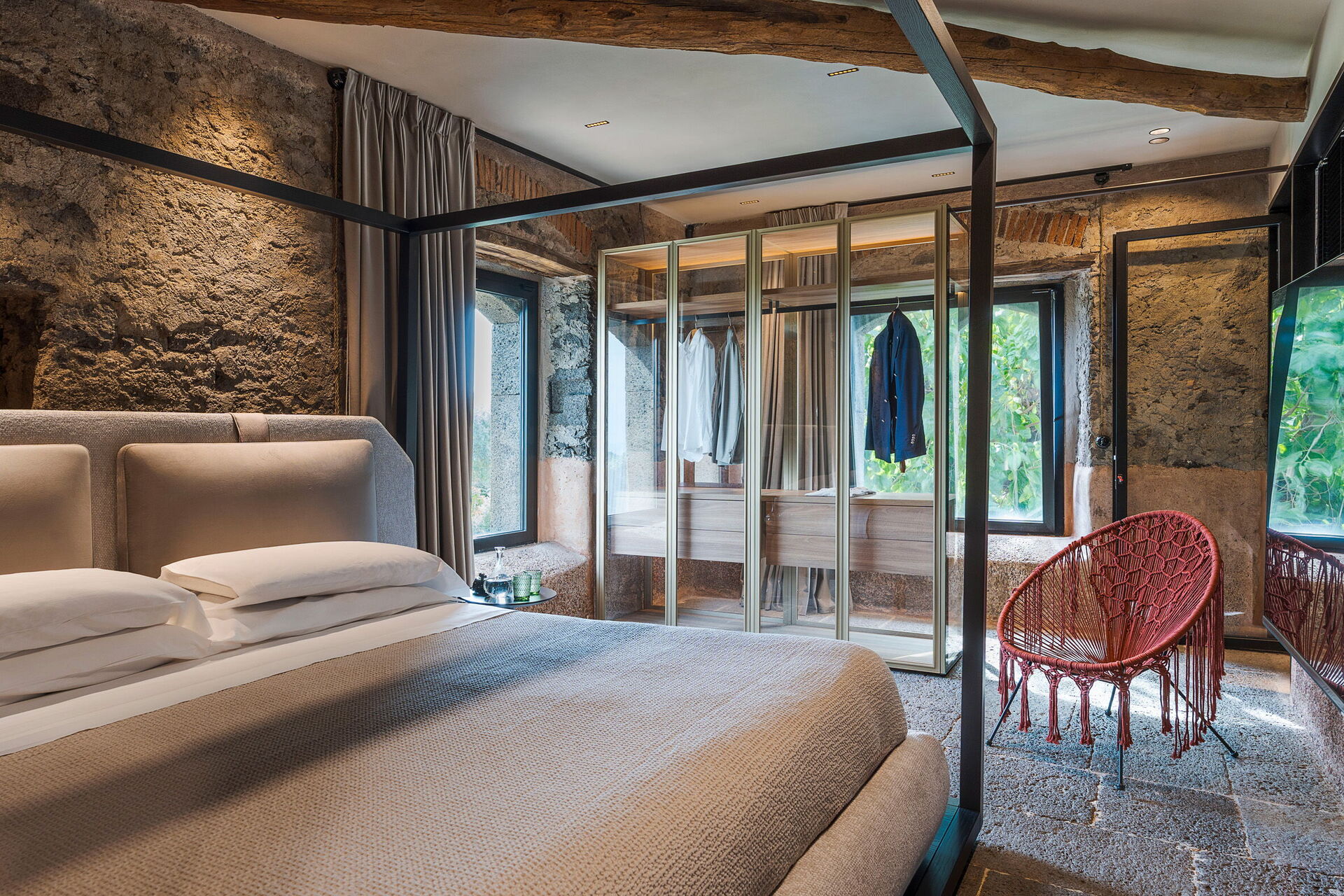 Gli interni e tutti gli ambienti hanno un grande fascino e sono arredati con gusto e cura dei particolari. Il grigio della pietra e il colore del legno sono il filo conduttore della mobilia interna ed esterna. La tradizionale architettura siciliana è rievocata in ogni spazio: travi ai soffitti, scale in pietra e grandi archi mattonati che coronano i muri o separano le varie zone.