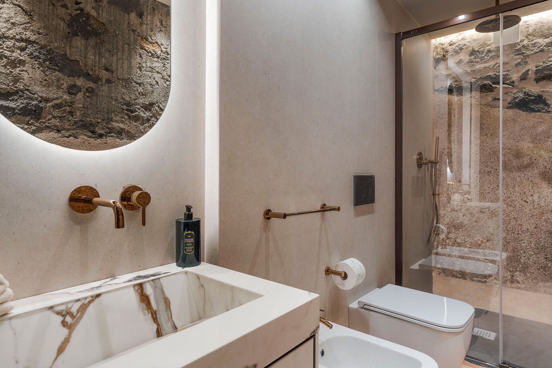 Primo piano (ricavato in un soppalco, accessibile sia dall’interno della casa sia dall'esterno): camera matrimoniale (misure del letto: 180 x 200 cm; zanzariera) con bagno privato con vasca e con doccia.