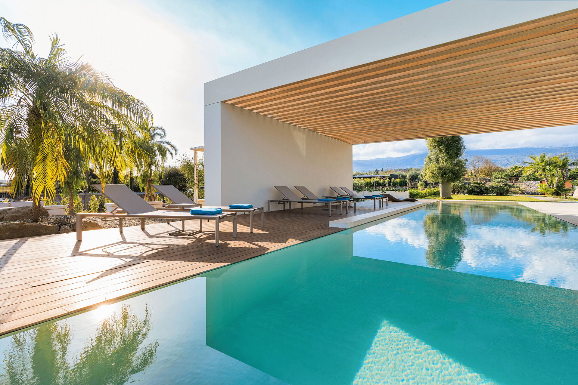 Moderna e lussuosa, questa esclusiva villa per vacanze gode di una scenografica posizione panoramica con vista mozzafiato che spazia dall’ Etna fino a Taormina, che è possibile ammirare sia dalla piscina che dalle sue ampie terrazze e dal giardino.