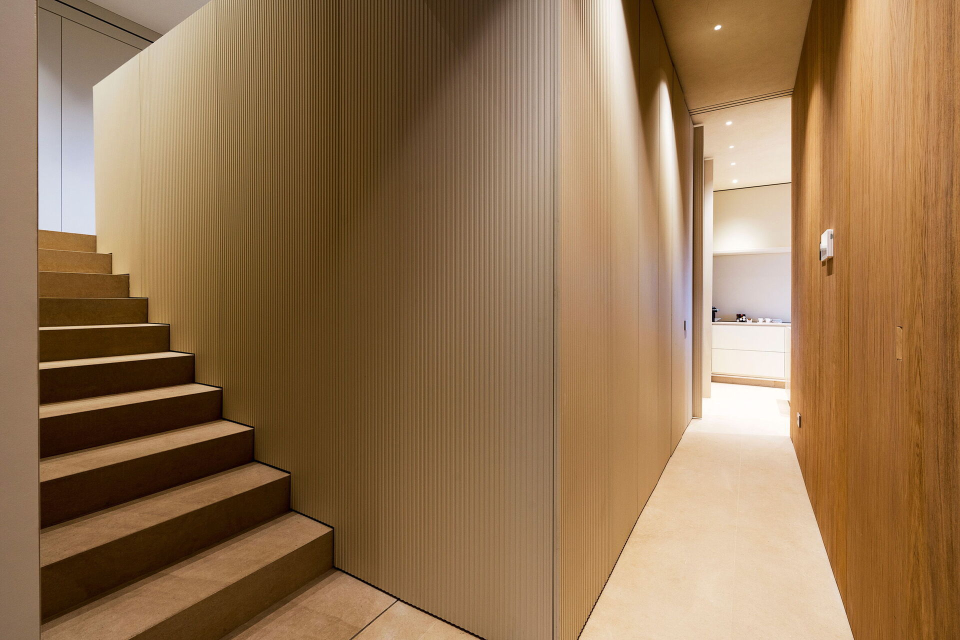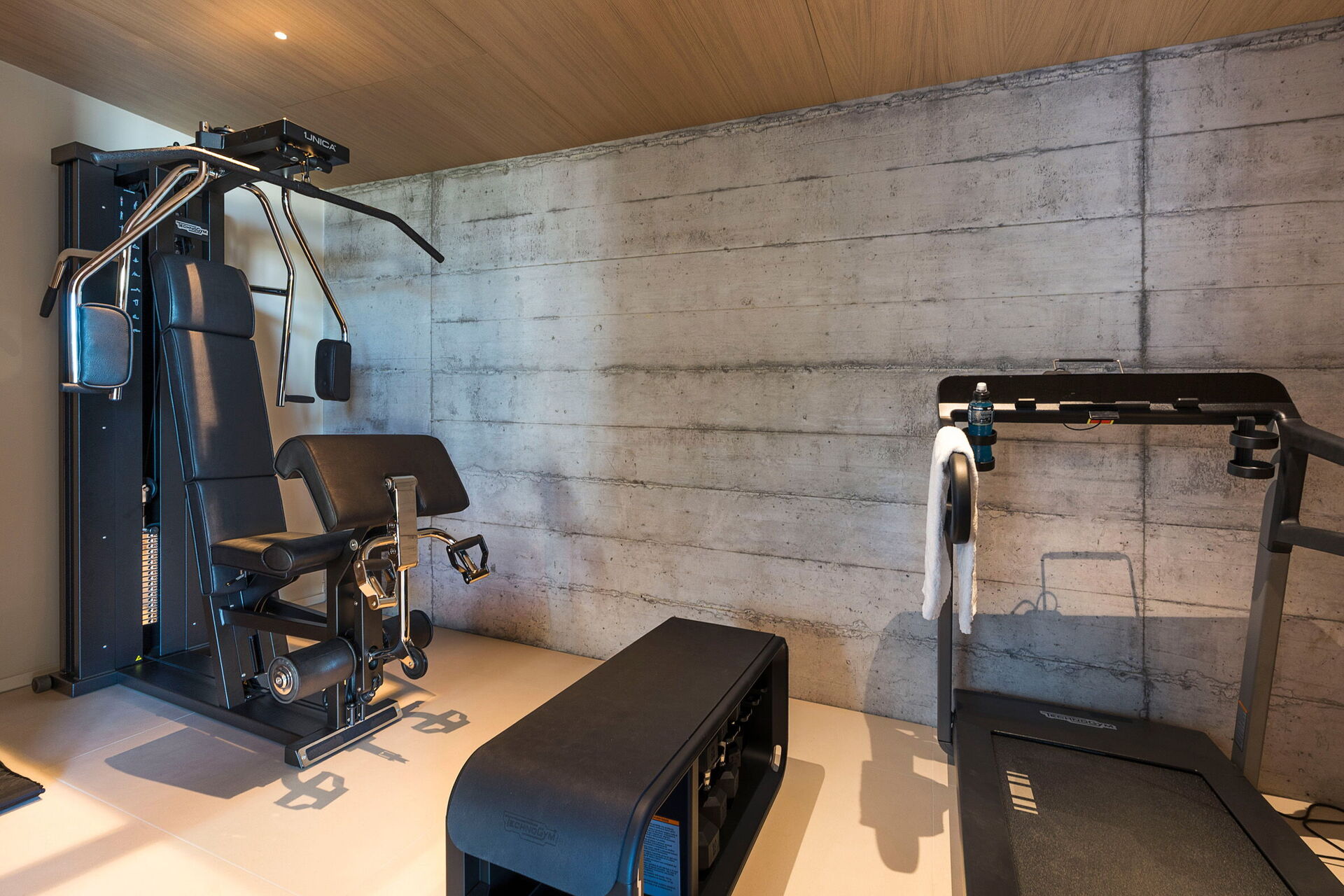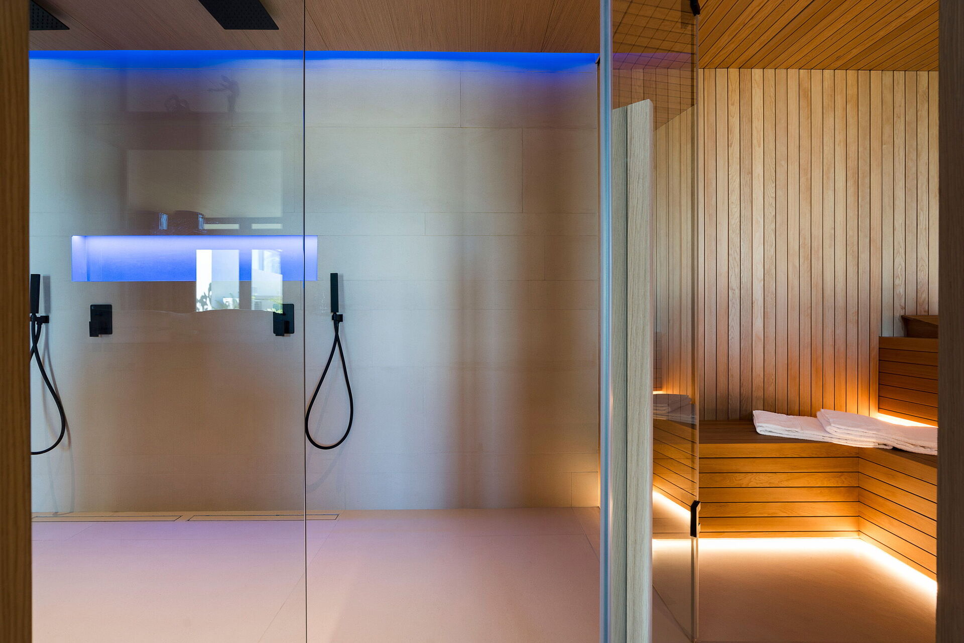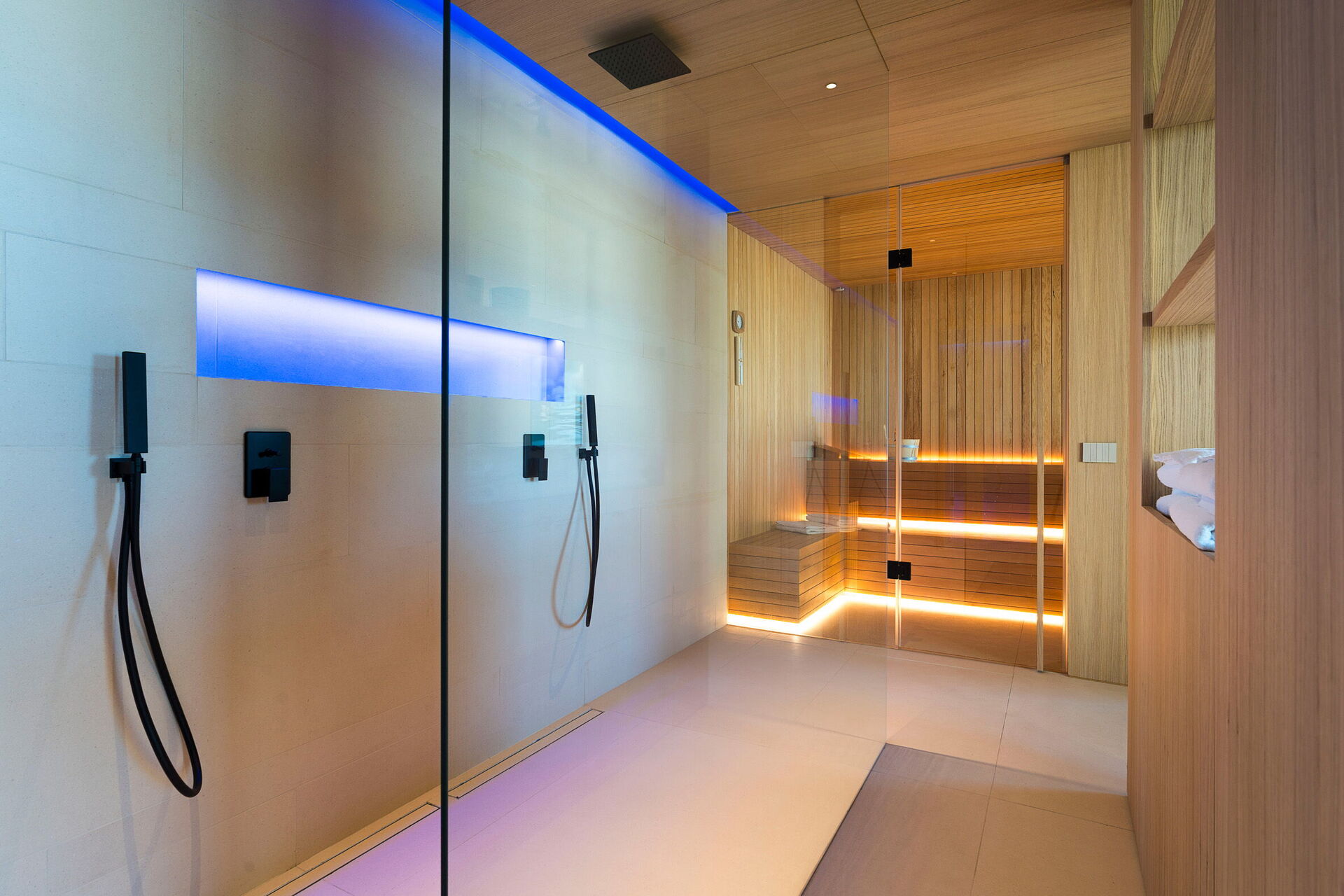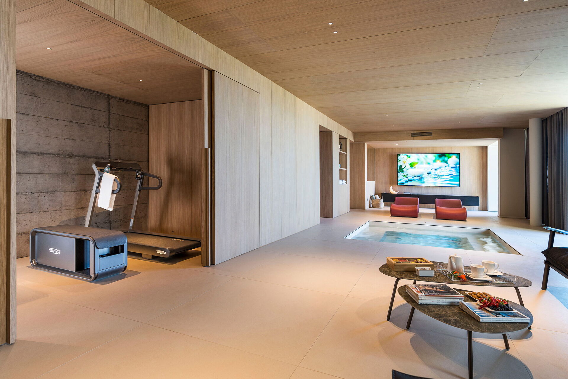 Piano inferiore: camera matrimoniale (misure del letto: 180 x 200 cm, frigo bar) e con bagno privato con doccia, area fitness e zona benessere con vasca idromassaggio (2.70 x 2.70 metri; profondità minima: 0,40 metri; profondità massima: 0.90 metri); riscaldata a 28°; 8 posti), sauna, bagno turco, doccia emozionale e wc, cantina.