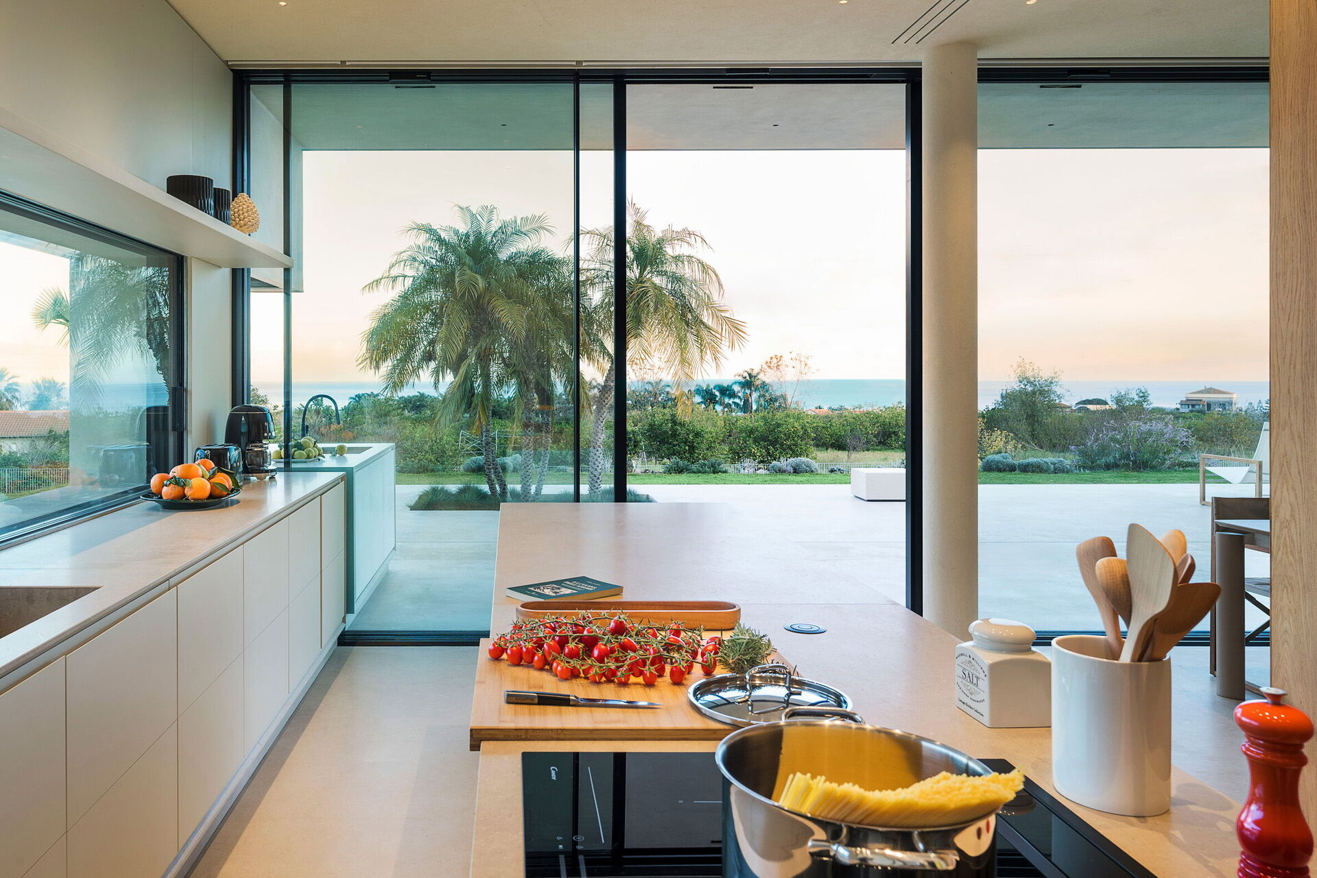 Piano terreno rialzato: ampia e luminosa zona giorno con grandi vetrate composta da soggiorno (smart TV) con zona pranzo con accesso sull’esterno, cucina (piano cottura, forno, frigorifero, freezer, lavastoviglie, microonde, tostapane, macchina da caffè espresso, macchina da caffè americano, tostapane), wc, lavanderia.