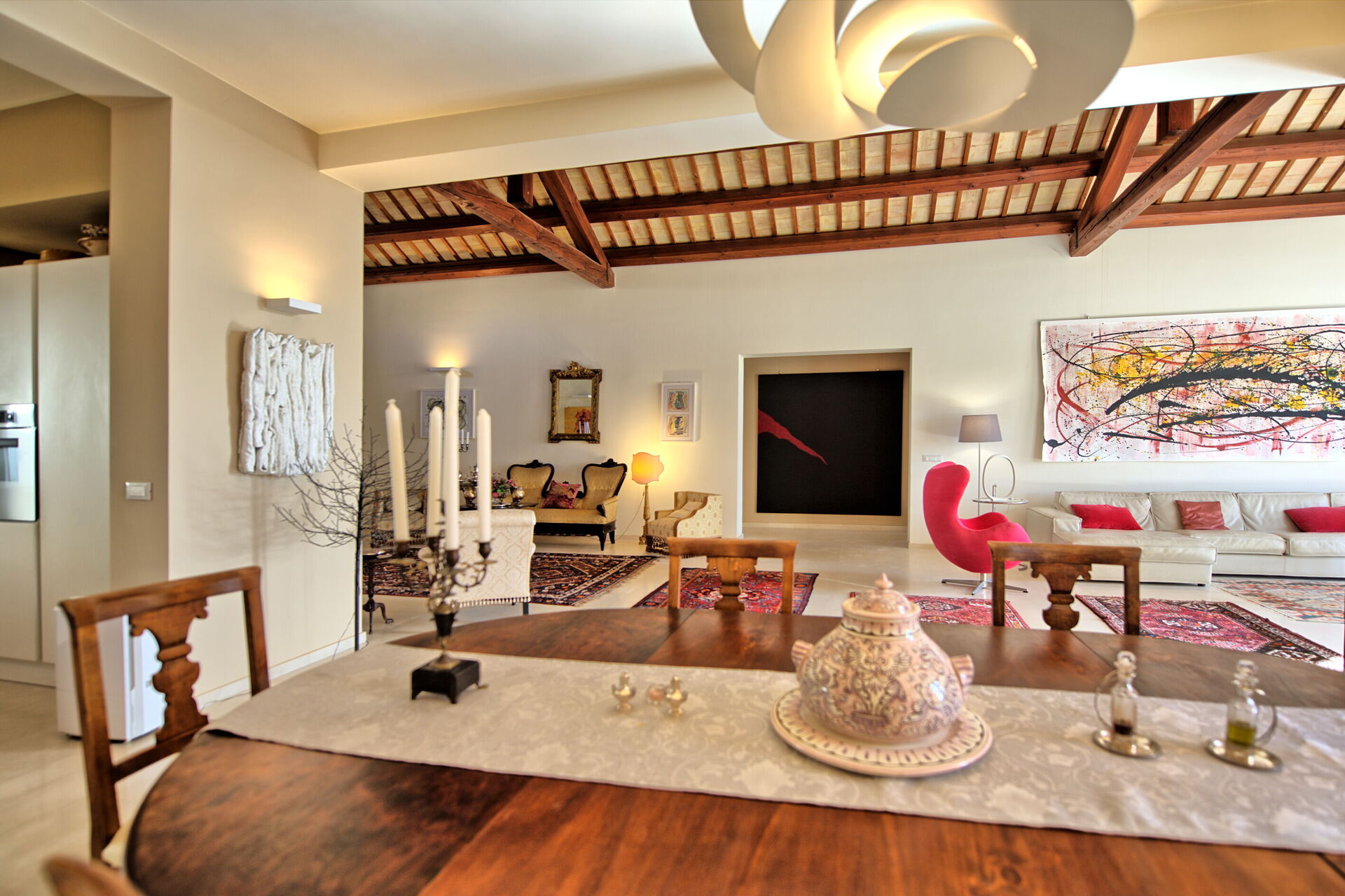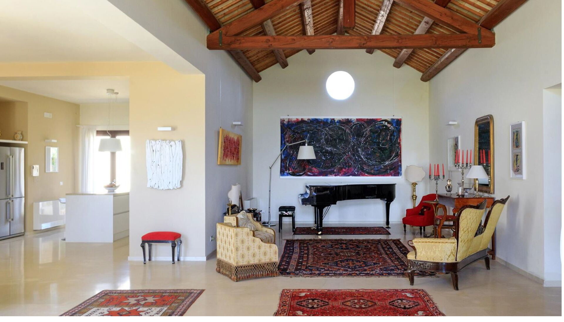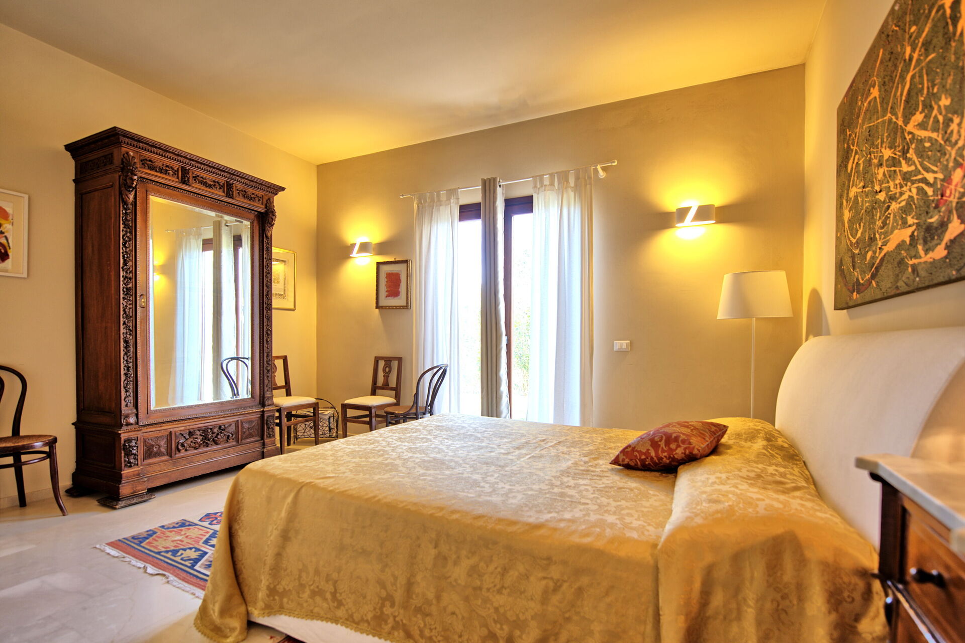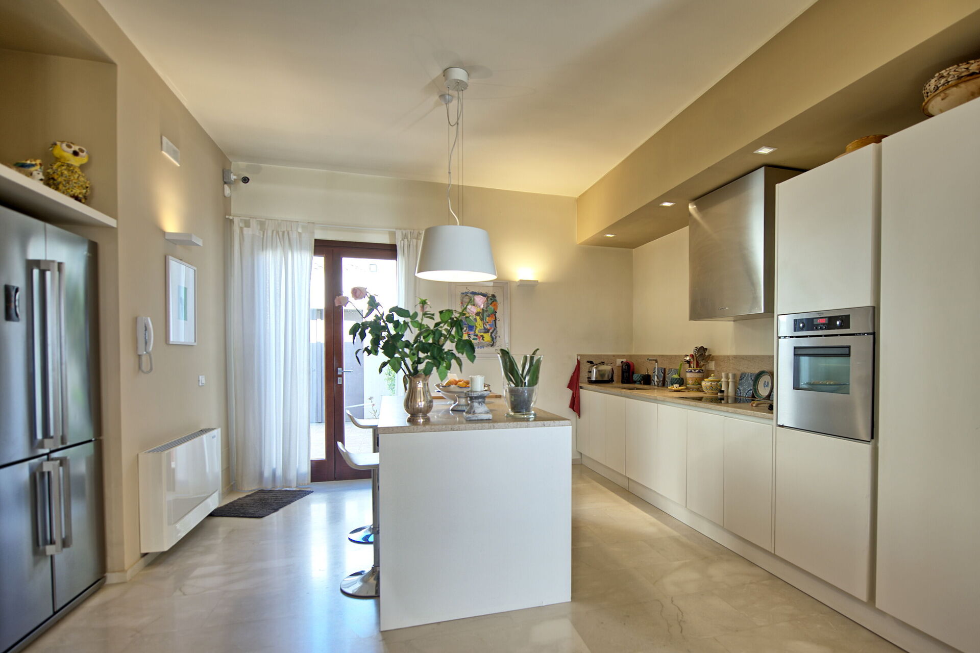 Circondata da un curato e rigoglioso giardino dispone di accoglienti ambienti interni arredati con eleganza e cura dei particolari con opere d’arte moderna, pavimenti in marmo, mobili moderni e illuminazione di design, in una piacevole combinazione di stili.