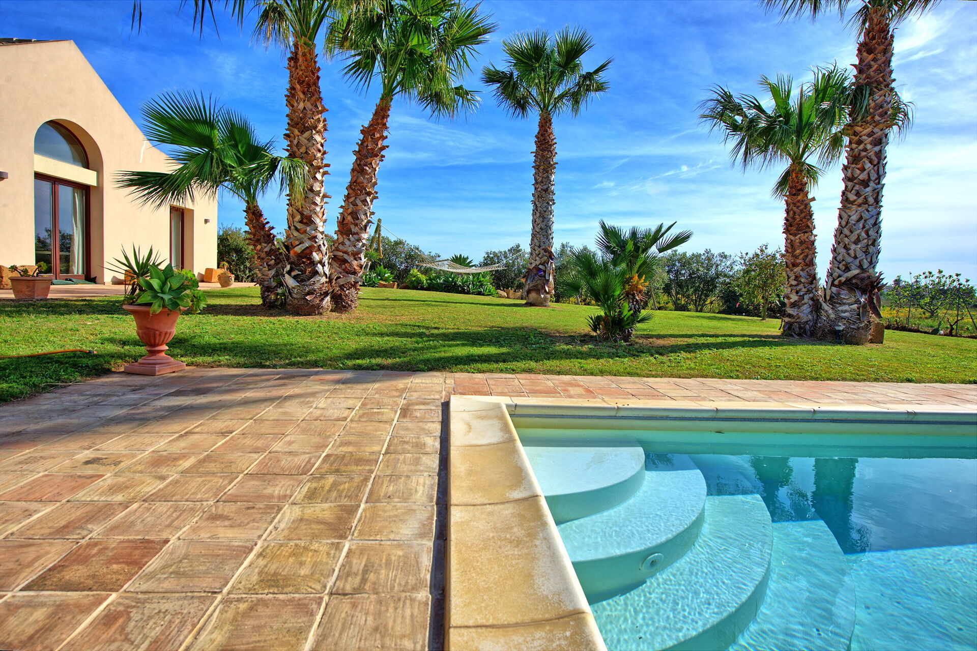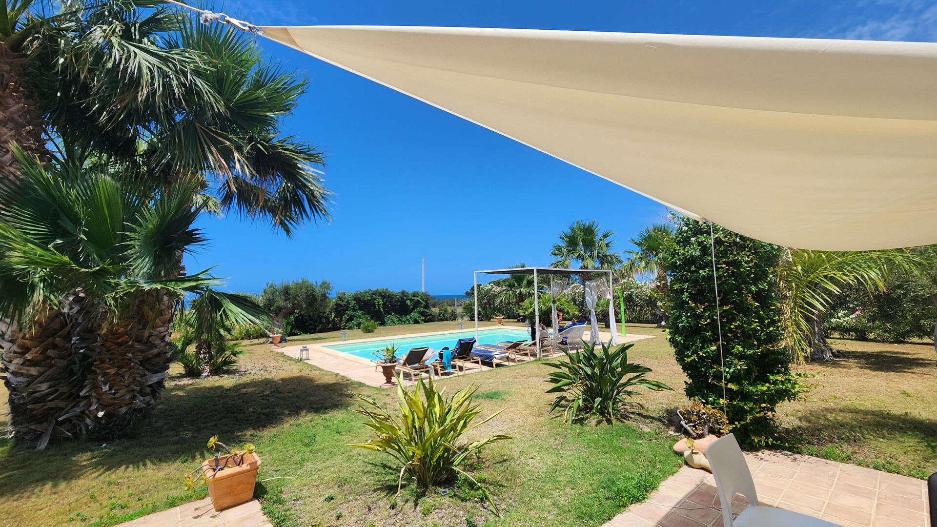 Le panoramiche zone esterne offrono numerose aree comuni che permettono agli ospiti di trascorrere un piacevole soggiorno in famiglia o tra amici rilassandosi nel patio attrezzato per mangiare all’aperto o nell’ ampia zona piscina ideale per trascorrere indimenticabili momenti sotto il sole della Sicilia.