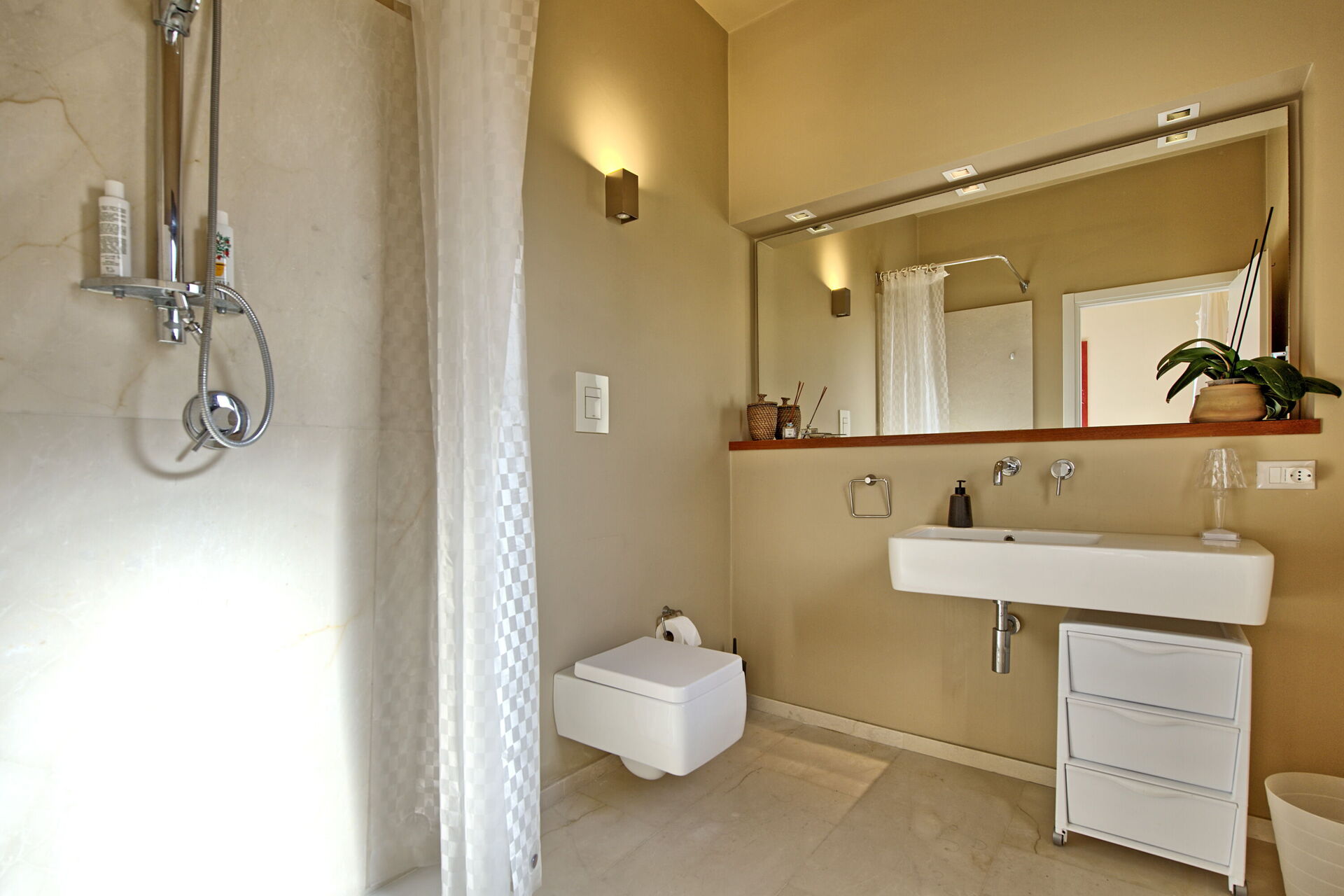 Primo piano: camera matrimoniale con bagno privato con doccia e accesso su terrazza panoramica.