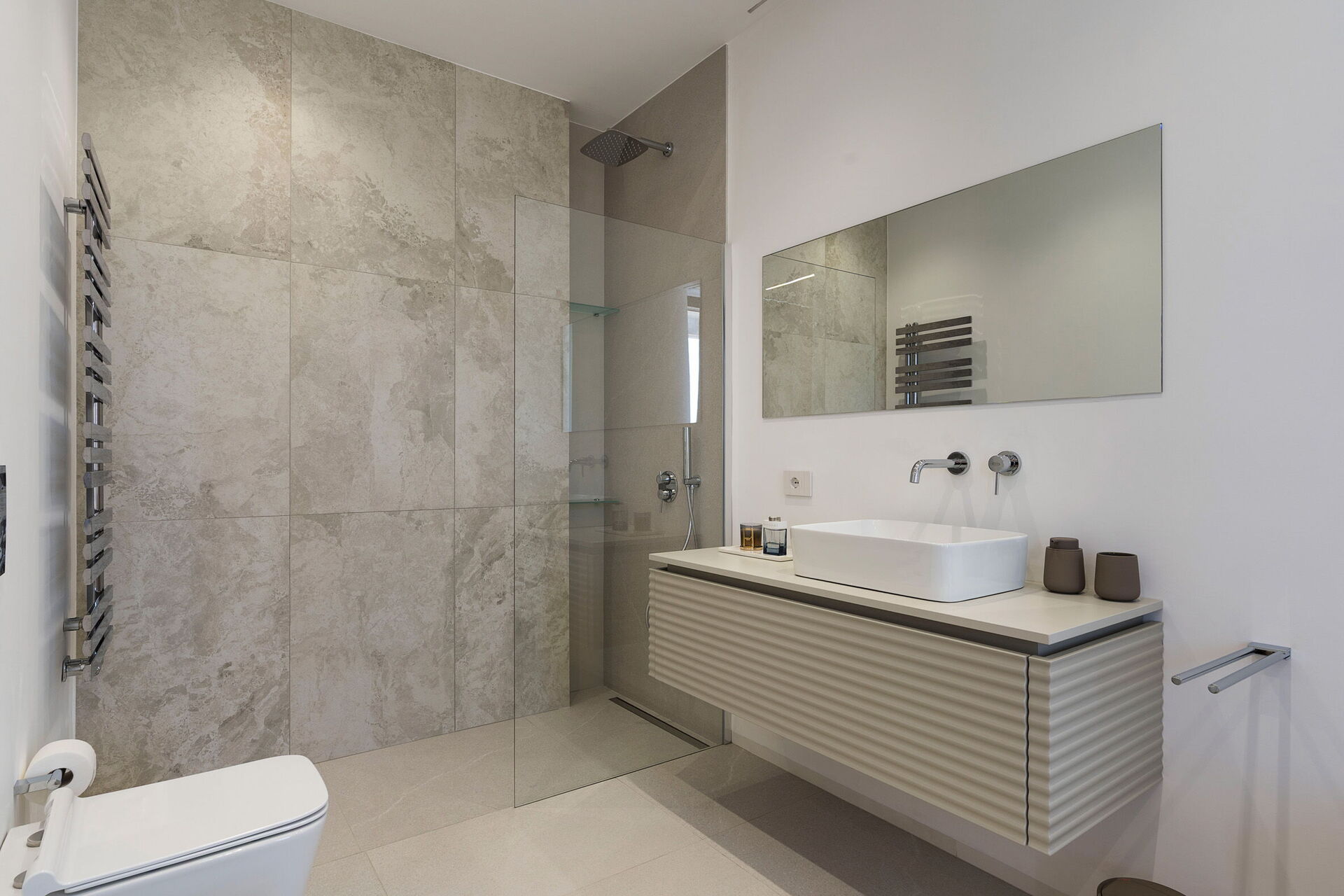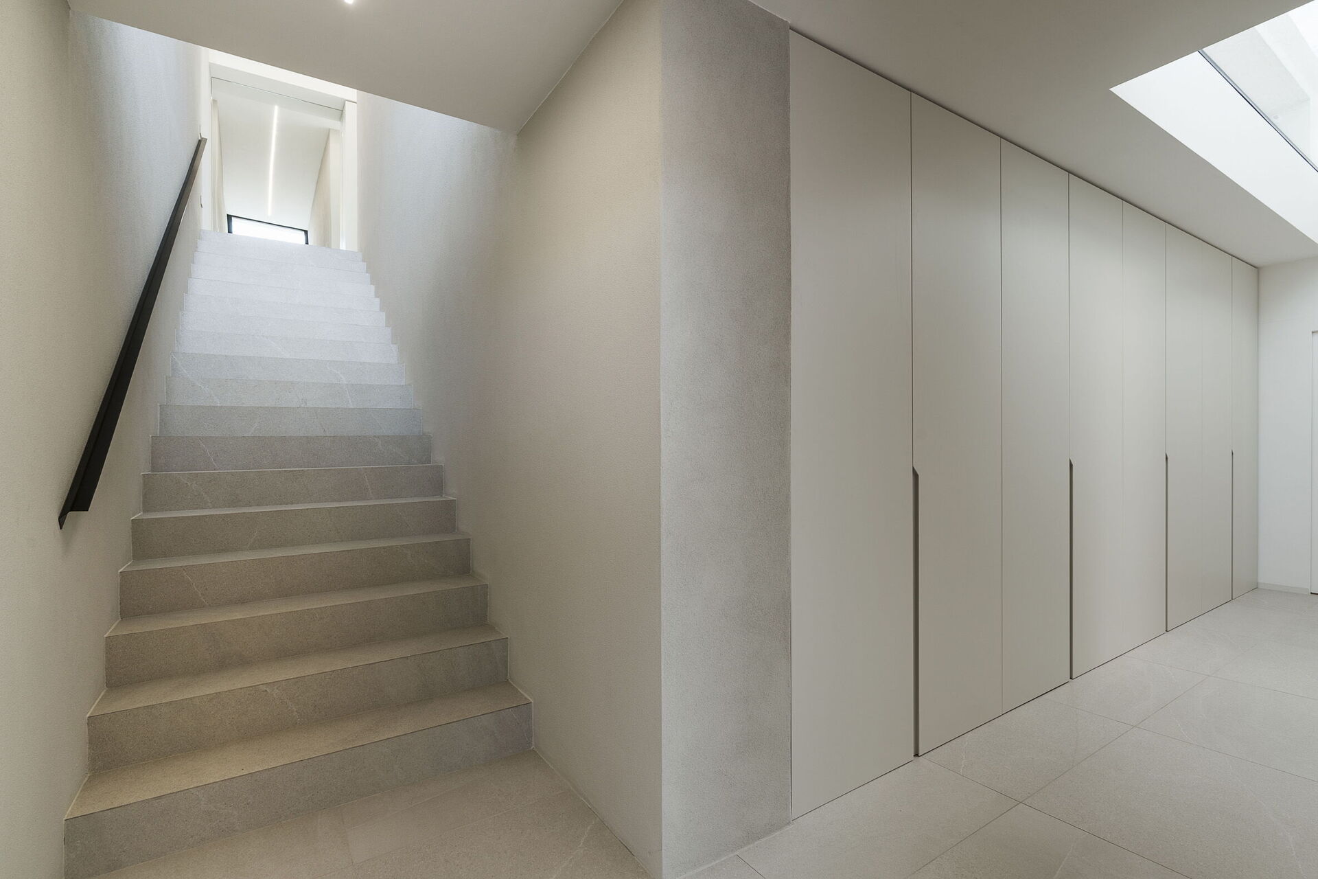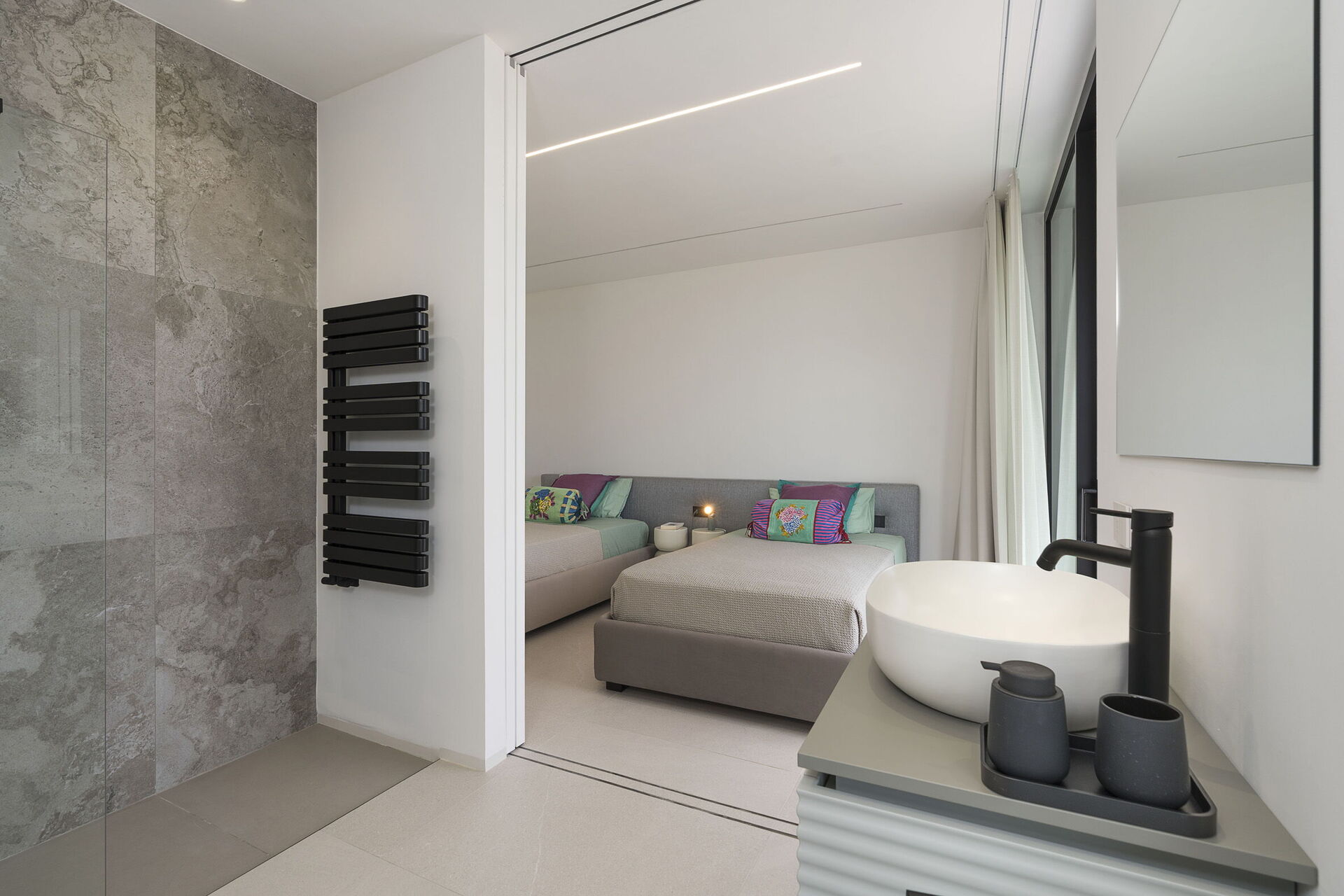 Piano inferiore: 2 camere matrimoniali (misure del letto: 180 x 200 cm) con cabina armadio e bagno privato con vasca e con doccia, 1 camera con 2 letti singoli (misure del letto: 120 x 200 cm) con cabina armadio e con bagno privato con doccia.