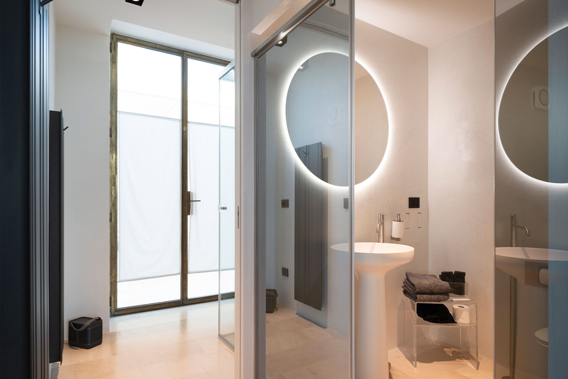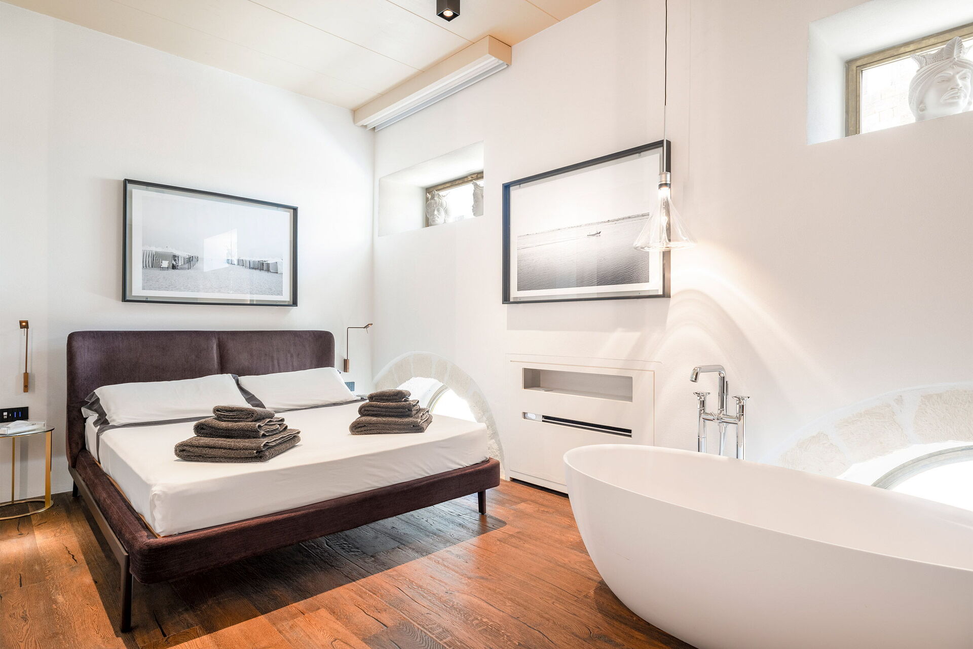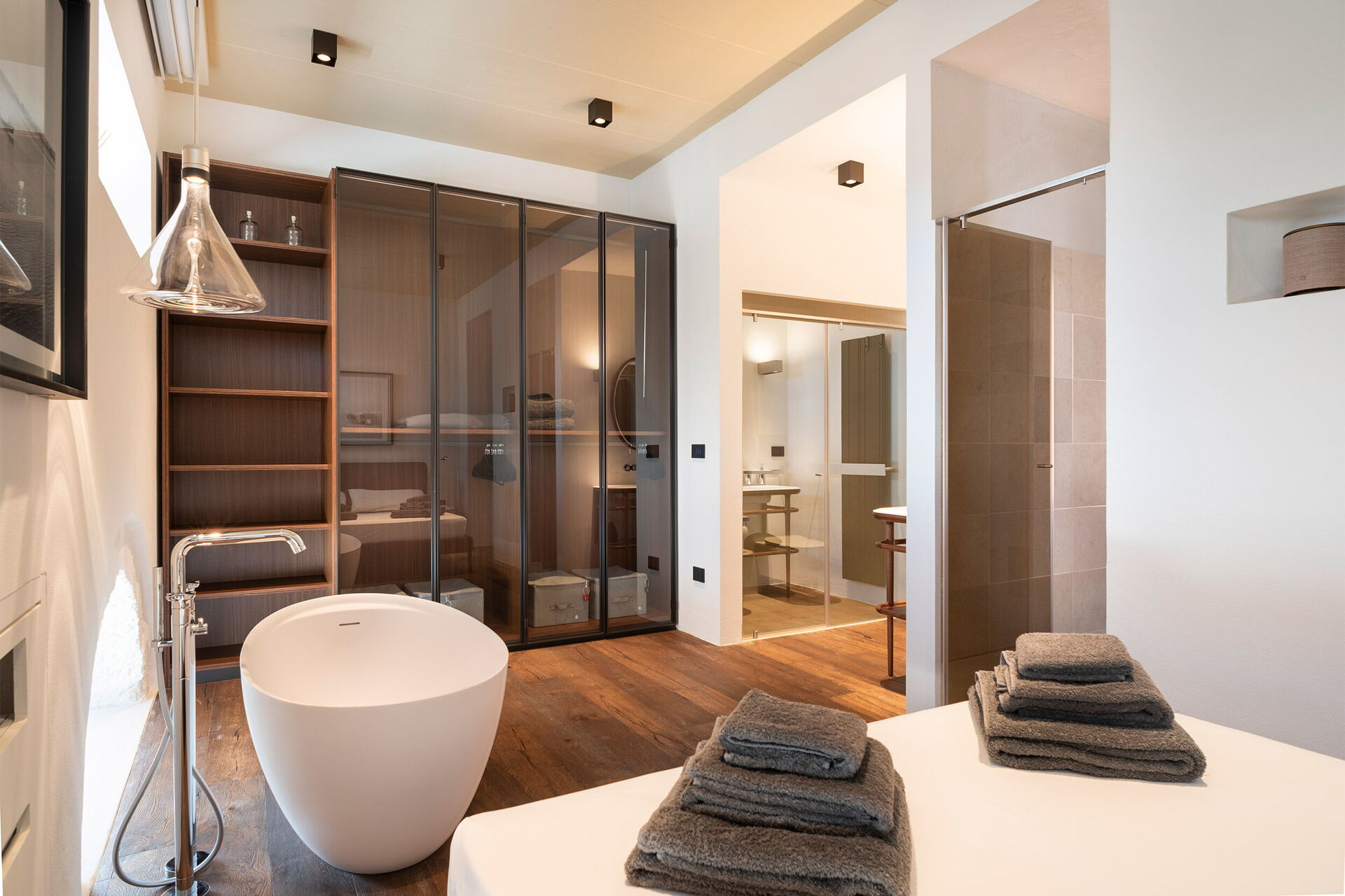 Primo piano: camera matrimoniale (aria condizionata) con vasca da bagno a vista e con bagno privato con doccia con cromoterapia, camera matrimoniale (aria condizionata) con doccia con cromoterapia e con bagno privato con vasca, camera matrimoniale (aria condizionata).