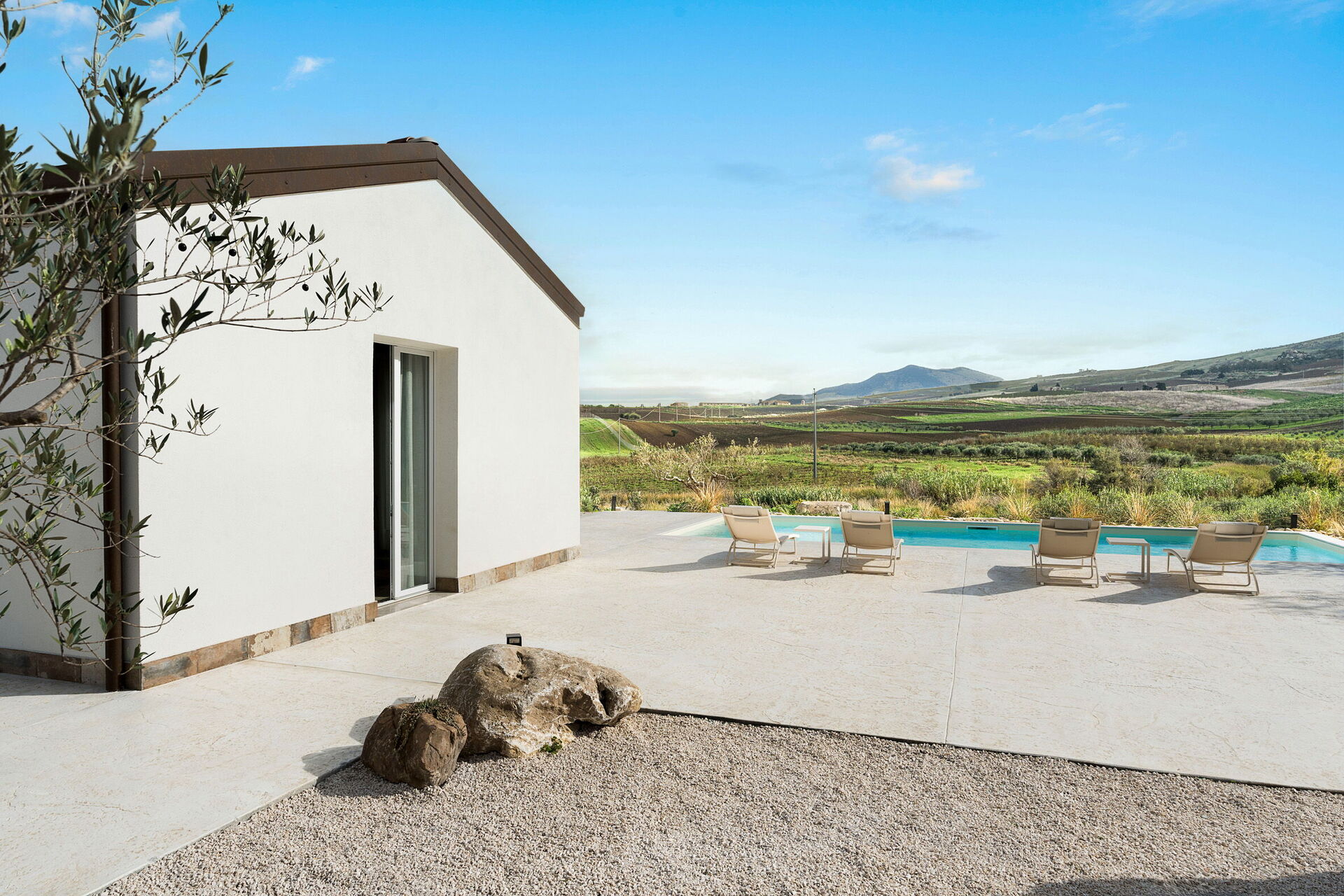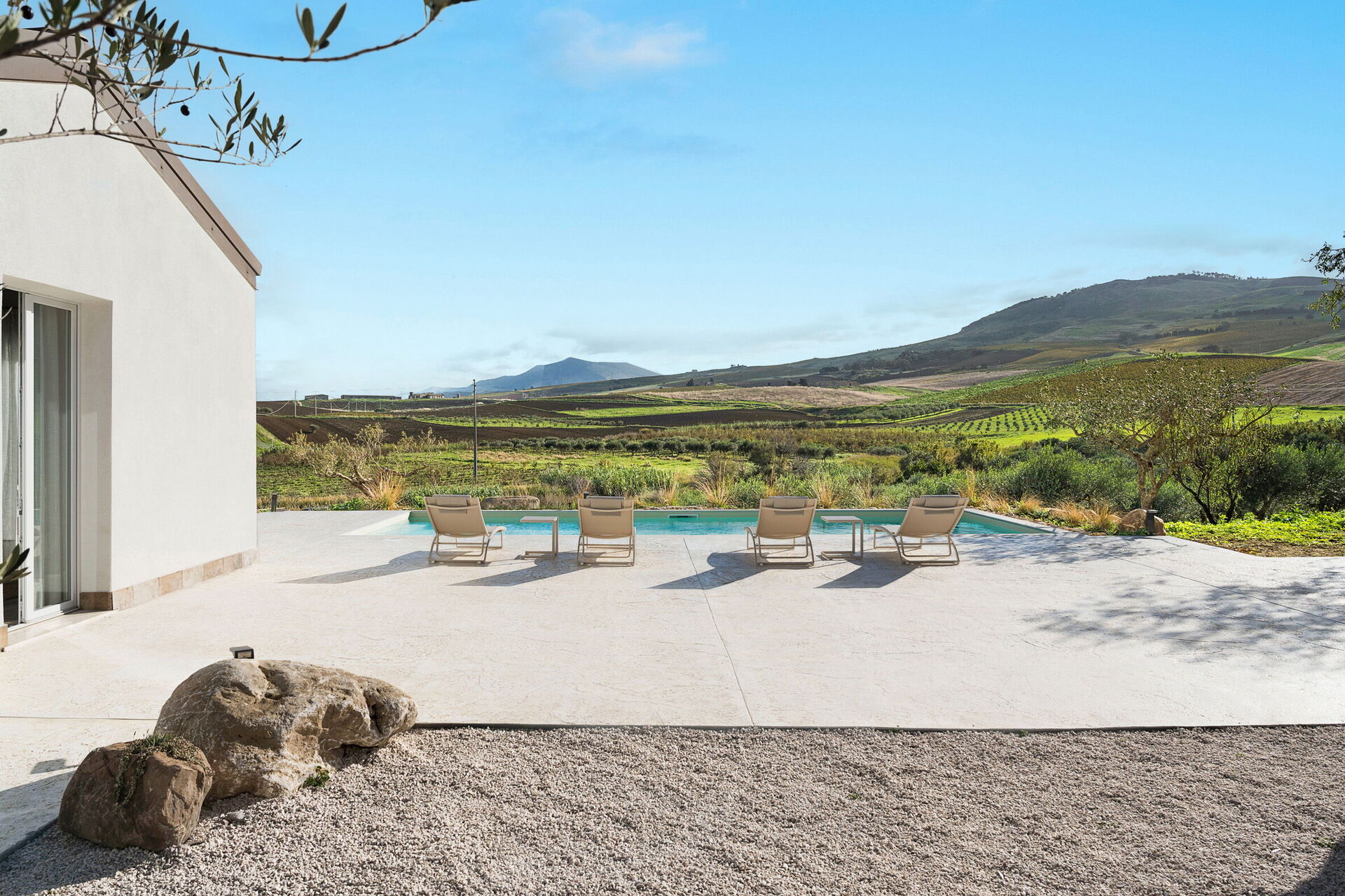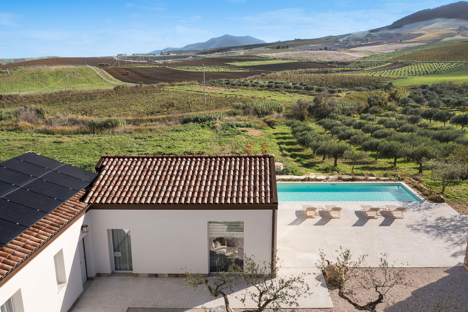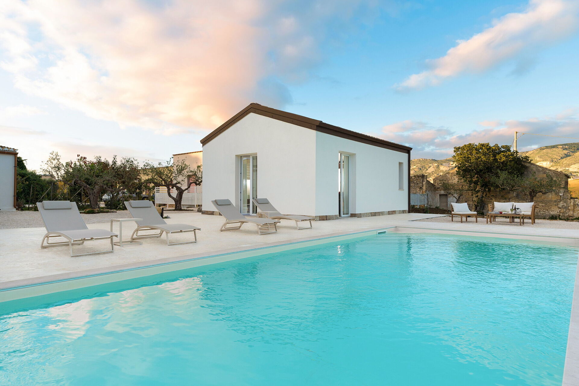 Le panoramiche zone esterne sono il pezzo forte della casa: la piscina ad uso esclusivo degli ospiti, un ben curato patio e il solarium fanno di questa dimora il luogo ideale per rilassarsi e per trovare ristoro nelle soleggiate giornate siciliane.