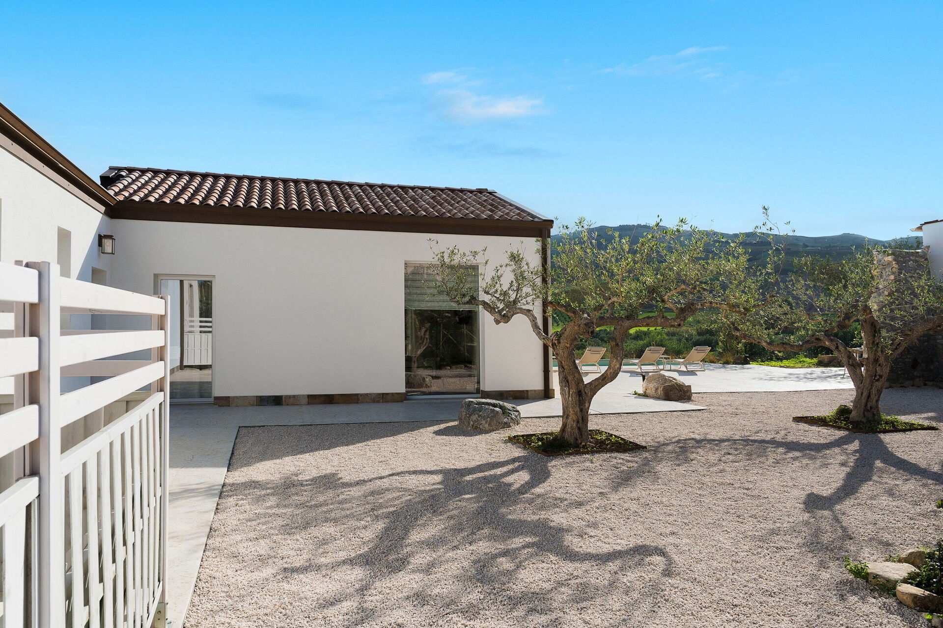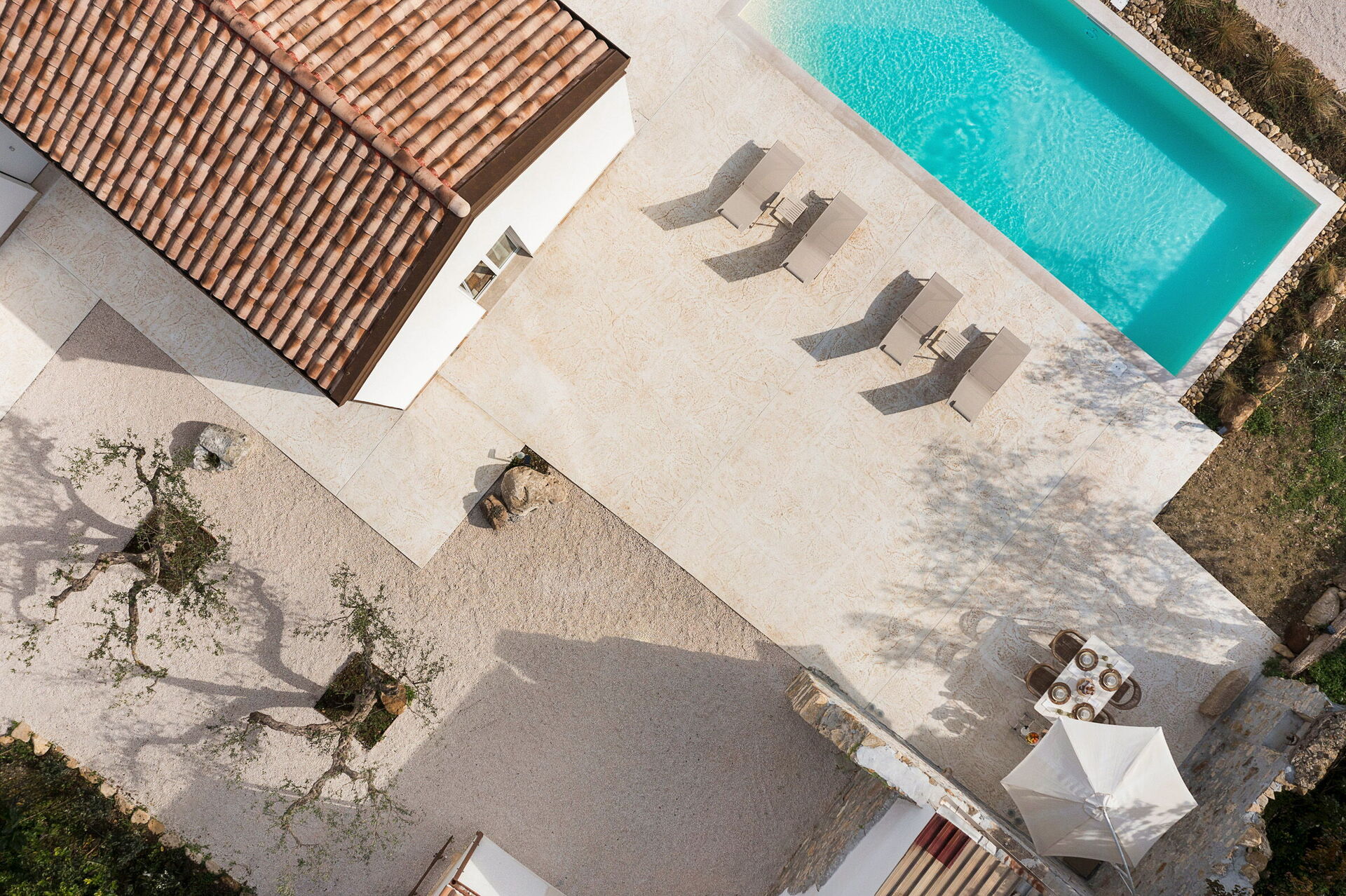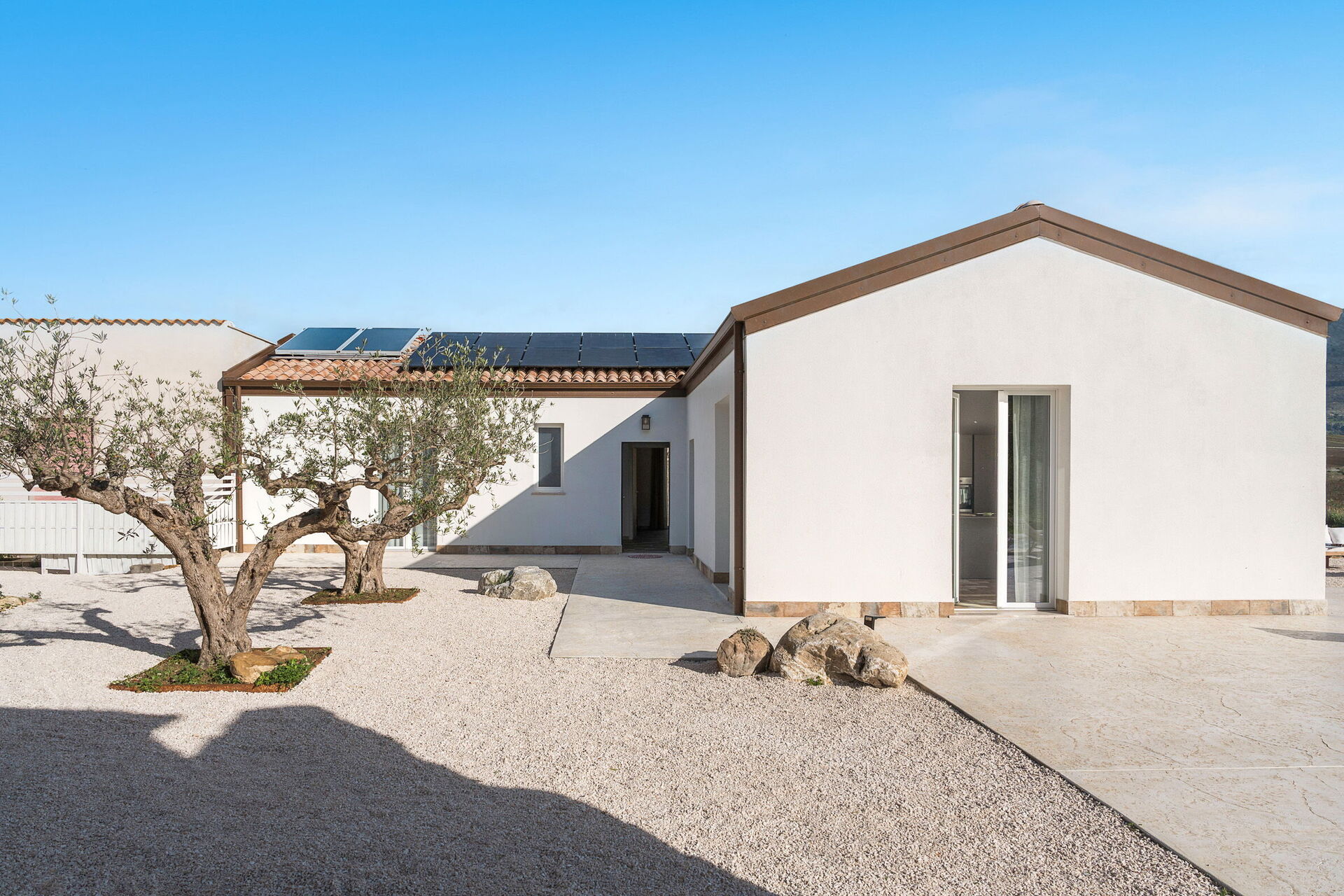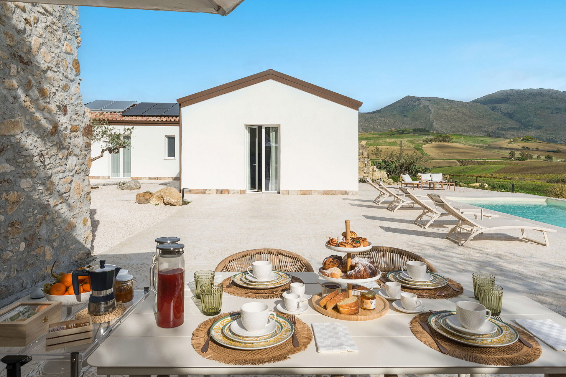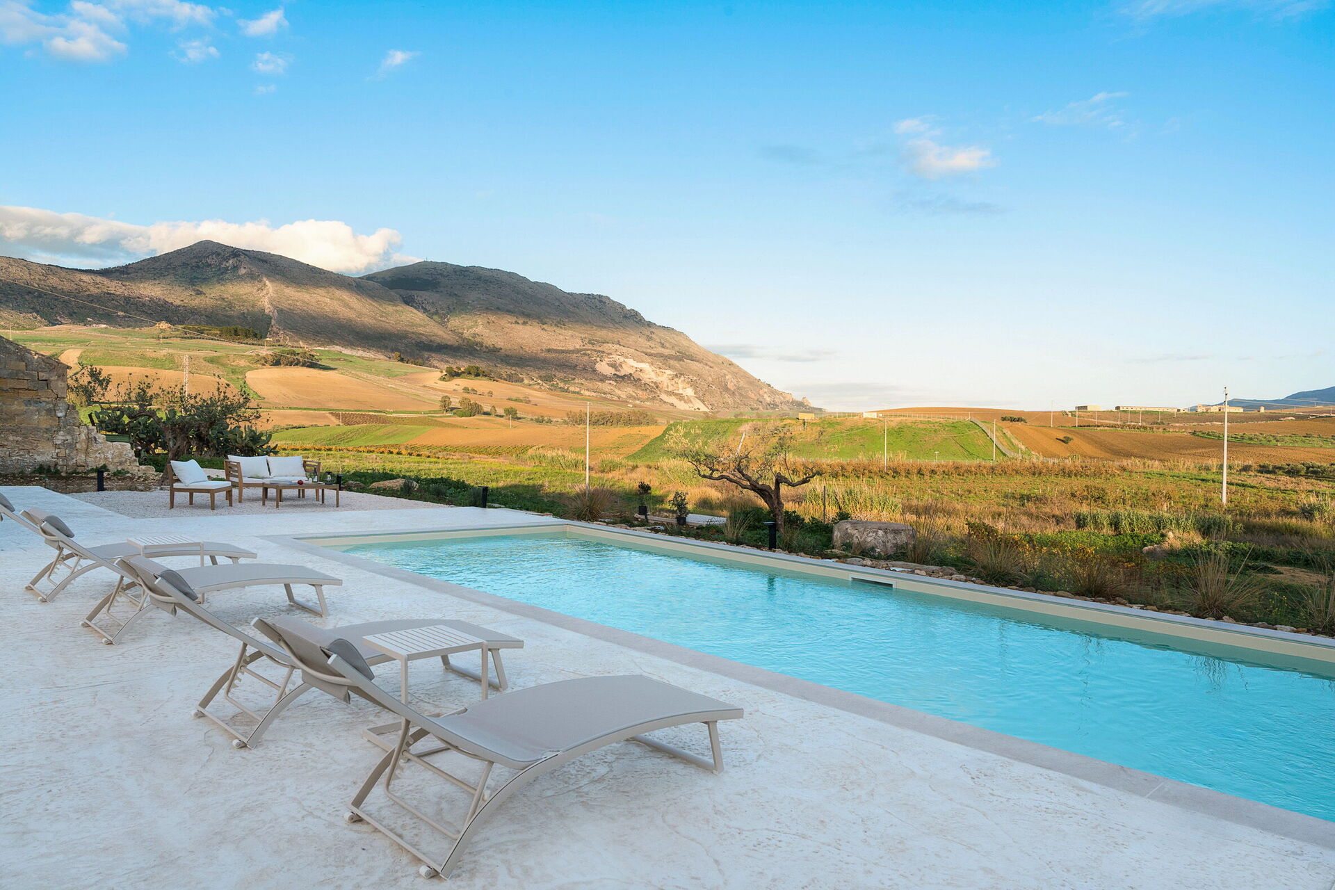Le panoramiche zone esterne sono il pezzo forte della casa: la piscina ad uso esclusivo degli ospiti, un ben curato patio e il solarium fanno di questa dimora il luogo ideale per rilassarsi e per trovare ristoro nelle soleggiate giornate siciliane.