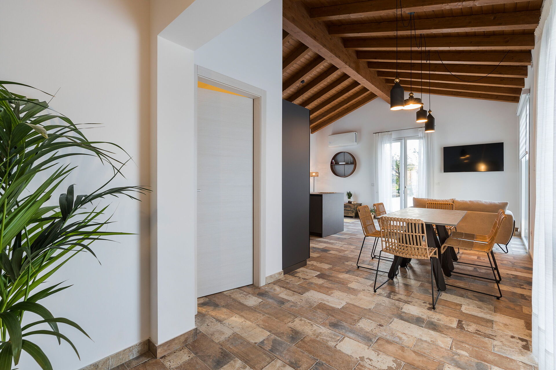 Piano terreno: soggiorno (aria condizionata, tv) con zona pranzo e cucina (piano cottura, forno, frigorifero, freezer, lavastoviglie, microonde, tostapane, macchina da caffè espresso, macchina da caffè americano), 1 wc, 3 camere matrimoniali (misure del letto: 160 x 200 cm; aria condizionata) ognuna con bagno privato con doccia.