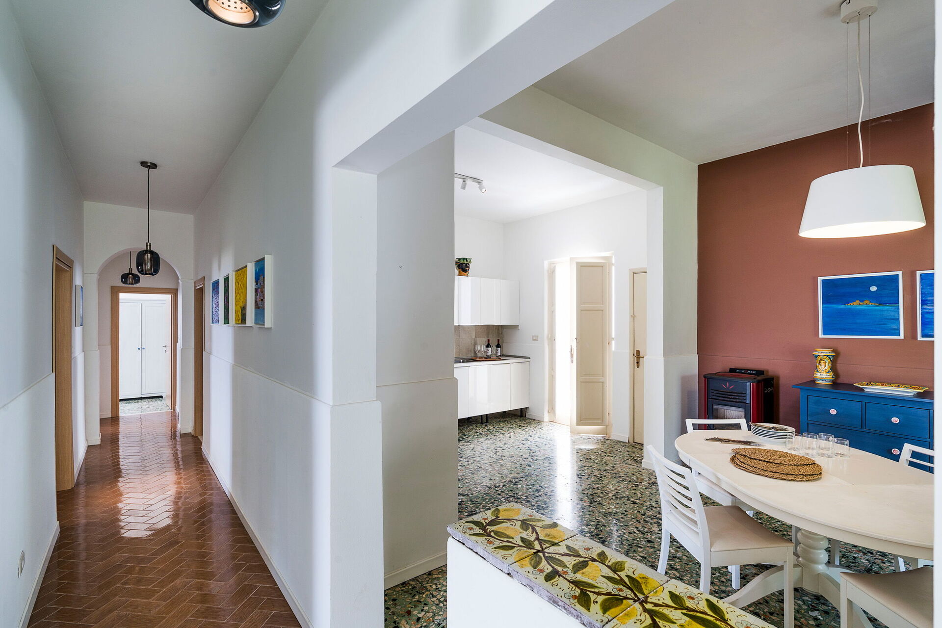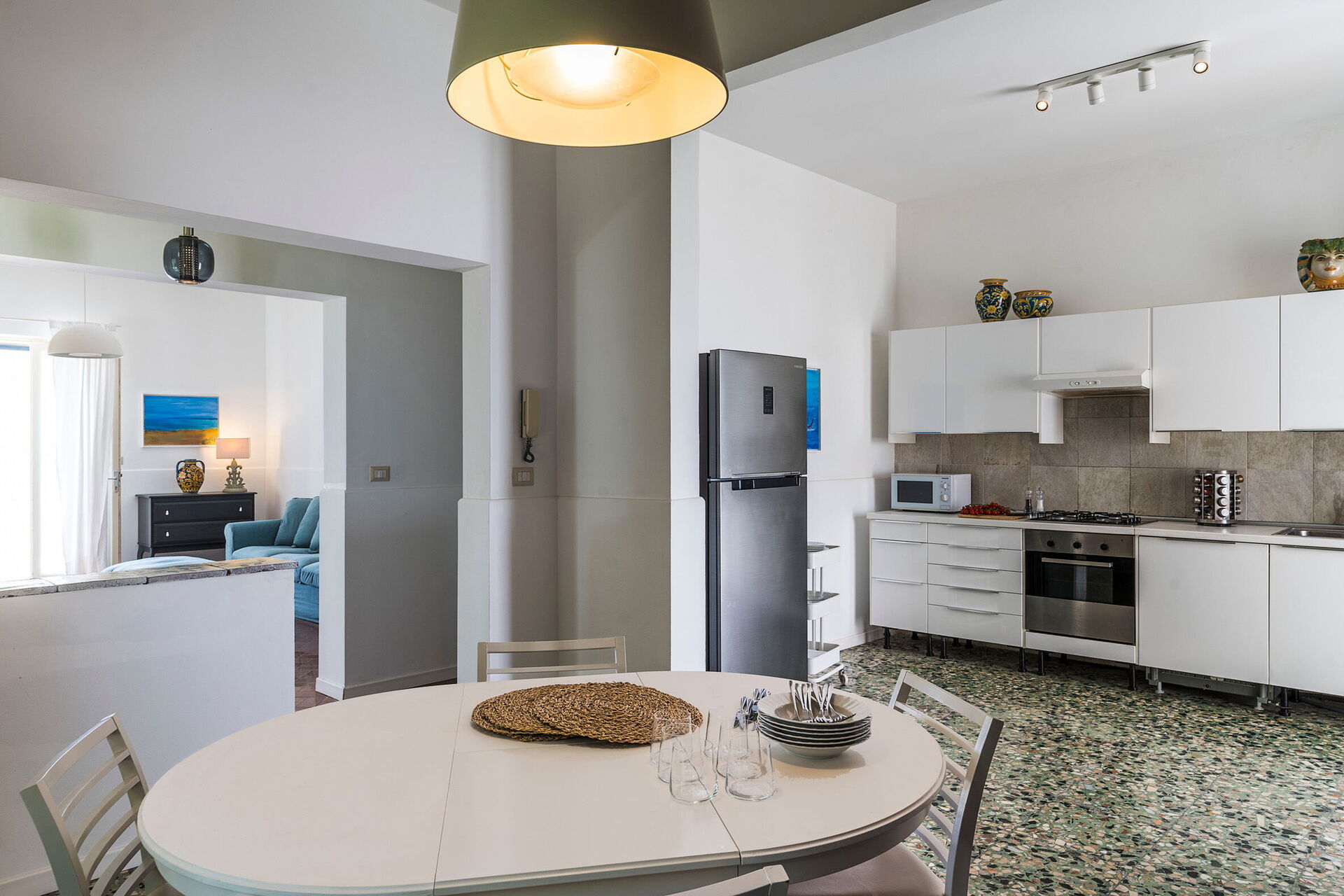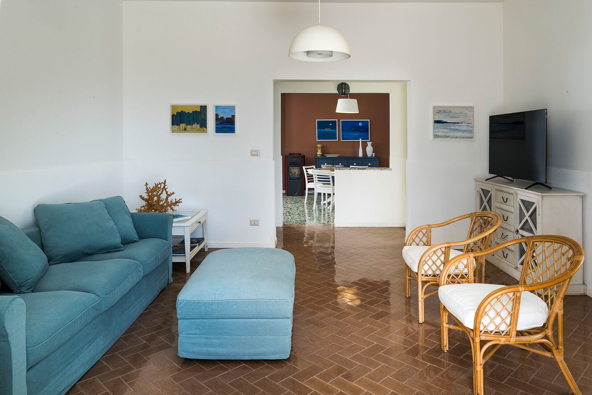 Piano terreno: soggiorno (tv) con accesso al terrazzo, cucina (piano cottura, forno, freezer, frigorifero, lavastoviglie, tostapane) con zona pranzo, 1 camera matrimoniale (aria condizionata) con bagno privato con doccia, 1 camera con 2 letti singoli (aria condizionata), 1 camera matrimoniale (aria condizionata), 2 bagni con doccia.