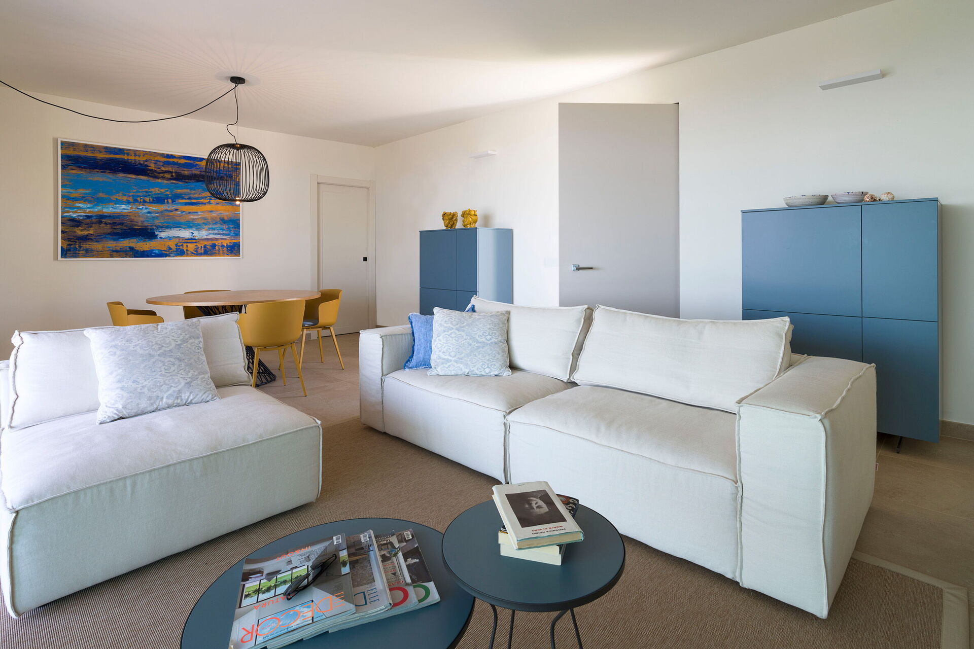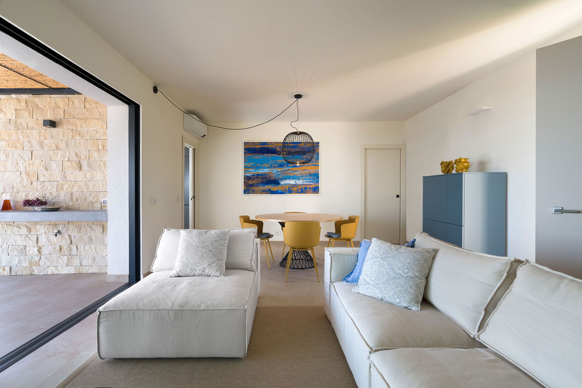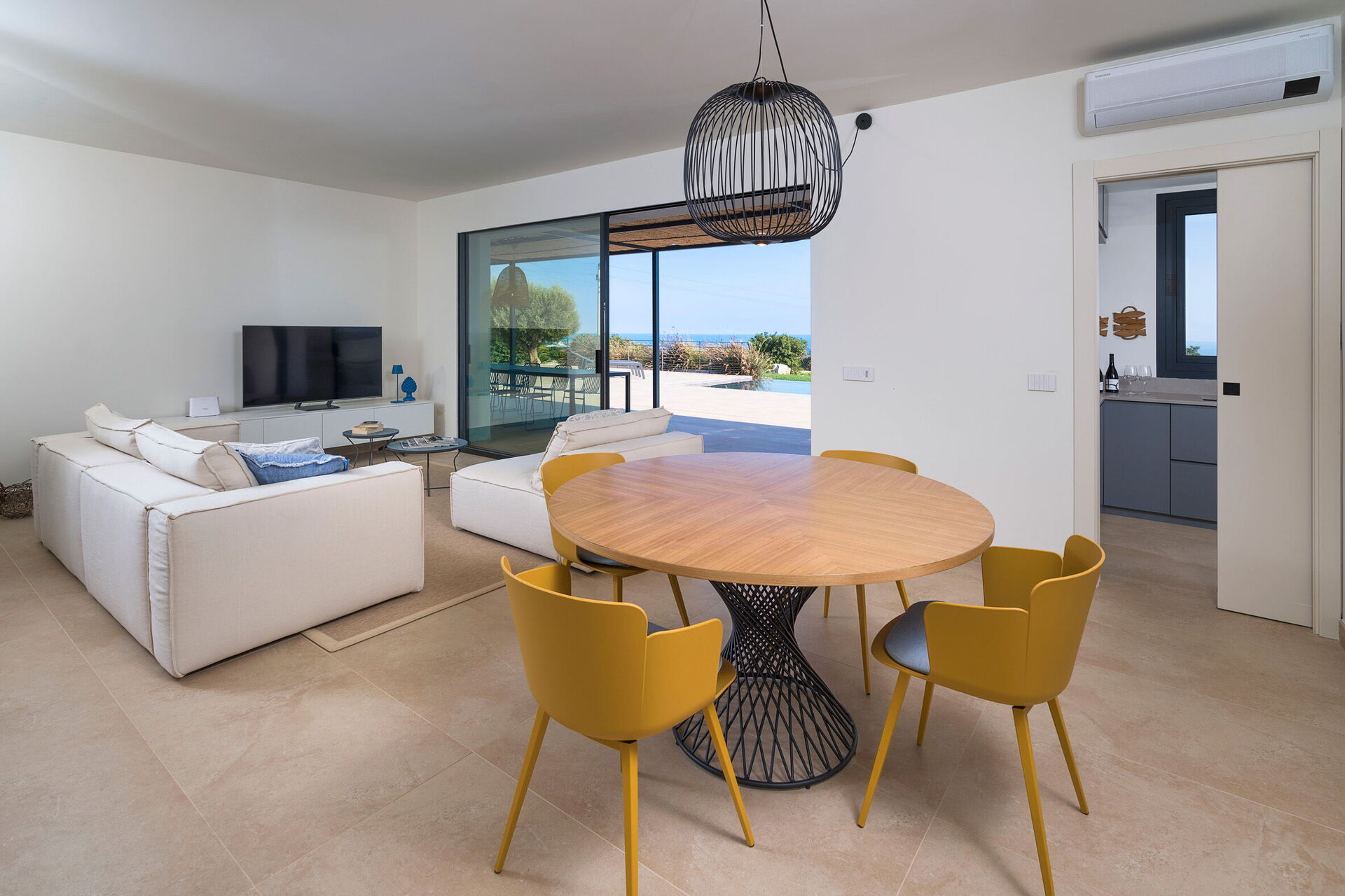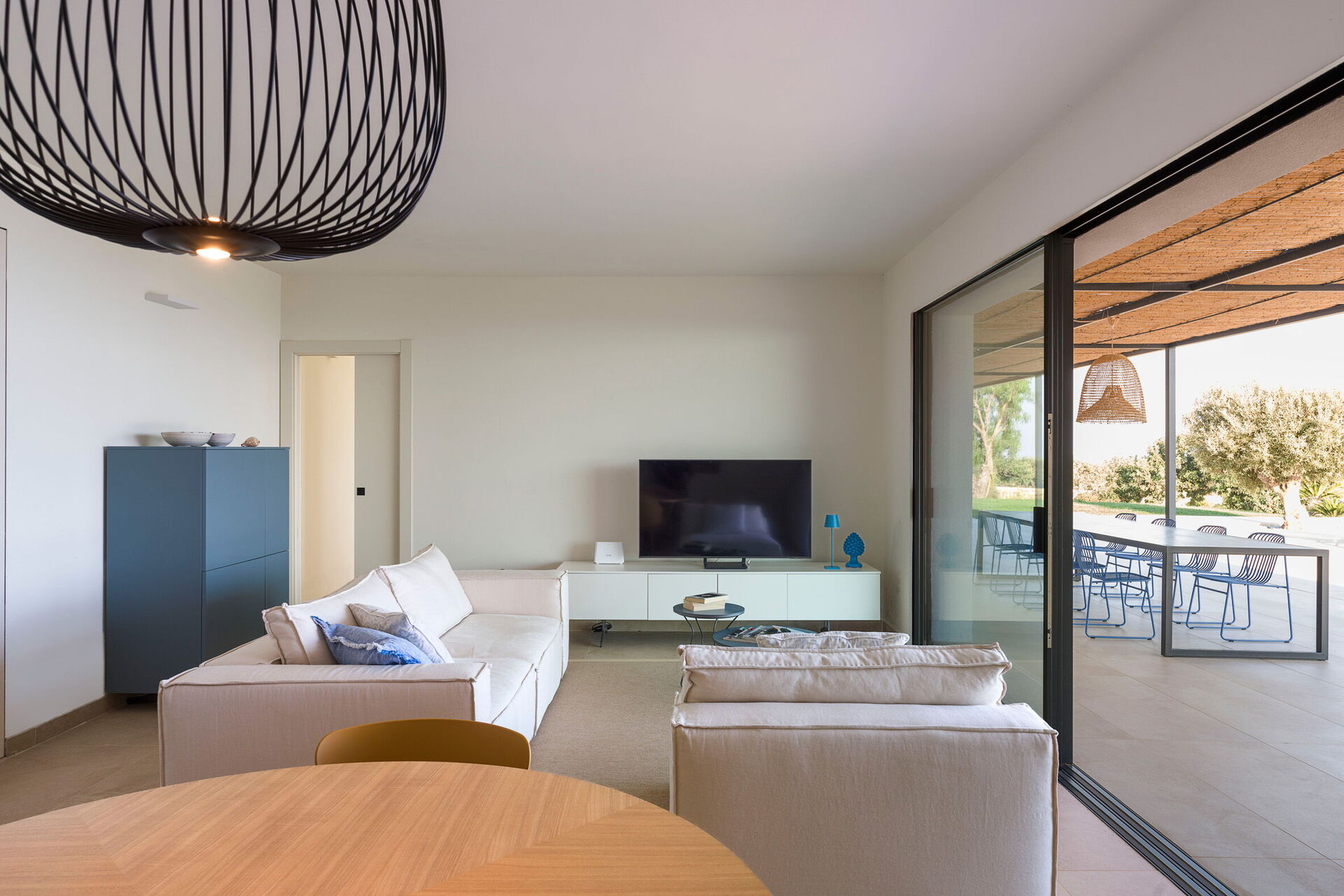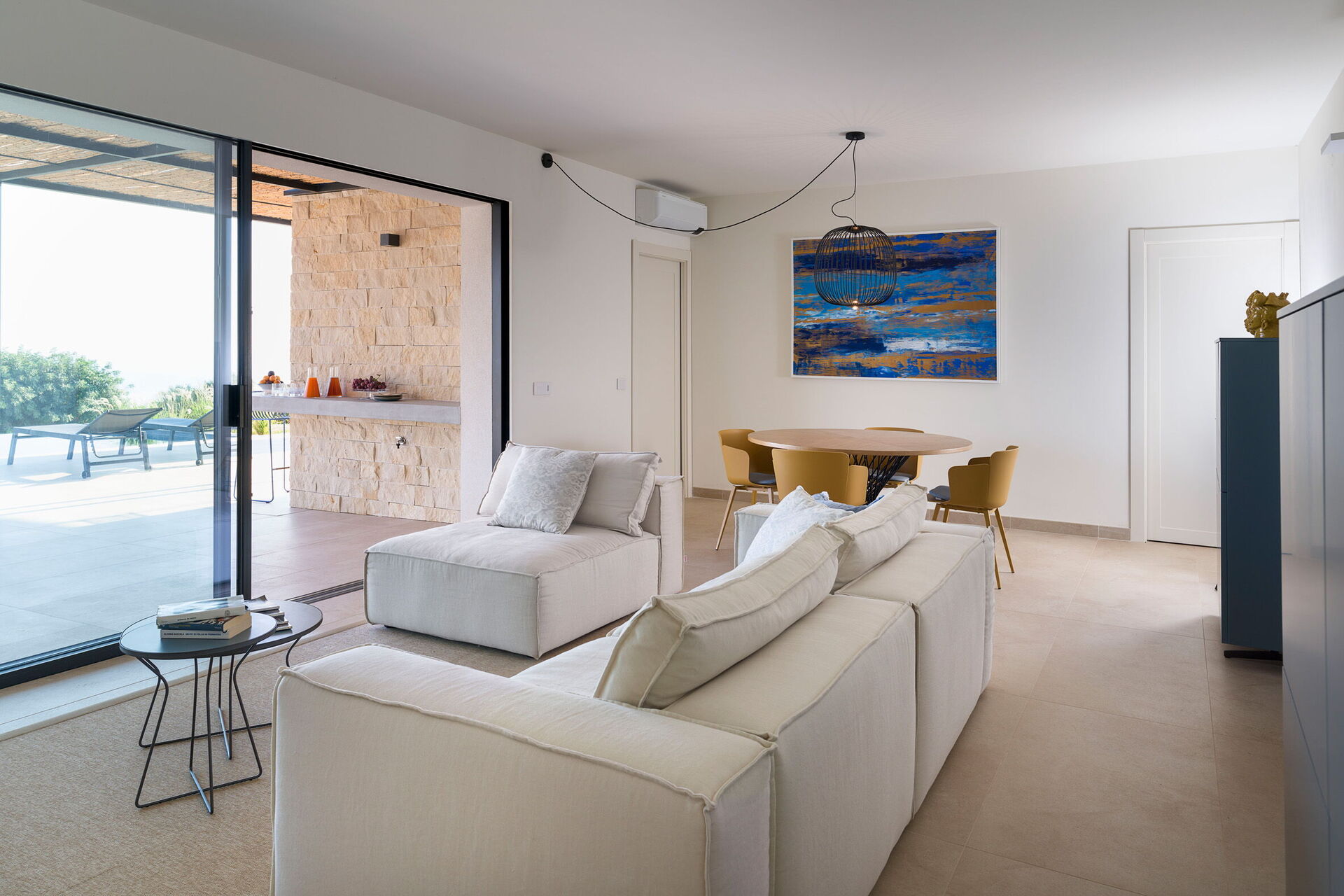 Gli interni sono stati arredati con gusto e semplicità e sono dotati di ogni moderno comfort. La villa si compone dalla casa principale (6 persone) e da una dependance (2 persone). In totale può comodamente ospitare fino a 8 persone grazie alle sue 4 camere da letto.