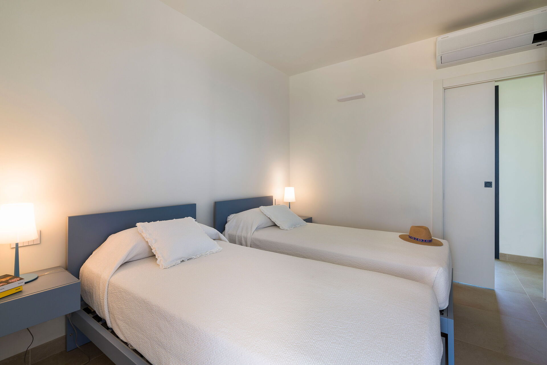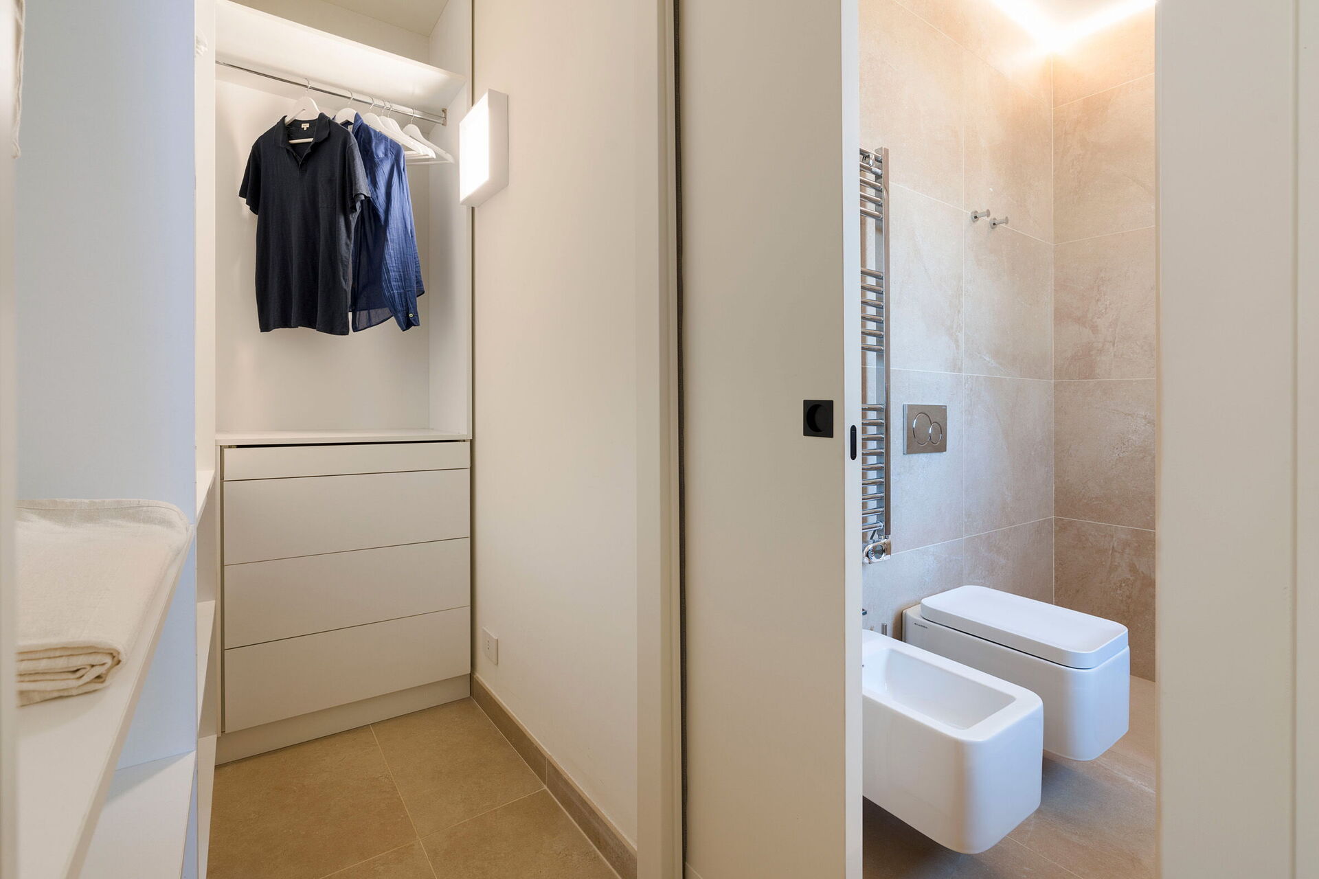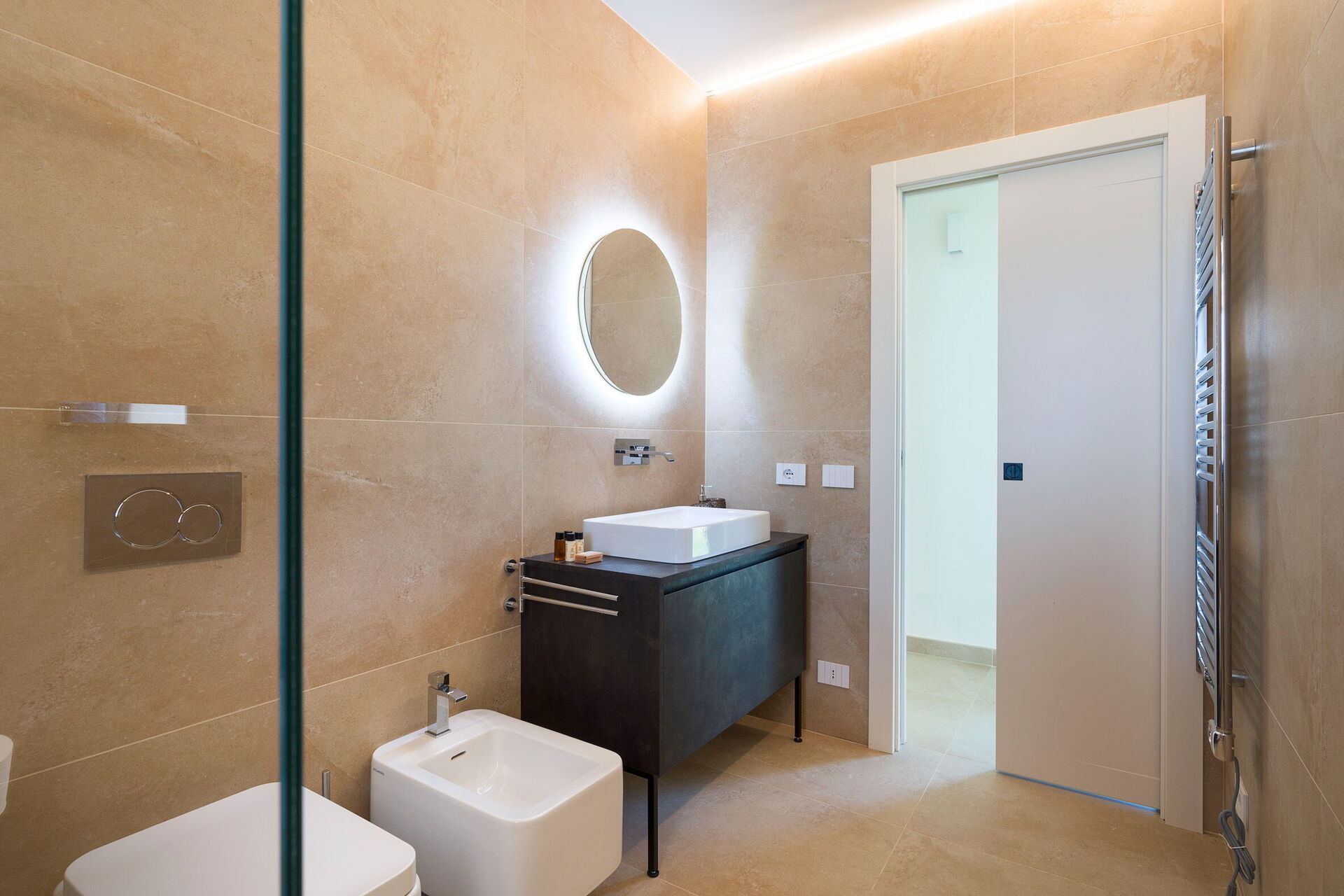 Piano terreno: panoramico soggiorno (smart TV) con sala pranzo, cucina (piano cottura, forno, freezer, frigorifero, lavastoviglie, macchina per il caffe, tostapane), camera con 2 letti singoli (aria condizionata), bagno con doccia, 2 camere matrimoniali (aria condizionata) ognuna con bagno privato con doccia.