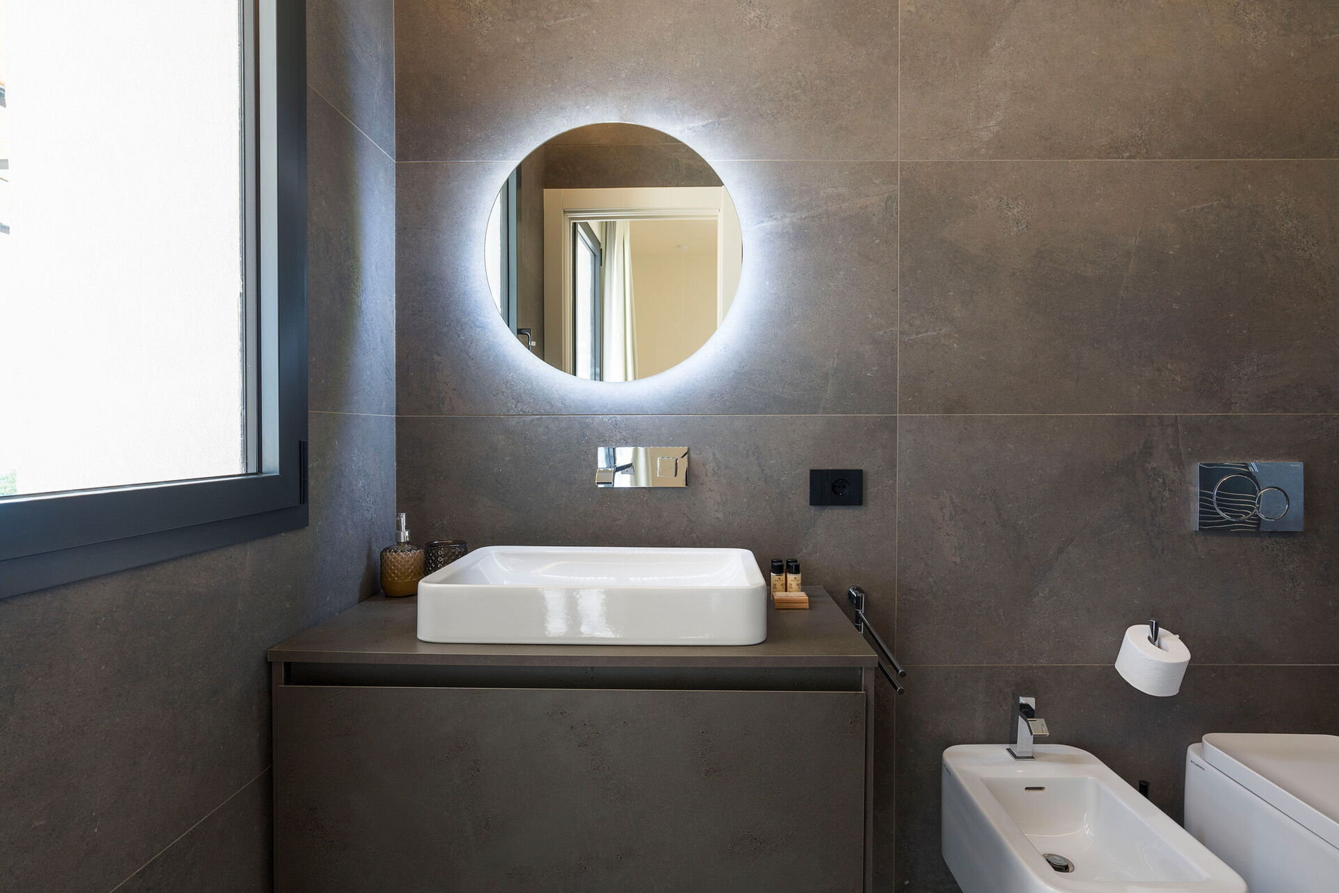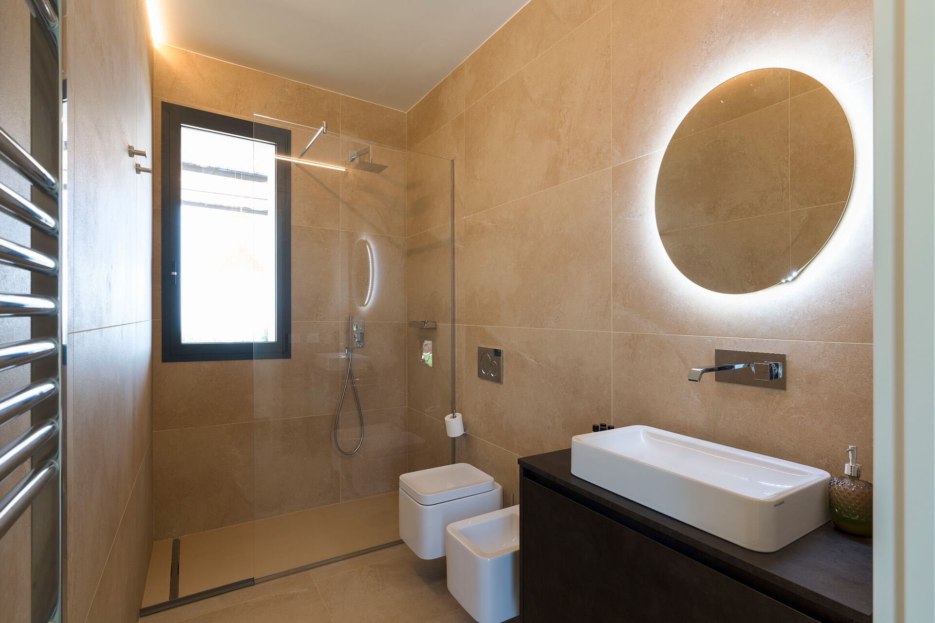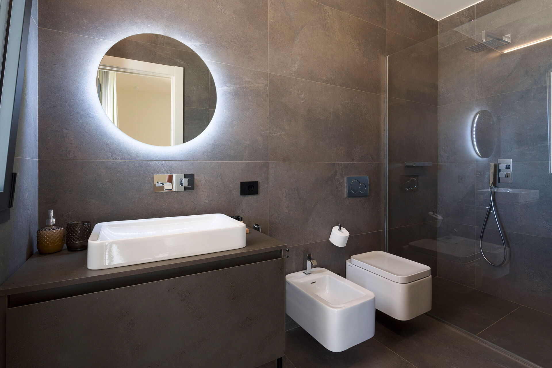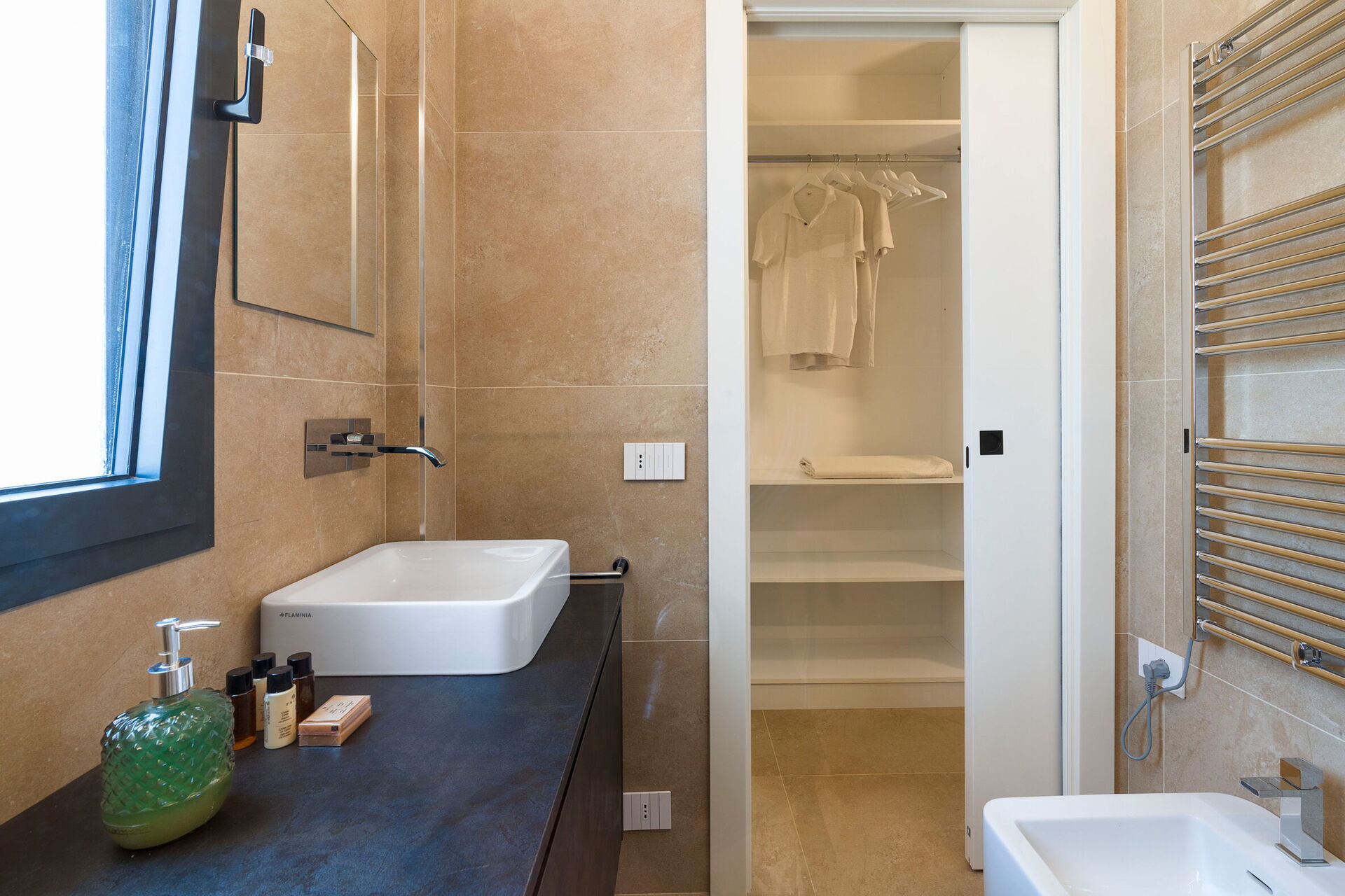 Piano terreno: panoramico soggiorno (smart TV) con sala pranzo, cucina (piano cottura, forno, freezer, frigorifero, lavastoviglie, macchina per il caffe, tostapane), camera con 2 letti singoli (aria condizionata), bagno con doccia, 2 camere matrimoniali (aria condizionata) ognuna con bagno privato con doccia.