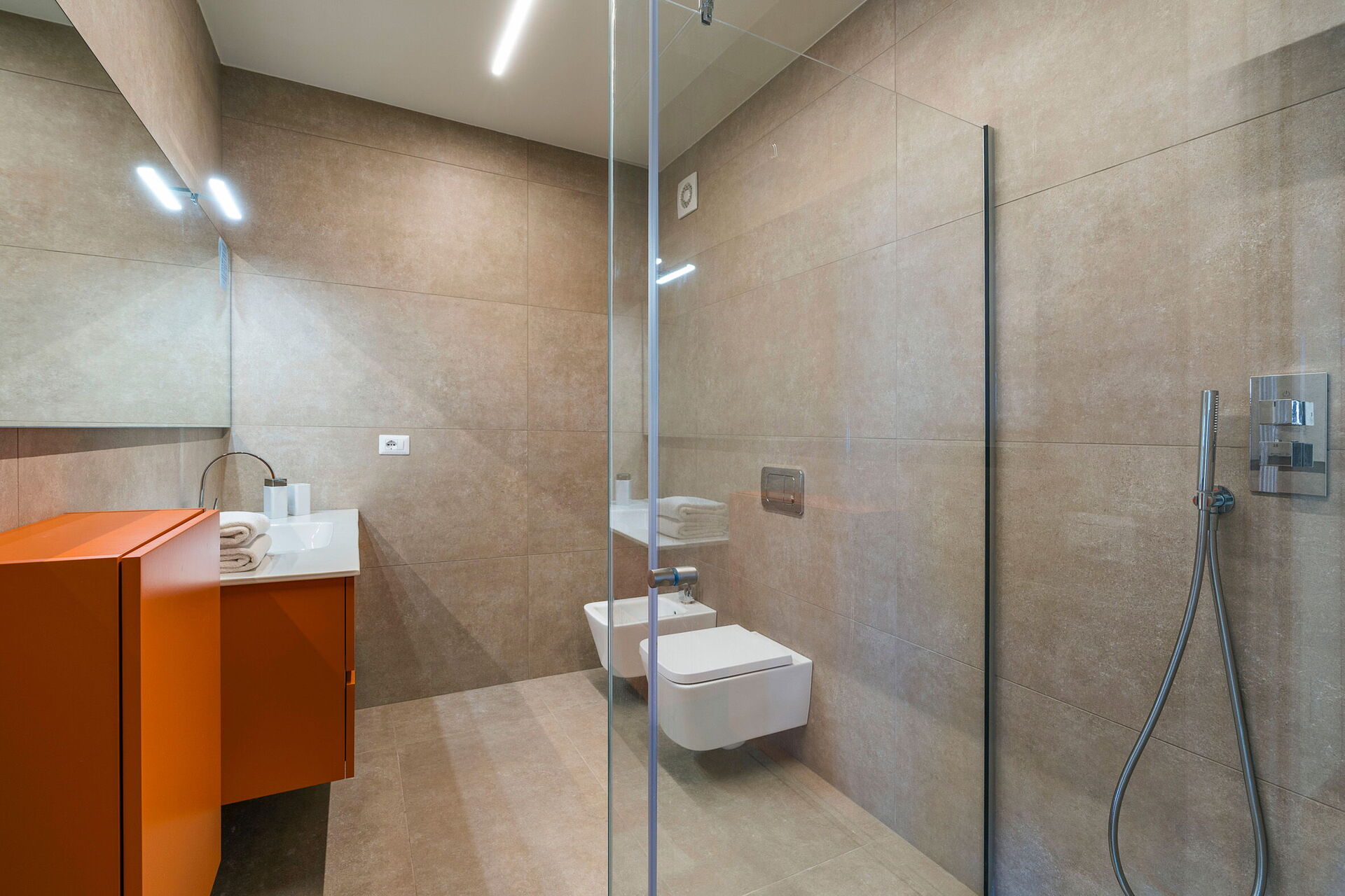 Piano terreno: panoramico soggiorno (TV) con sala pranzo, cucina (piano cottura, forno, freezer, frigorifero, lavastoviglie, macchina per il caffe, tostapane), camera con 2 letti singoli (aria condizionata), bagno con doccia, 2 camere matrimoniali (aria condizionata) ognuna con bagno privato con doccia.
