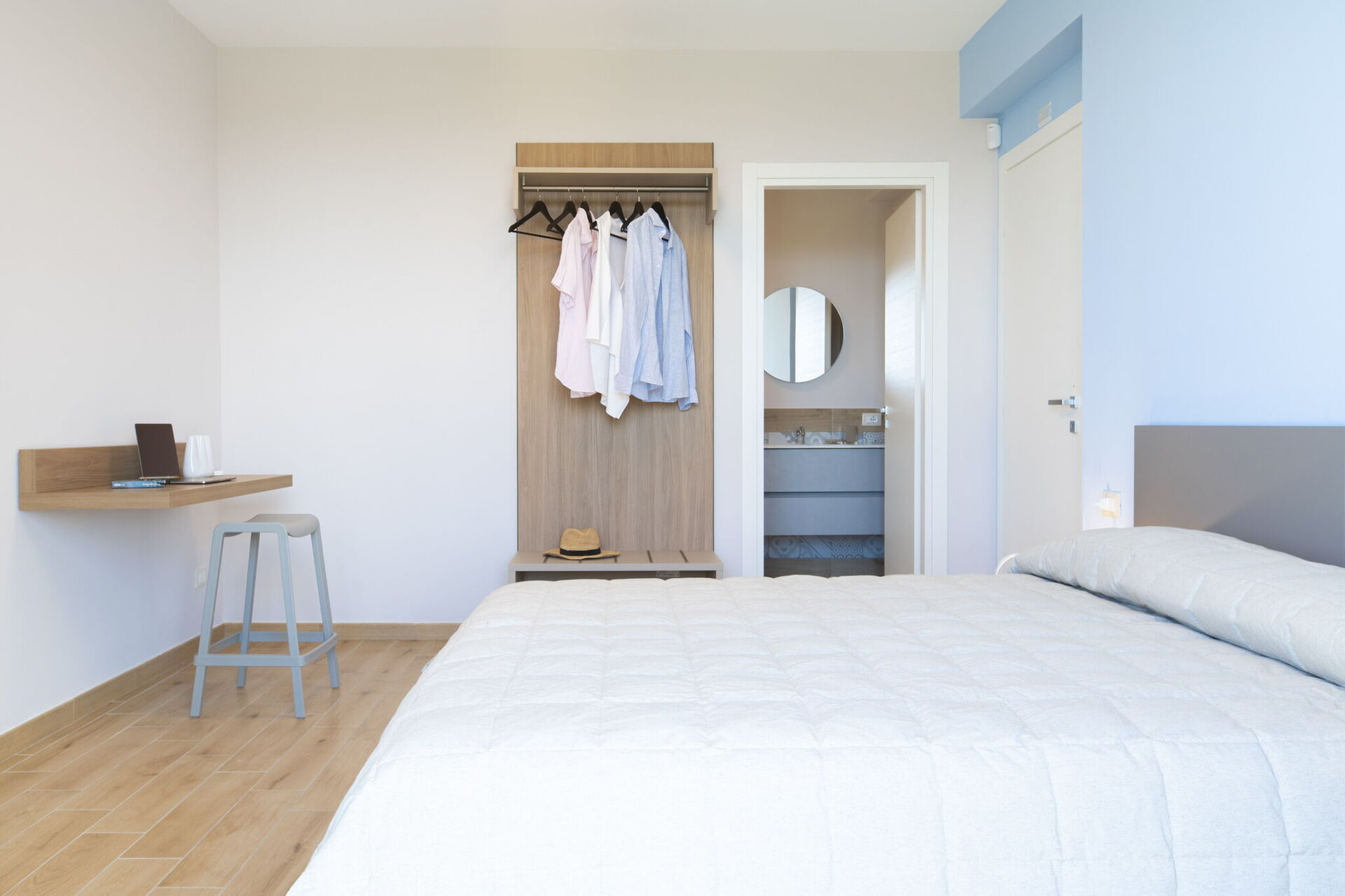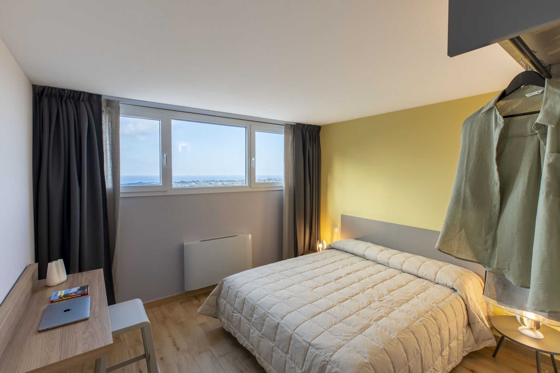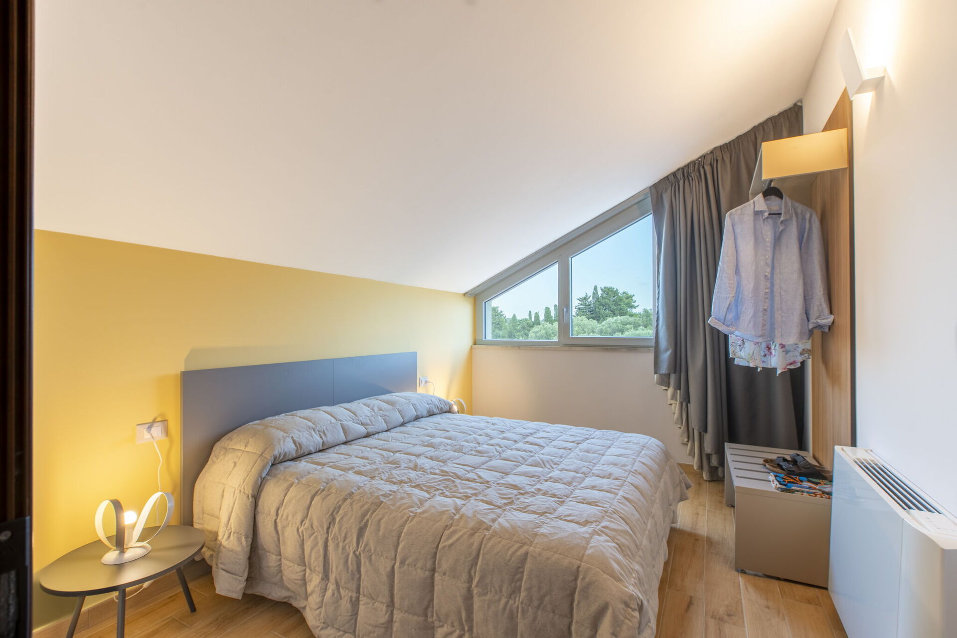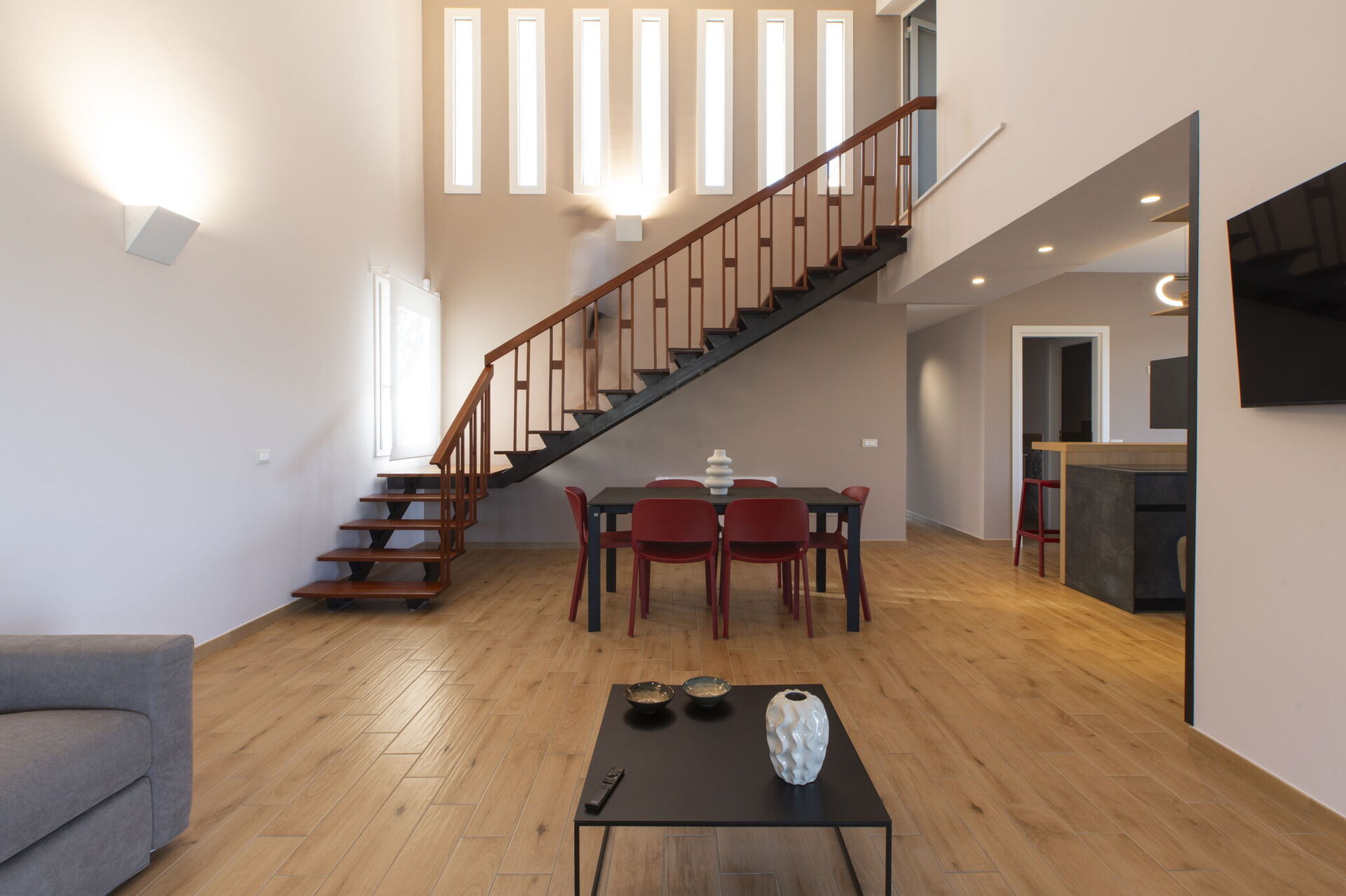 Primo piano: soggiorno con accesso su terrazza-solarium (smart tv), 2 camere matrimoniali, bagno con doccia. Il soggiorno e una delle camere hanno una parte di soffitto che va a scendere.