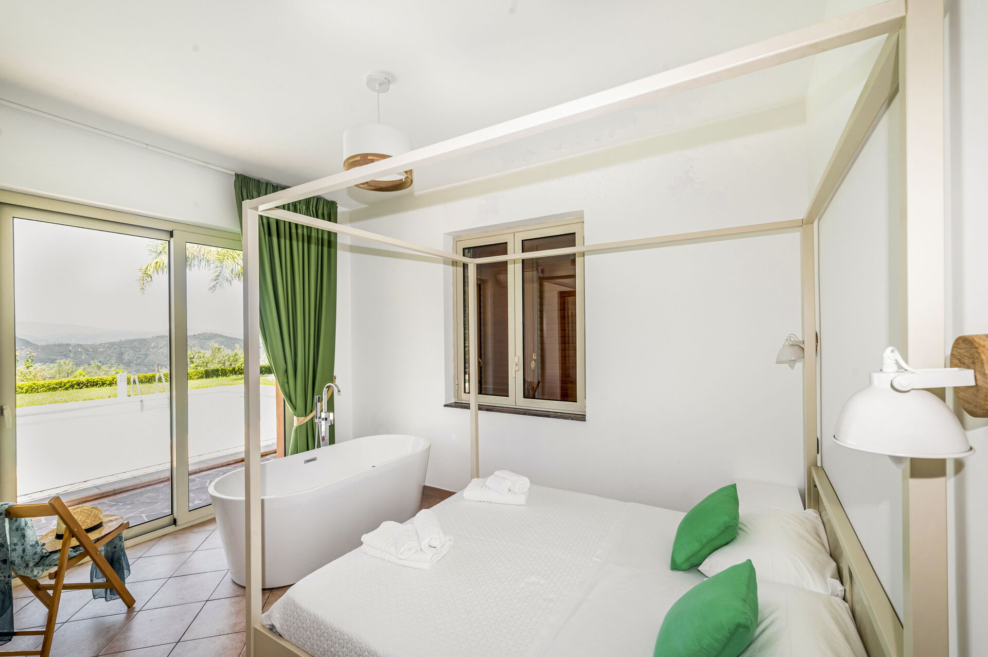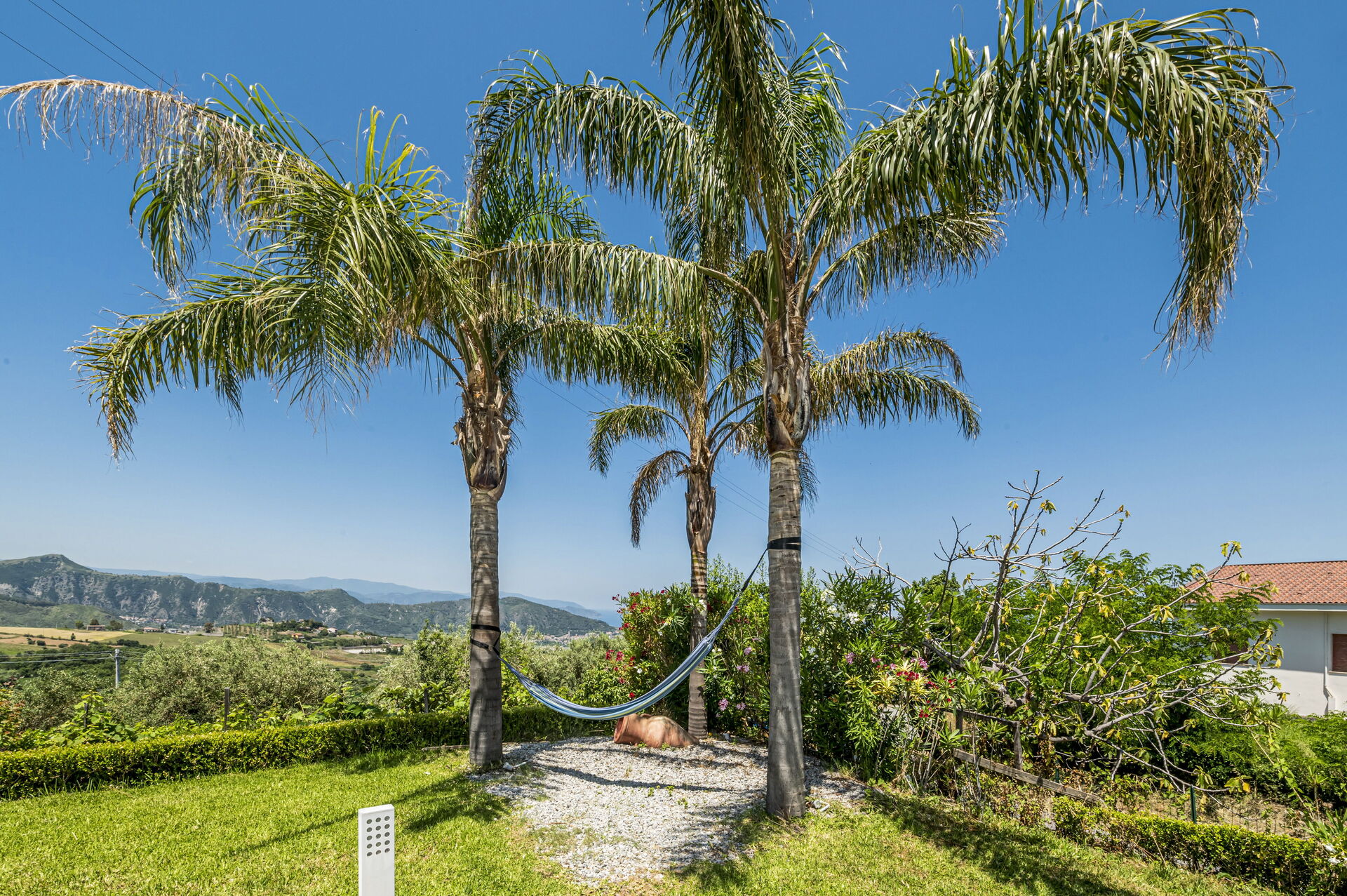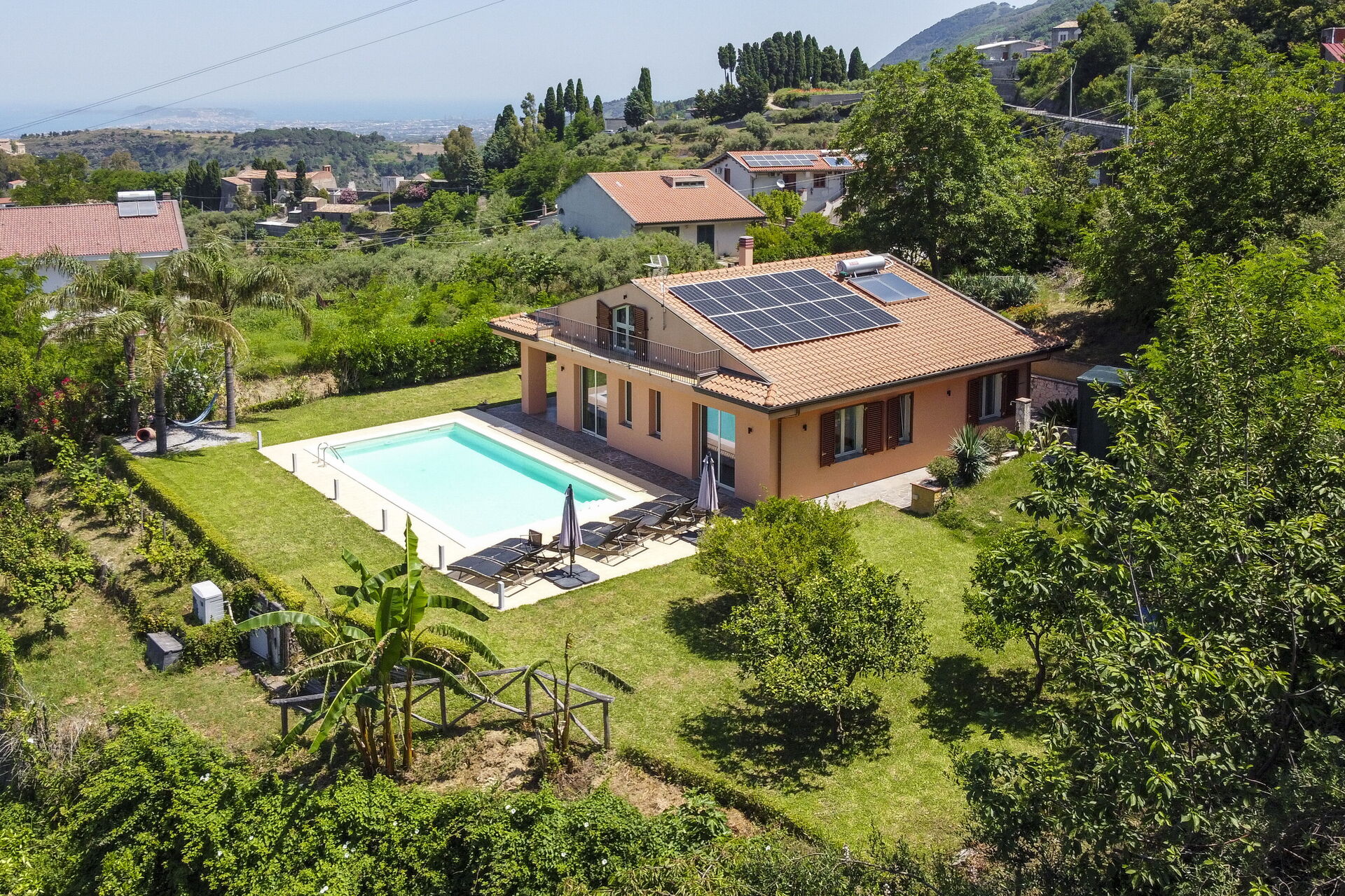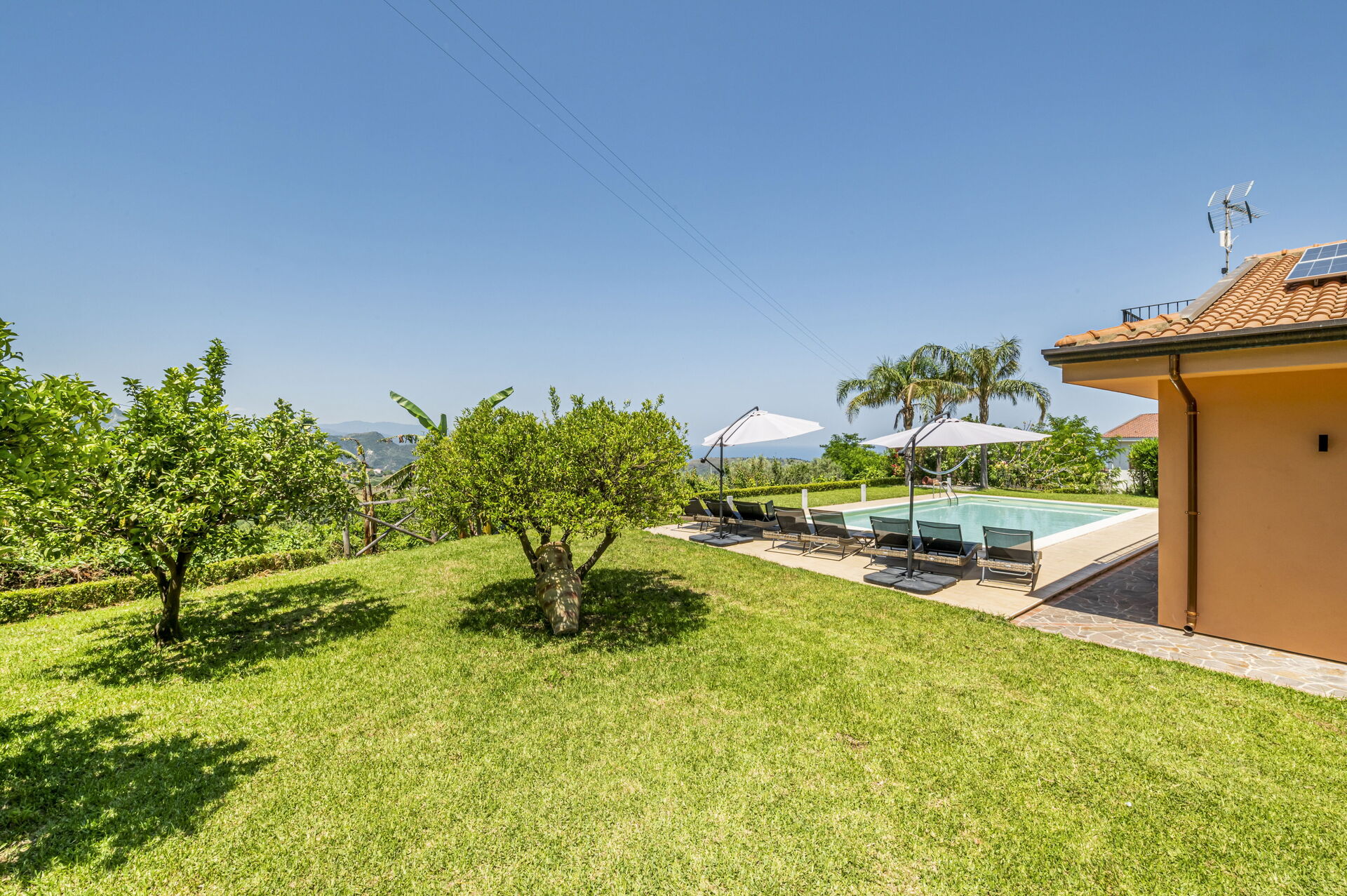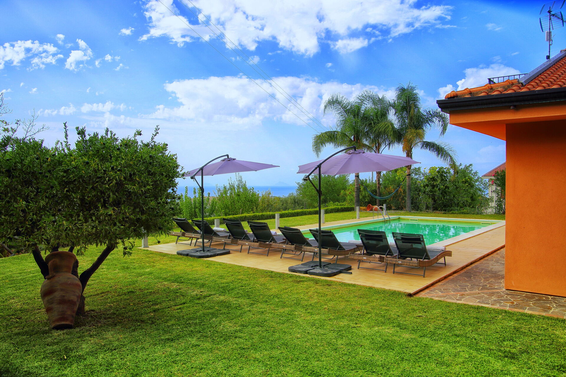 Villa Malu si trova in una posizione panoramica con vista spettacolare sulle isole Eolie: è completamente immersa nel verde ed è circondata da alberi da frutto, da palme e da ulivi secolari.