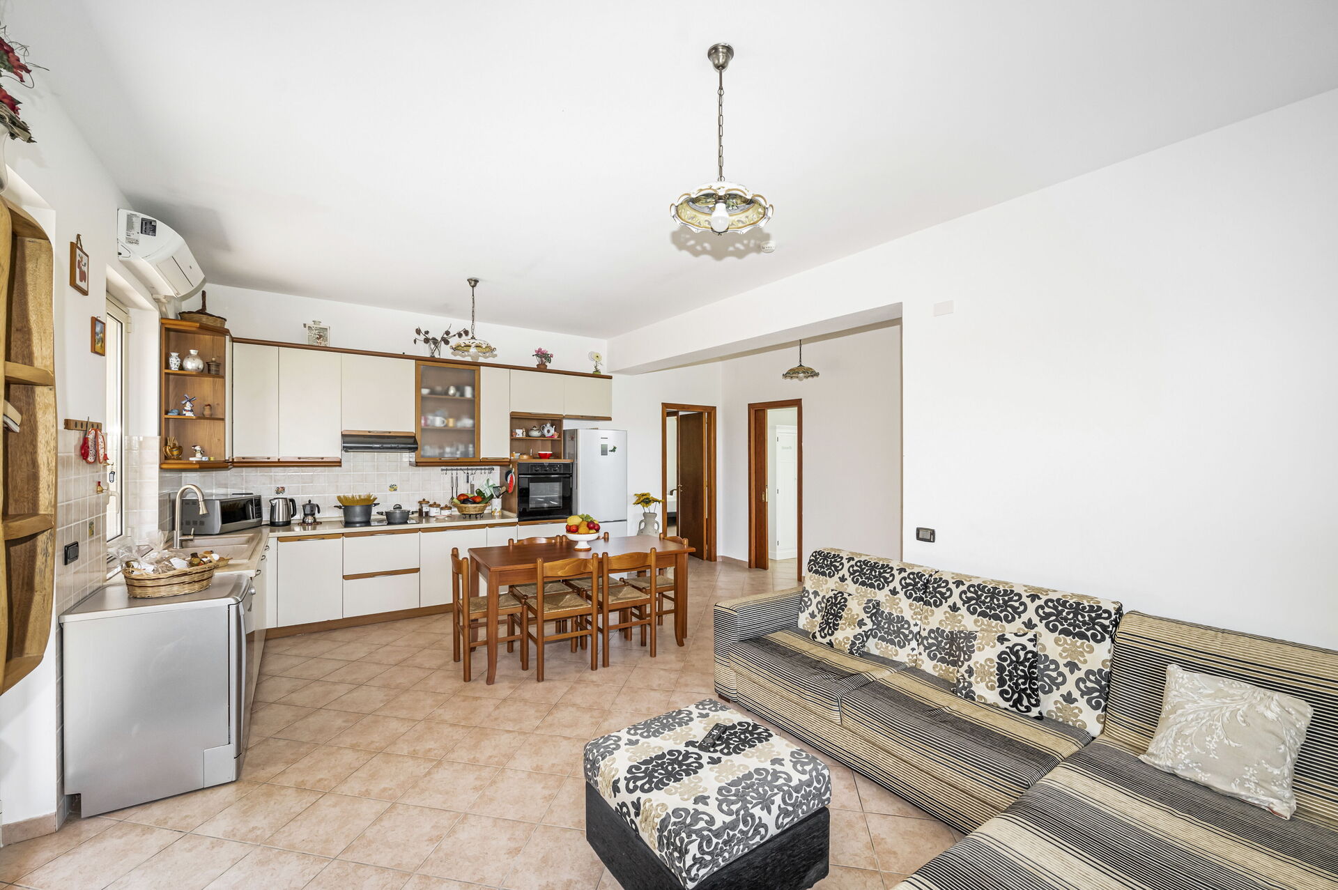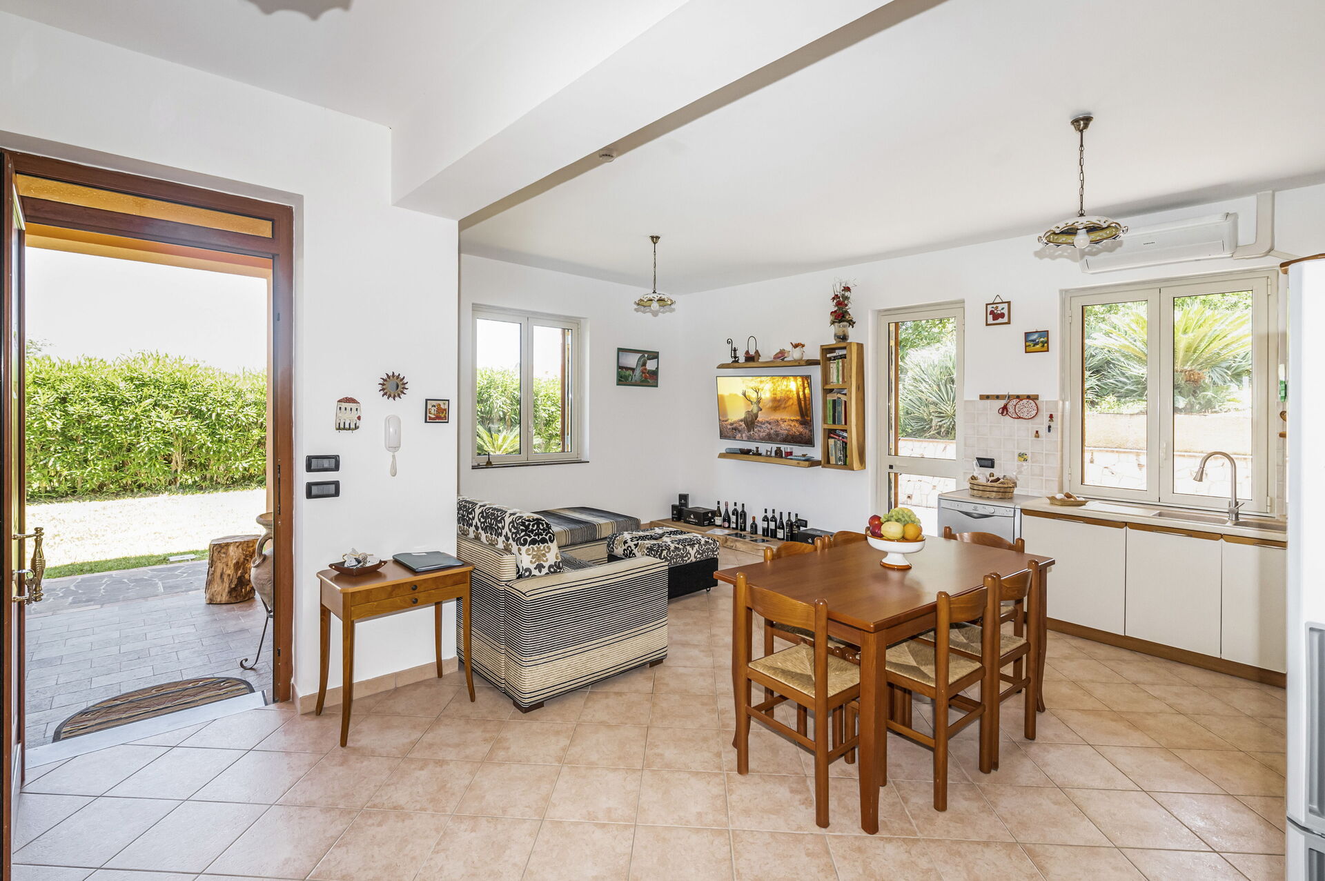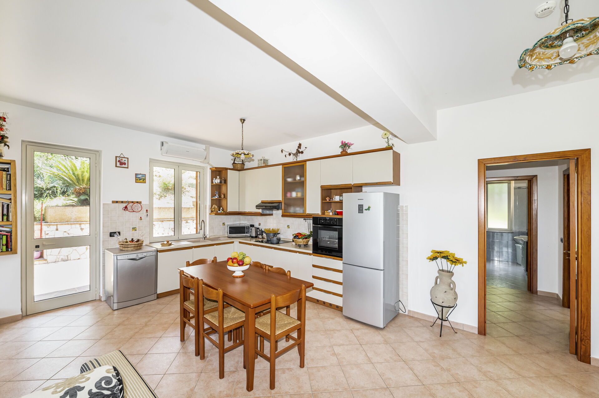 Piano terreno: ingresso su soggiorno con divano letto matrimoniale e cucina (aria condizionata, smart tv, piano cottura a induzione, forno, frigorifero, freezer, lavastoviglie, microonde, tostapane, macchina da caffè espresso) con zona pranzo, camera matrimoniale (aria condizionata, letto king size) con bagno privato con vasca idromassaggio, camera matrimoniale (aria condizionata, letto super-king size) con bagno con vasca, camera matrimoniale (aria condizionata, letto king size), camera con 2 letti singoli, bagno con doccia.