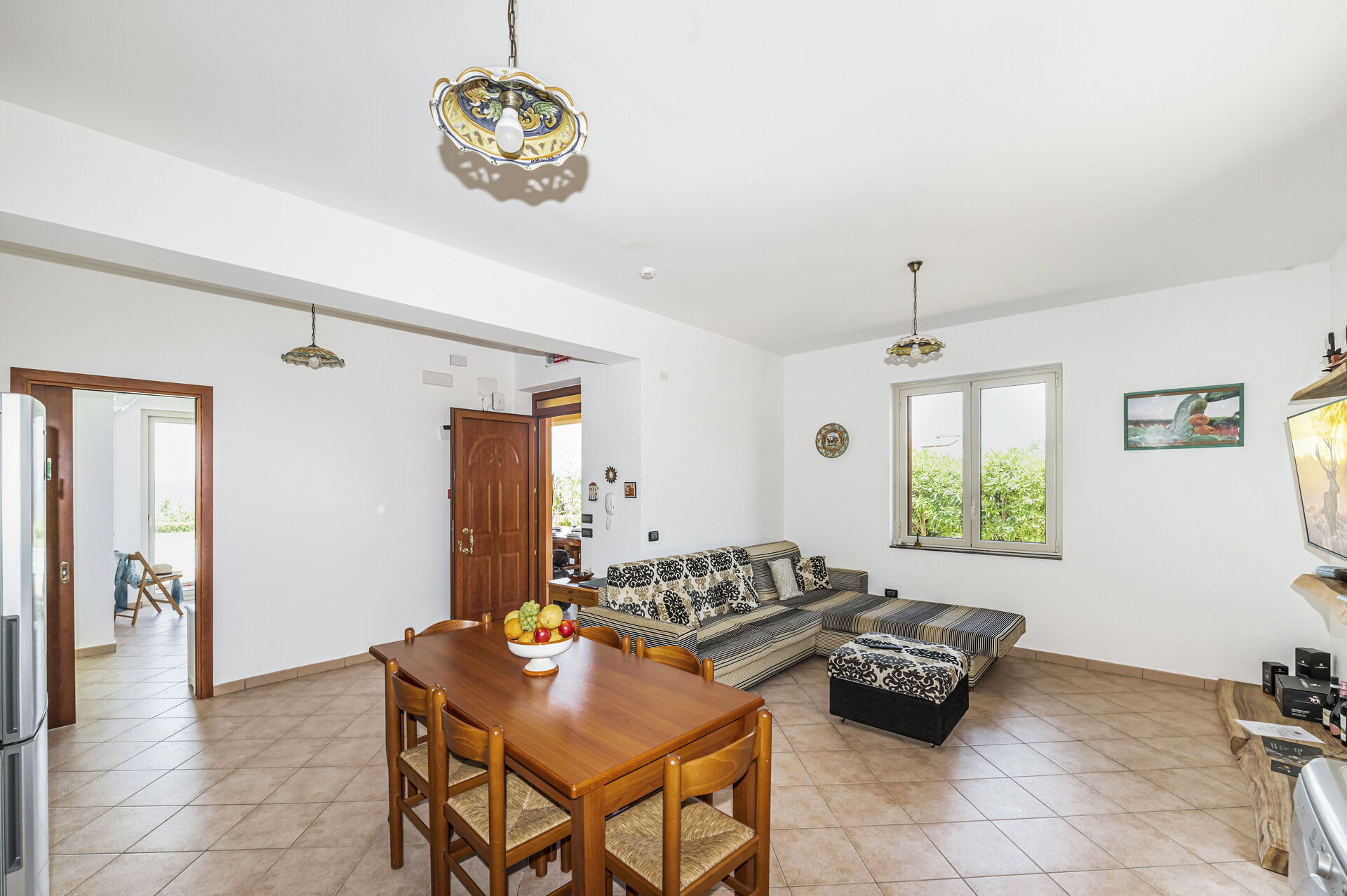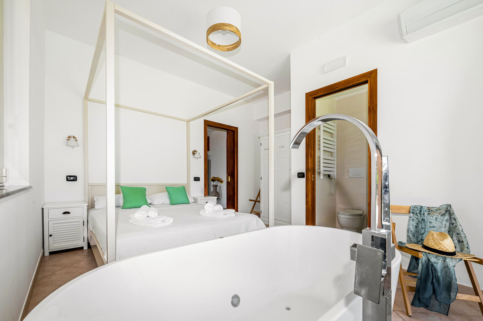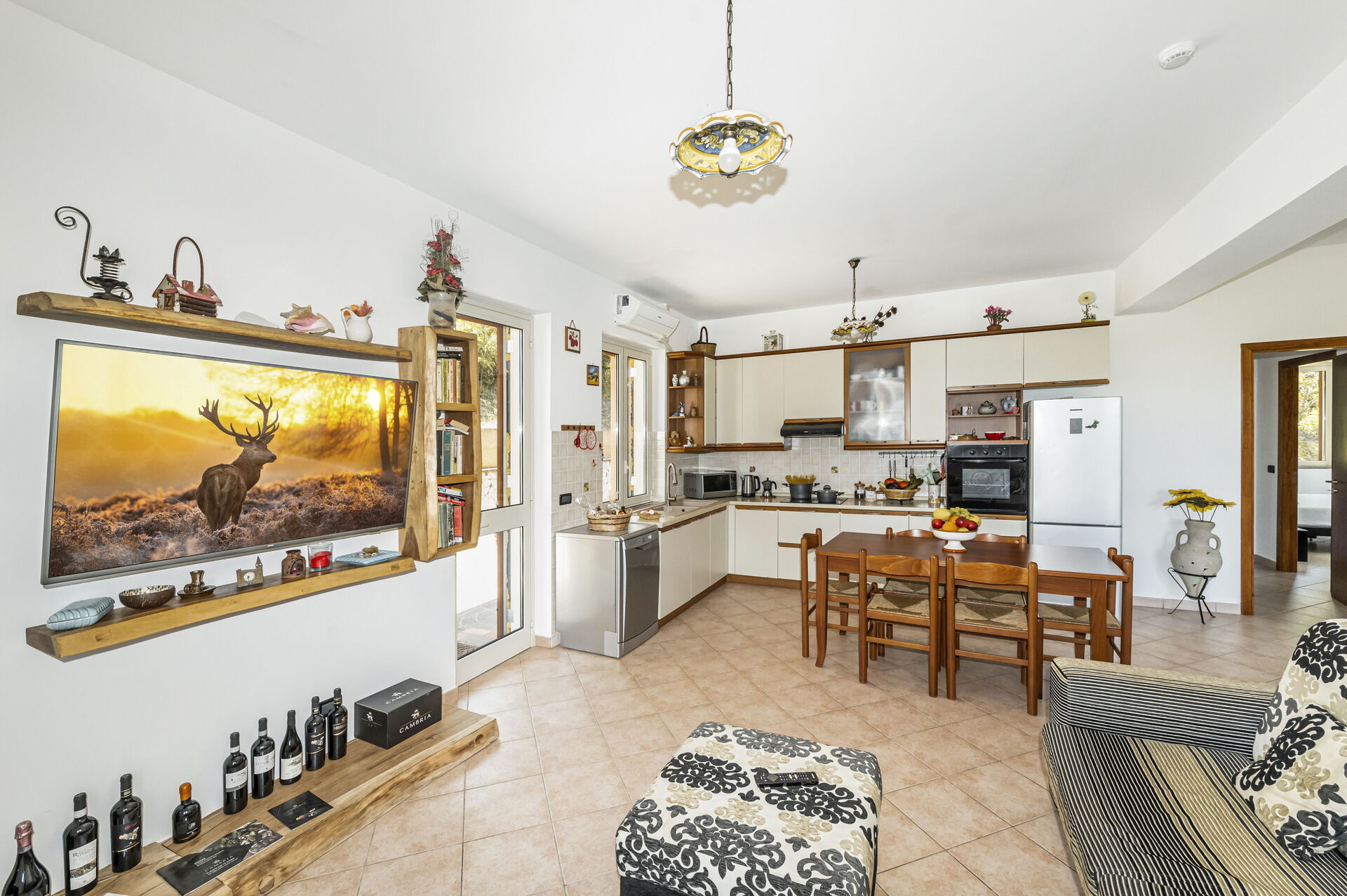 Piano terreno: ingresso su soggiorno con divano letto matrimoniale e cucina (aria condizionata, smart tv, piano cottura a induzione, forno, frigorifero, freezer, lavastoviglie, microonde, tostapane, macchina da caffè espresso) con zona pranzo, camera matrimoniale (aria condizionata, letto king size) con bagno privato con vasca idromassaggio, camera matrimoniale (aria condizionata, letto super-king size) con bagno con vasca, camera matrimoniale (aria condizionata, letto king size), camera con 2 letti singoli, bagno con doccia.