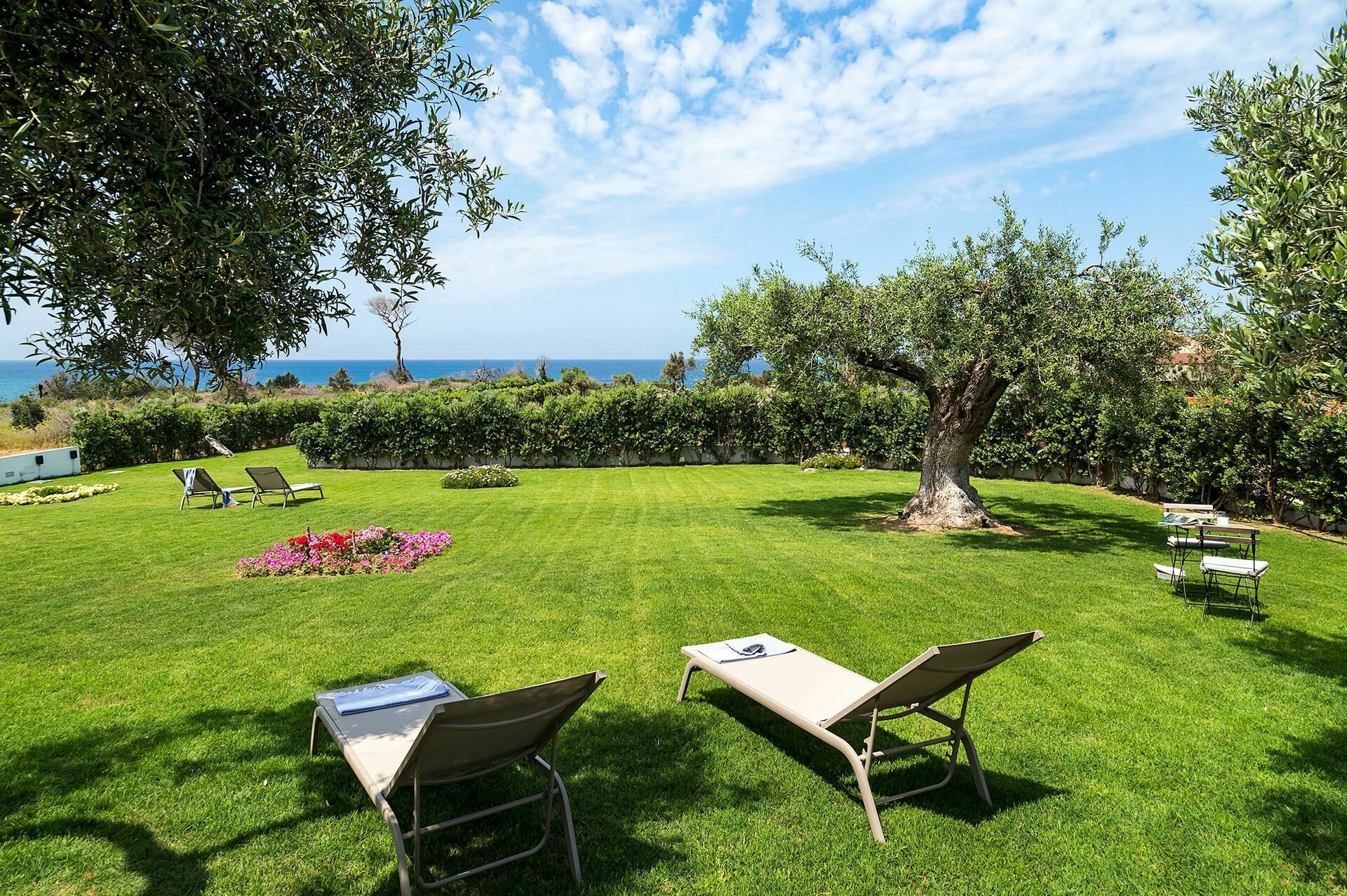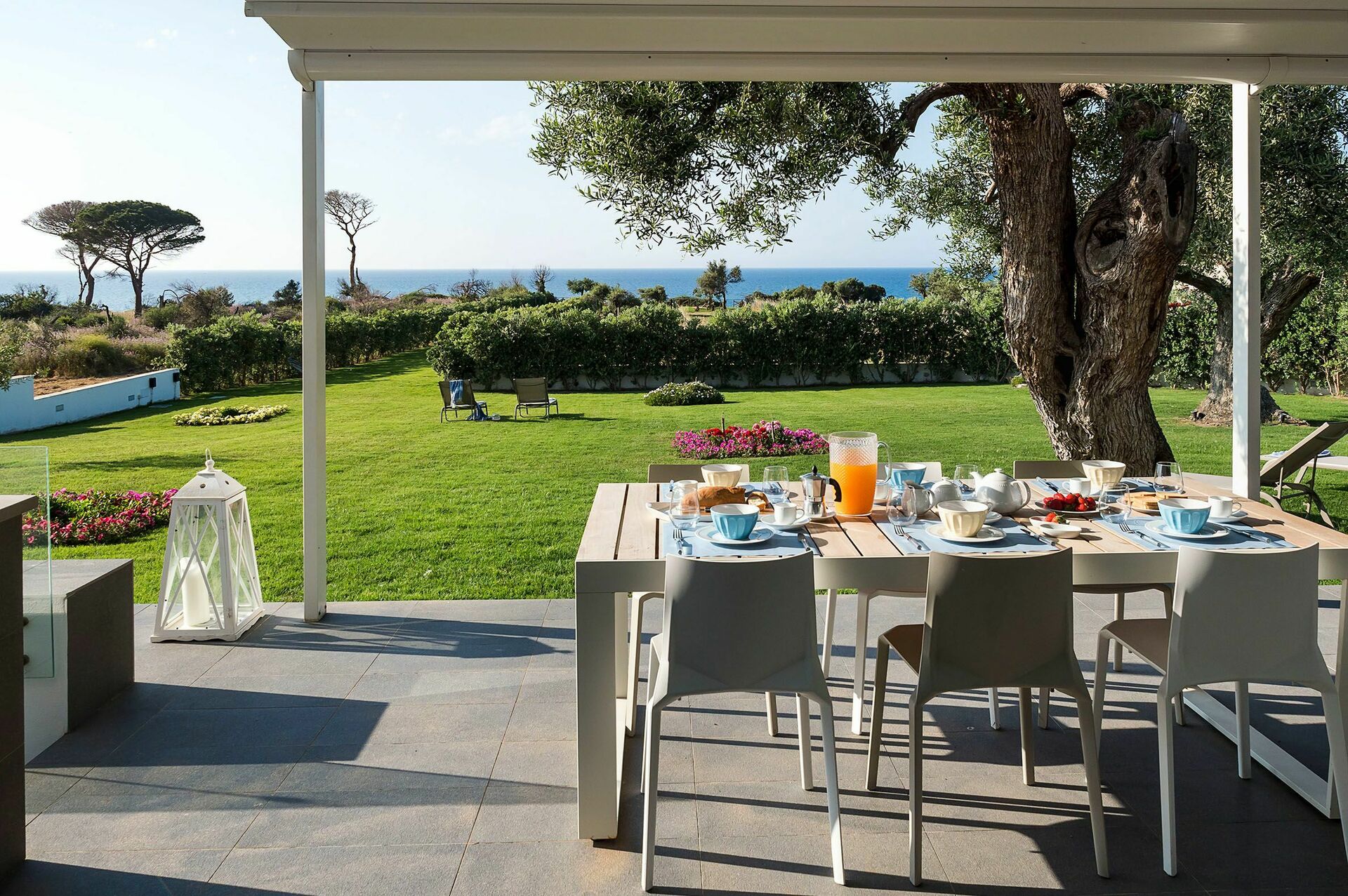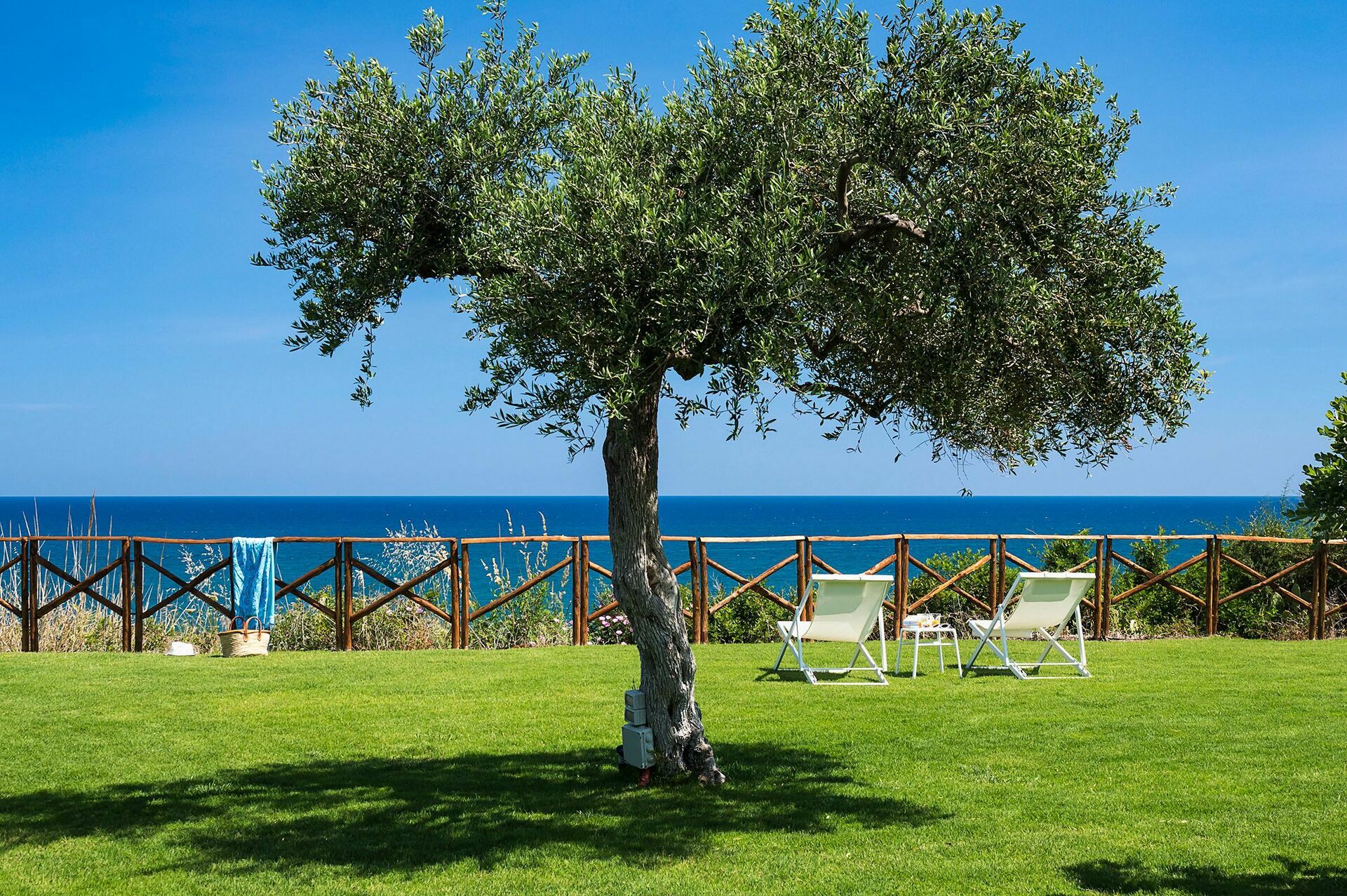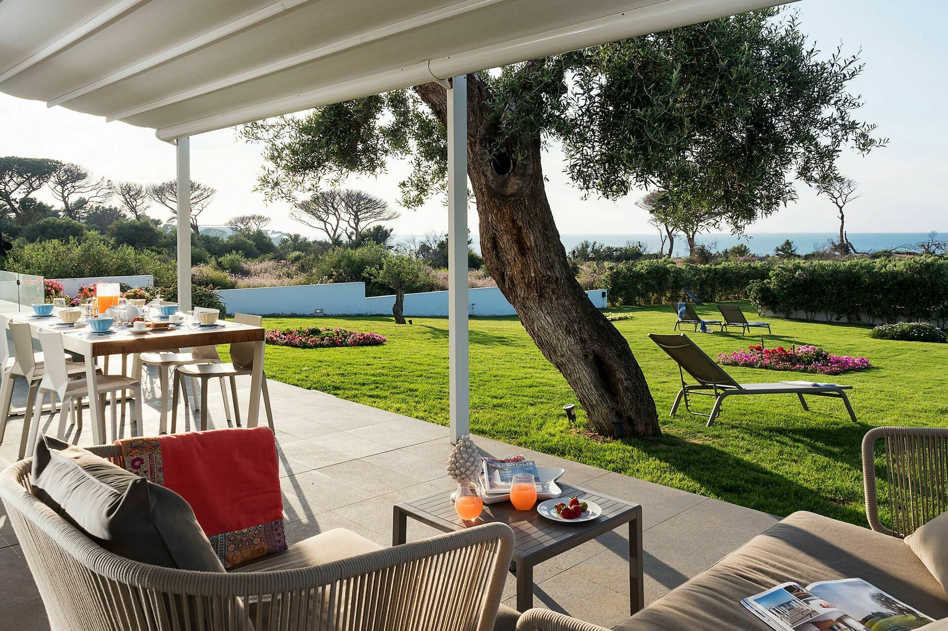 Posta in splendida posizione panoramica, la casa vacanze dispone di un’ampia terrazza e di un curato giardino arredati come dei veri e propri living all’aperto, da cui si gode una scenografica vista sulla campagna e sul mare.