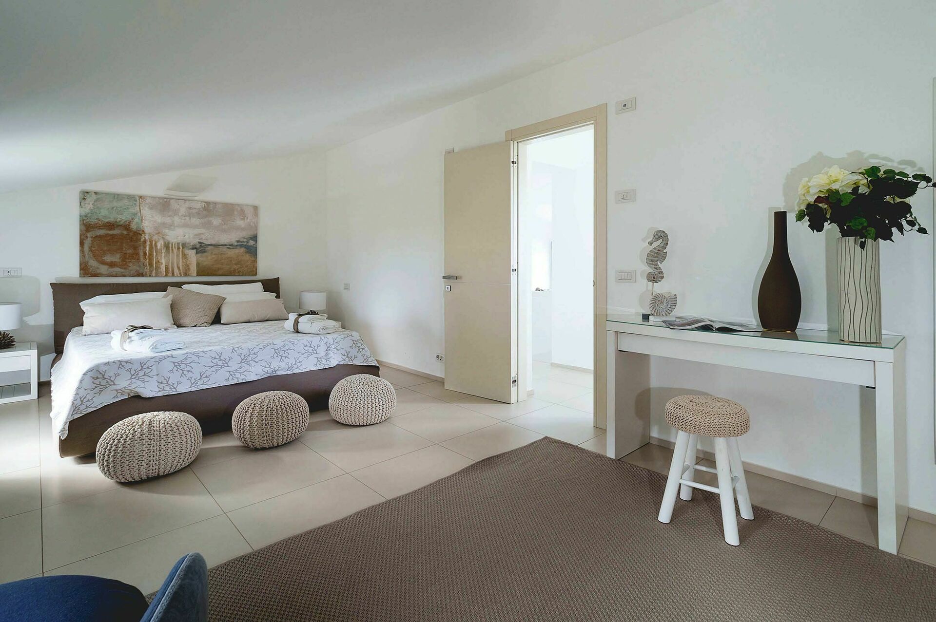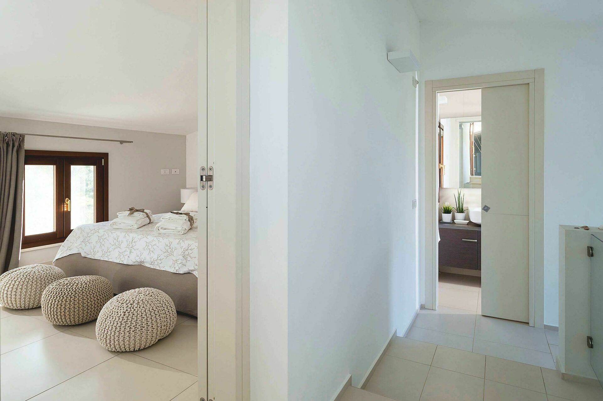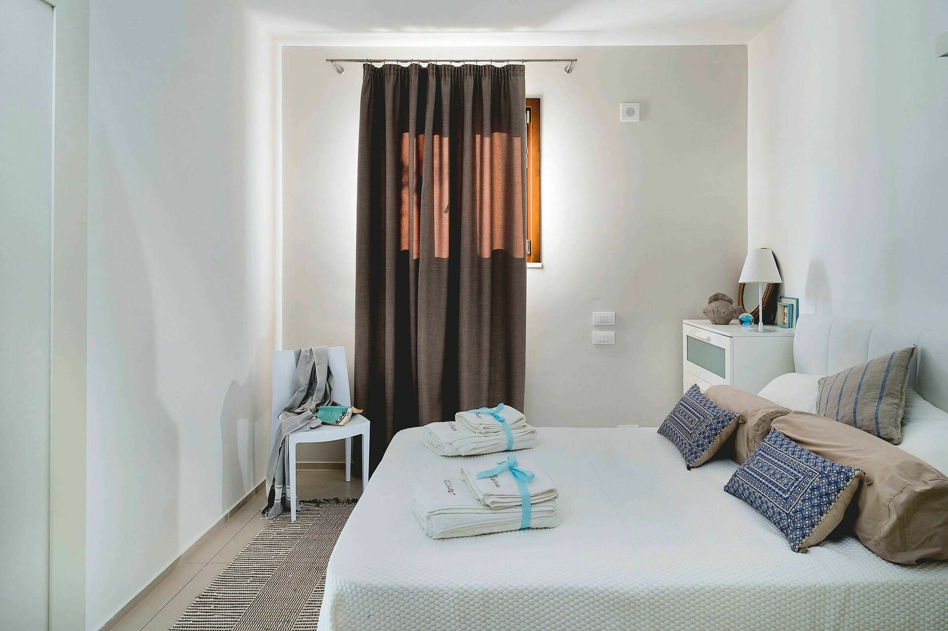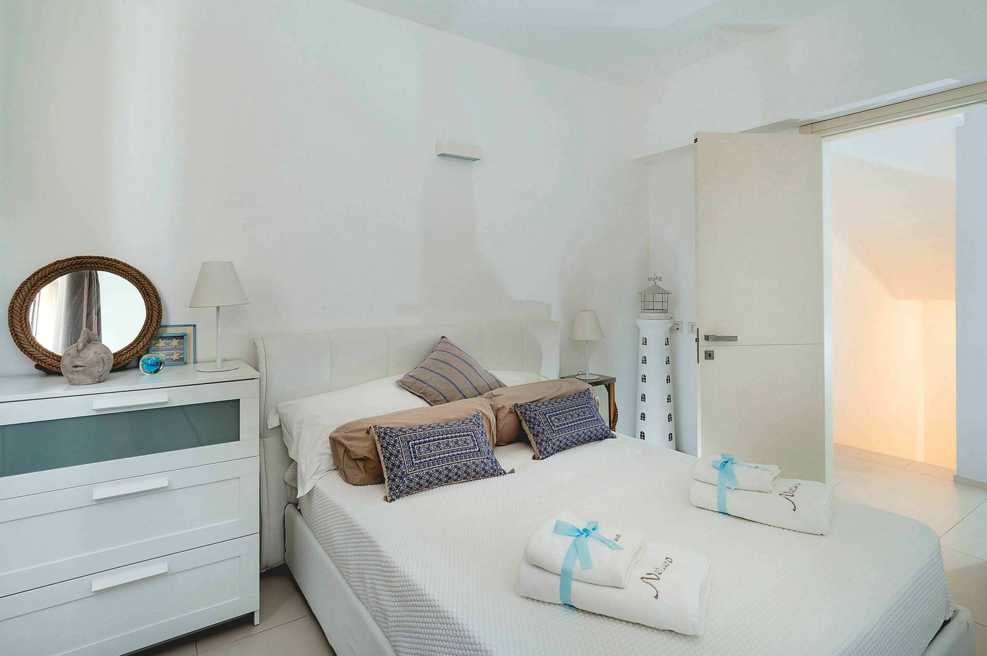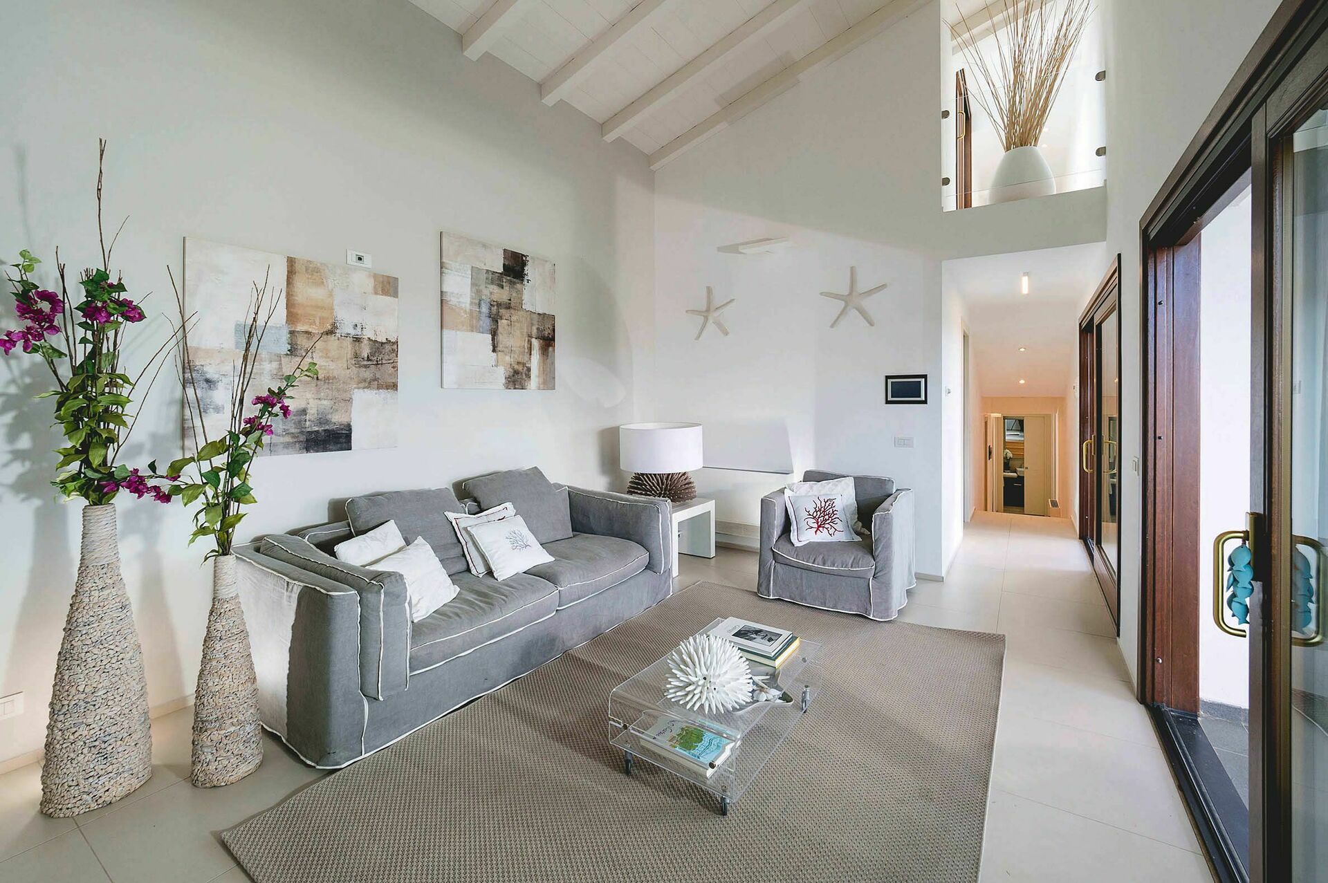 Gli ambienti interni della villa in affitto si sviluppano su tre livelli e sono stati pensati e progettati per rispondere alle esigenze del vivere contemporaneo. Arredati con gusto e cura dei particolari, sono dotati di internet Wi-Fi, TV satellitare, impianto Hi-Fi, lavatrice, lavastoviglie, cassaforte e aria condizionata. Grazie alle sue 3 camere da letto e alle sue aree comuni, questa casa vacanze sul mare può comodamente ospitare fino a 6 persone.