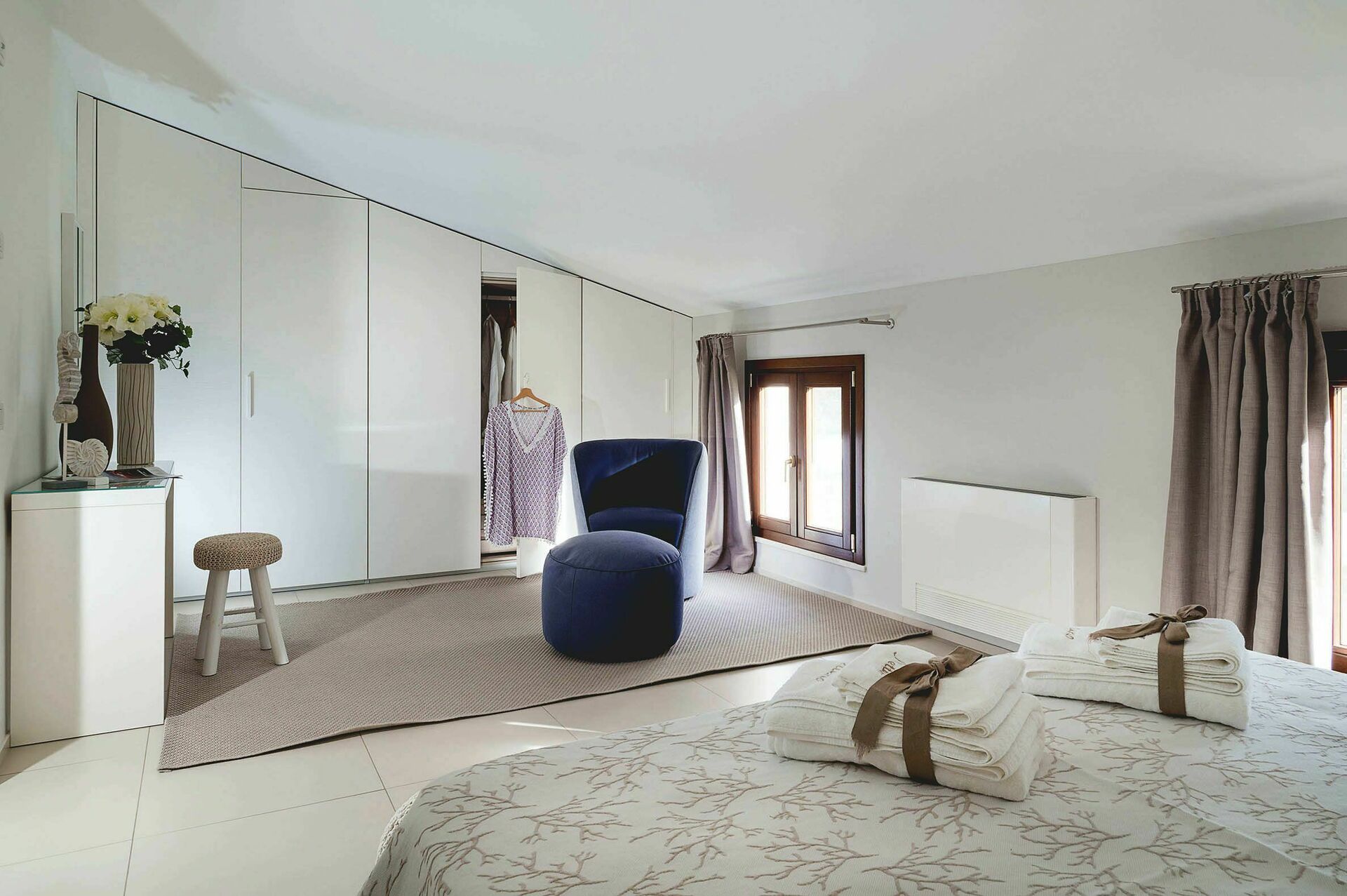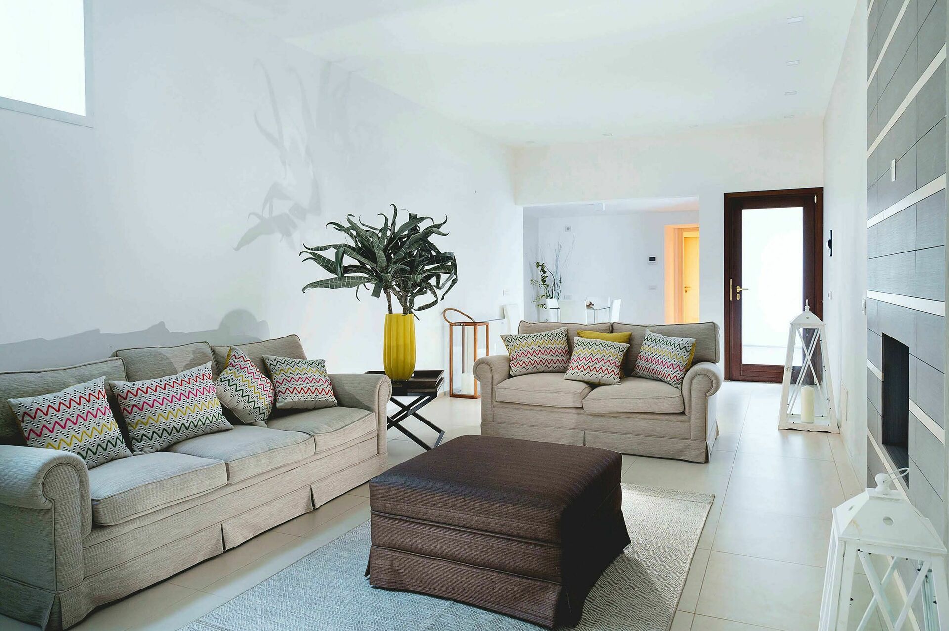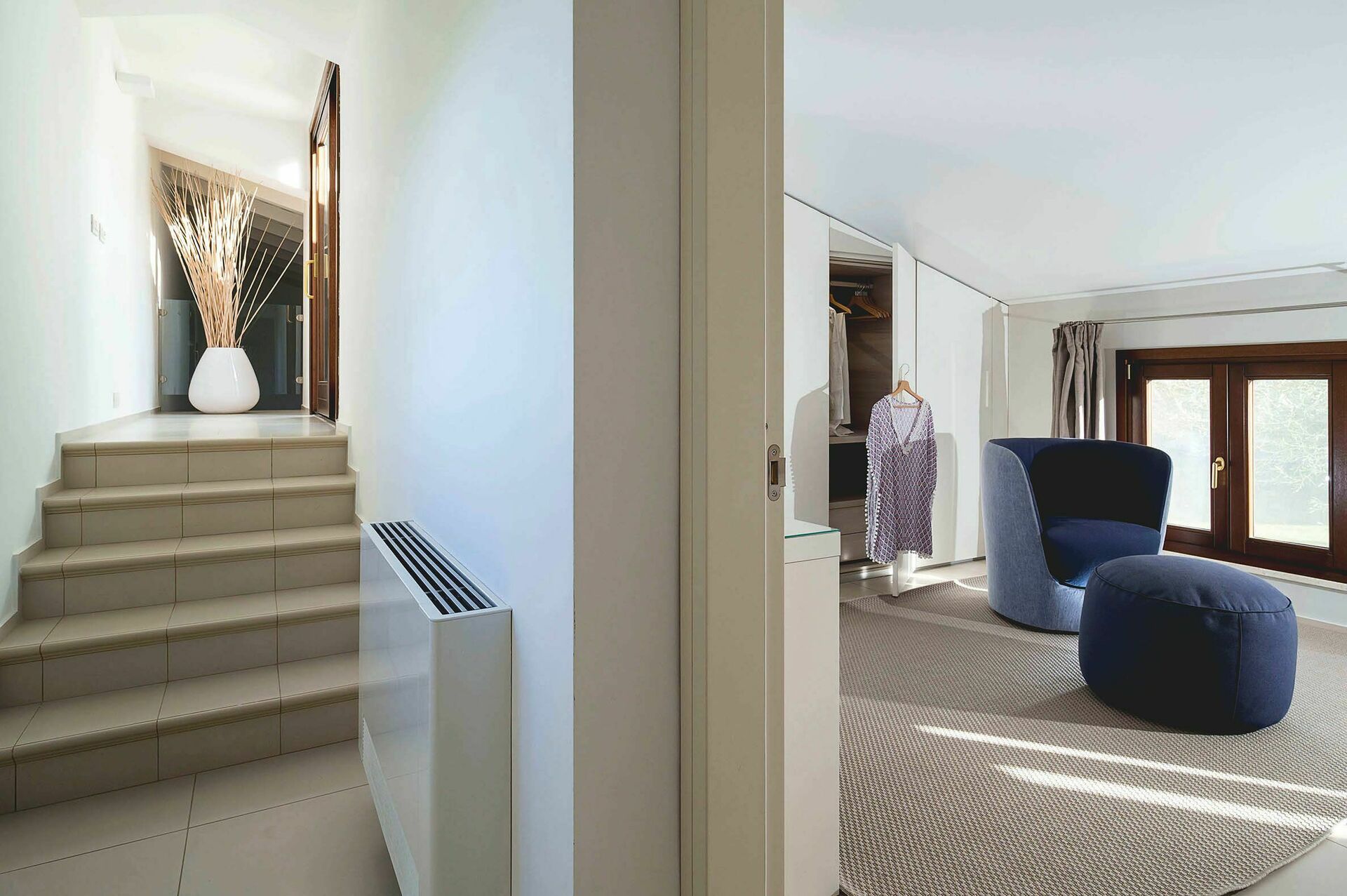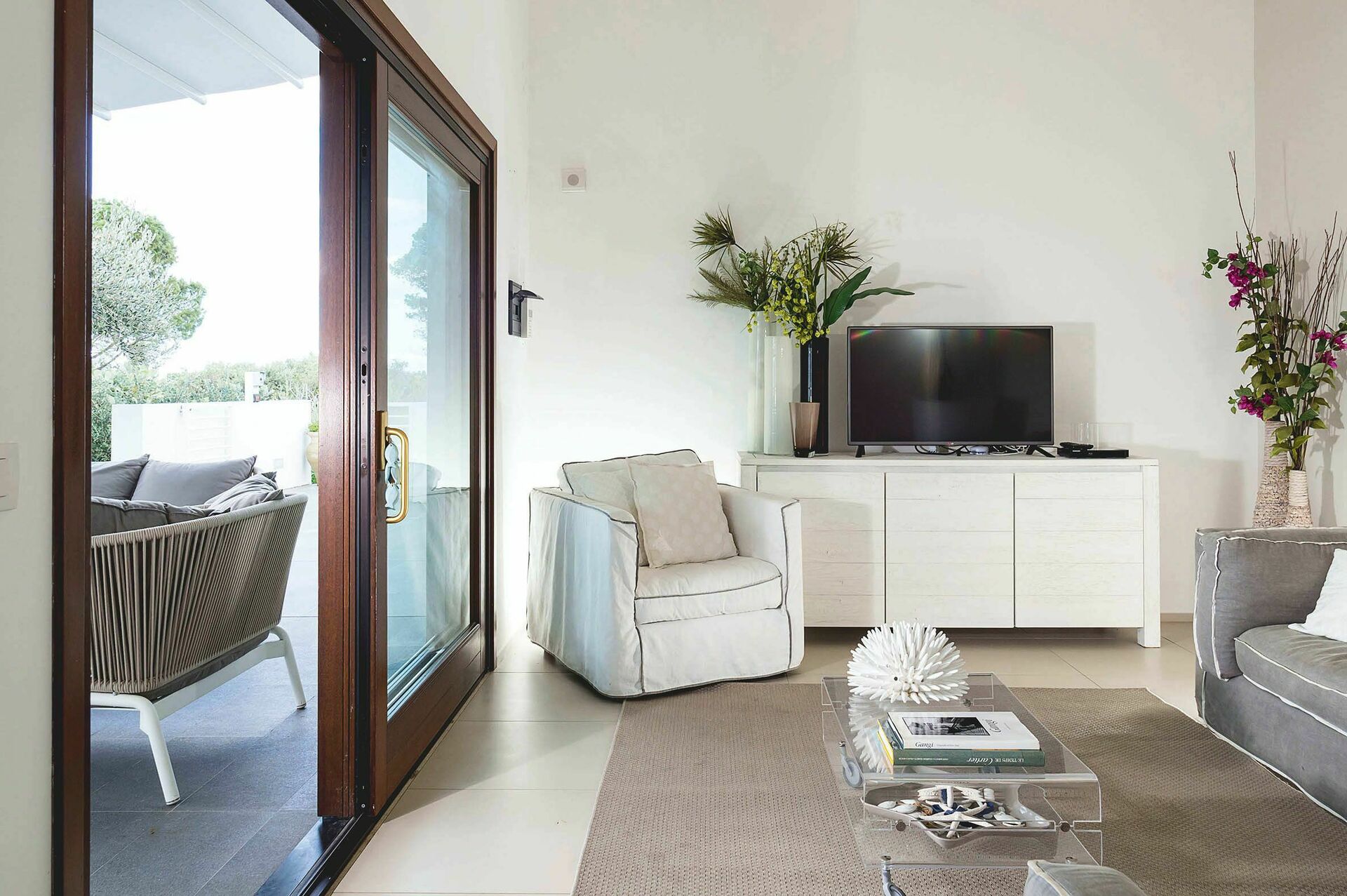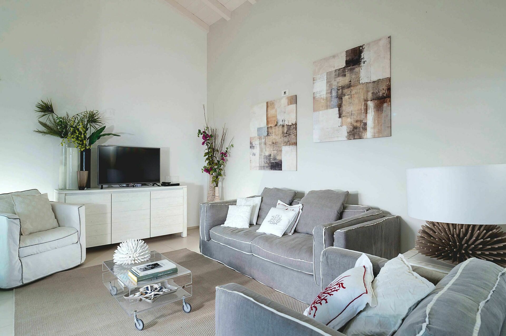 Gli ambienti interni della villa in affitto si sviluppano su tre livelli e sono stati pensati e progettati per rispondere alle esigenze del vivere contemporaneo. Arredati con gusto e cura dei particolari, sono dotati di internet Wi-Fi, TV satellitare, impianto Hi-Fi, lavatrice, lavastoviglie, cassaforte e aria condizionata. Grazie alle sue 3 camere da letto e alle sue aree comuni, questa casa vacanze sul mare può comodamente ospitare fino a 6 persone.