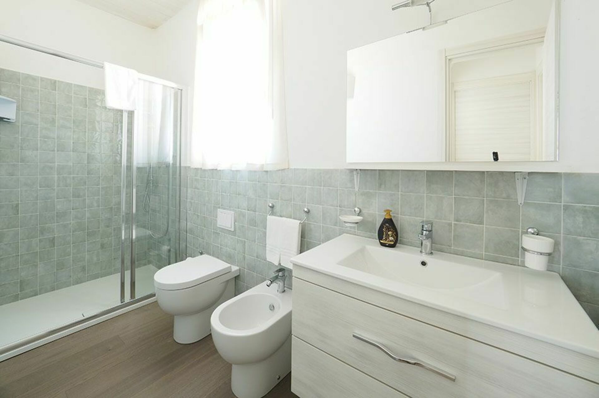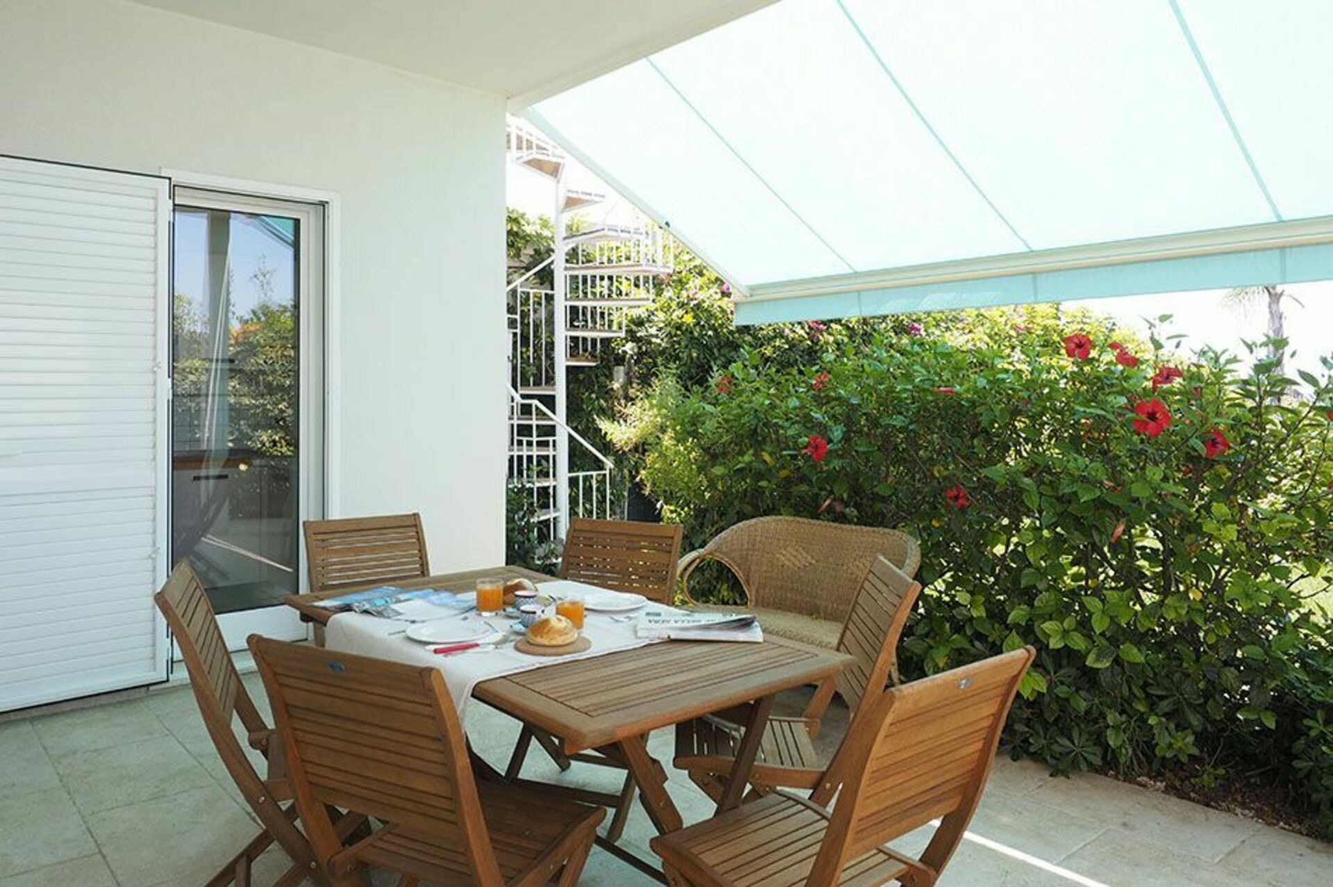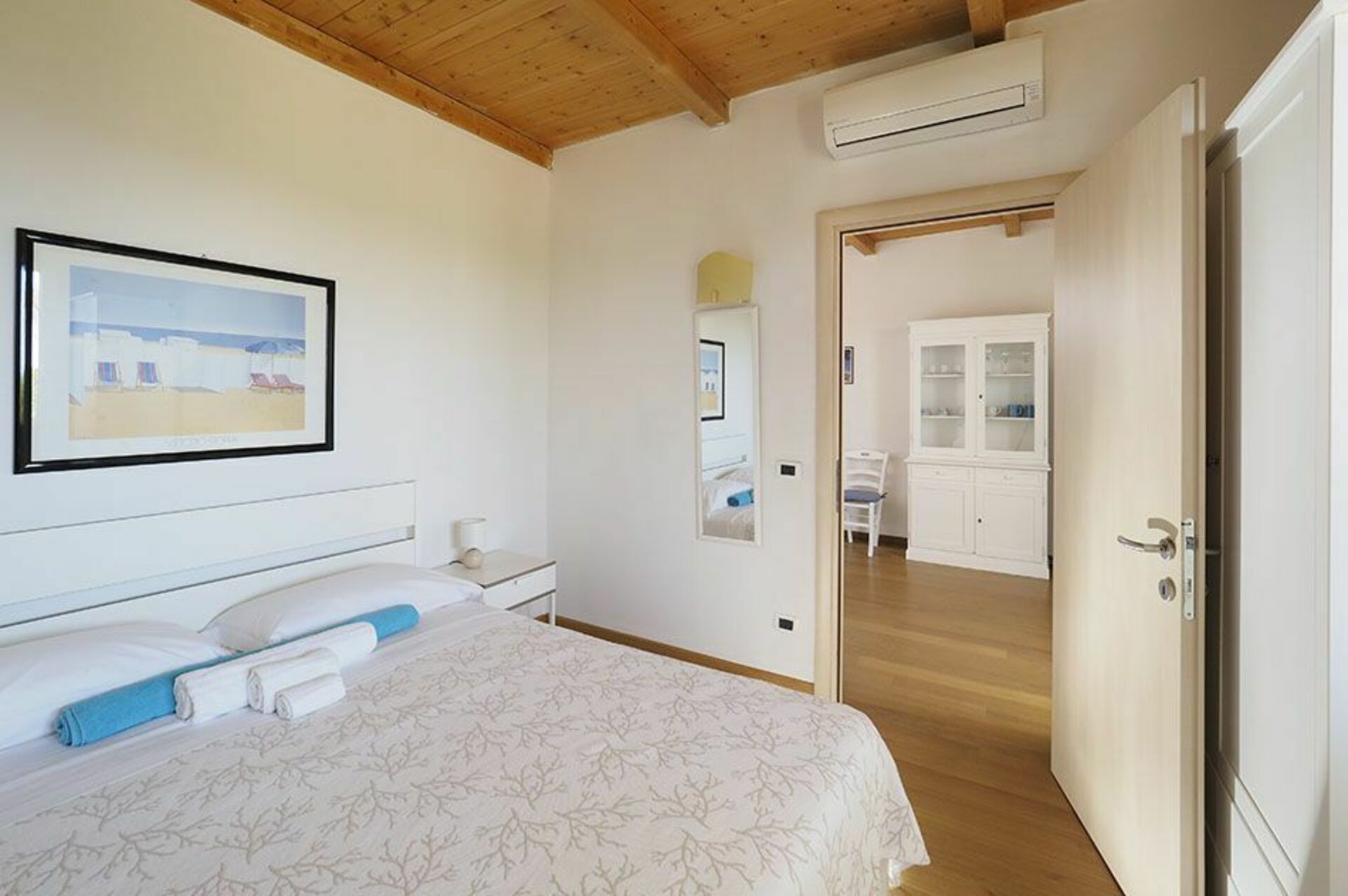 I suoi esterni sono molto curati con prato all'inglese, una veranda arredata con tavolo e sedie permette di consumare pasti all'aperto godendo di una bellissima vista mare.