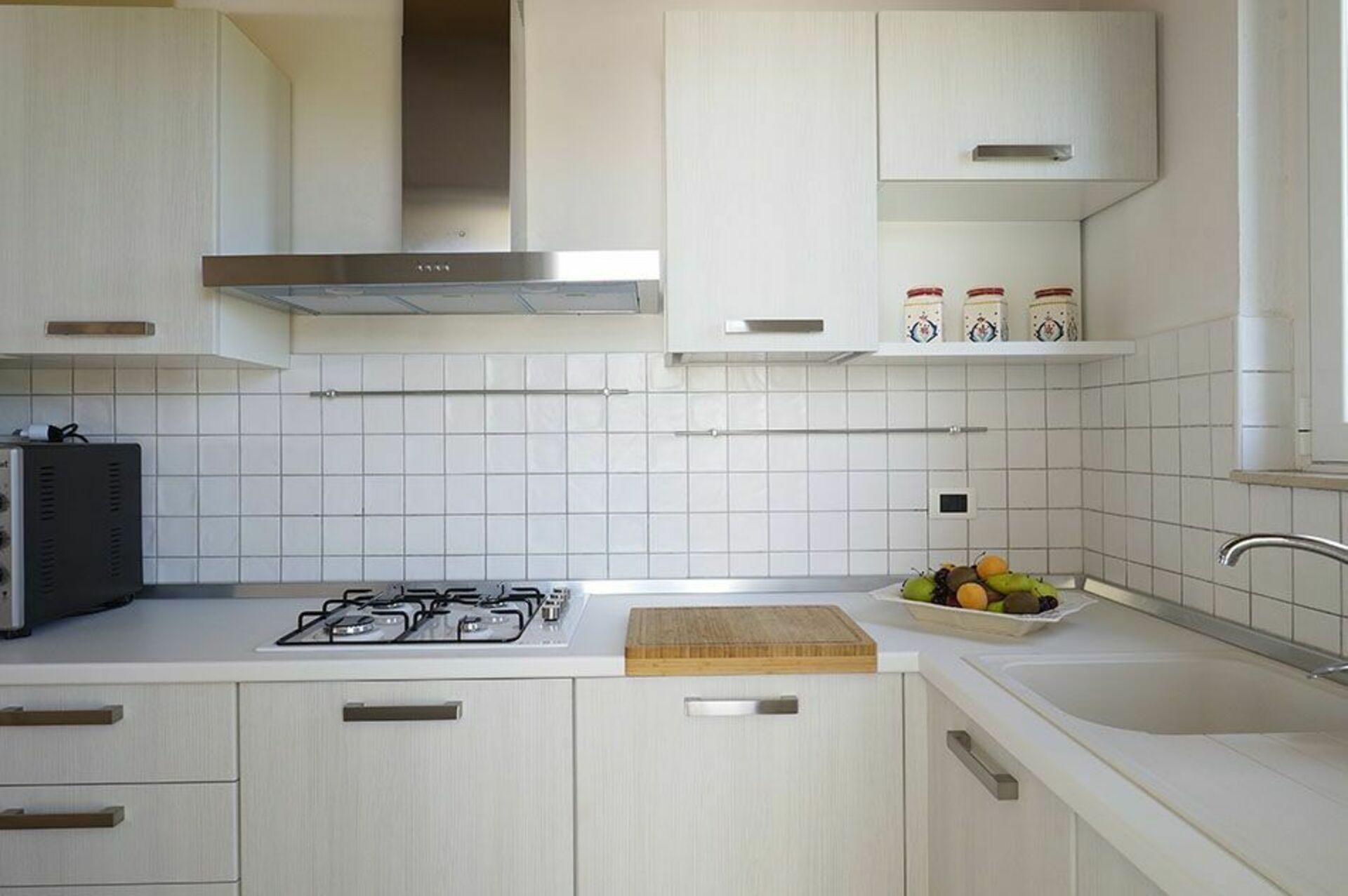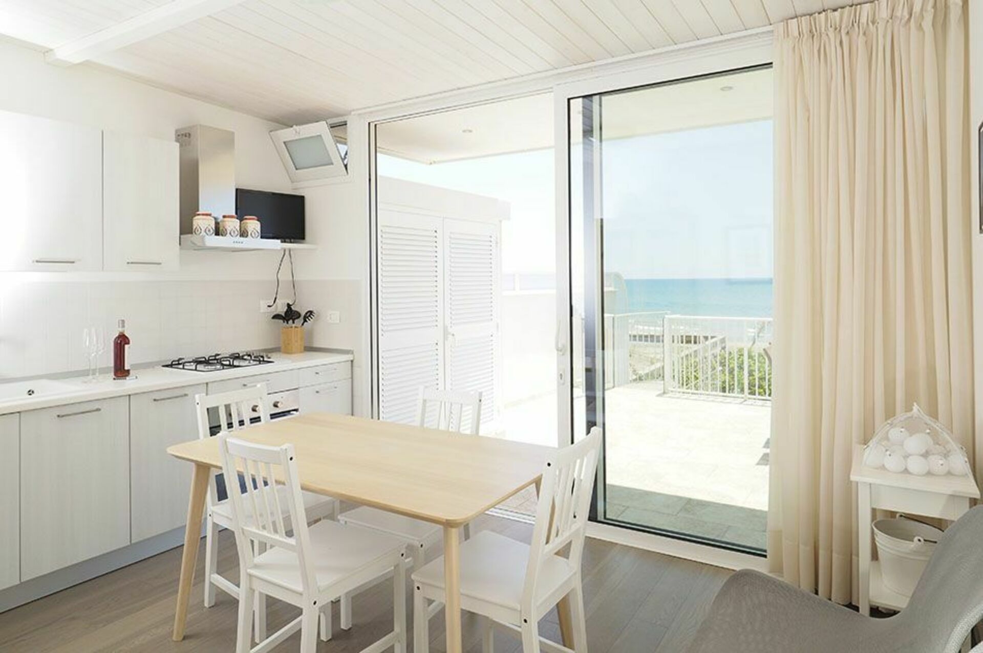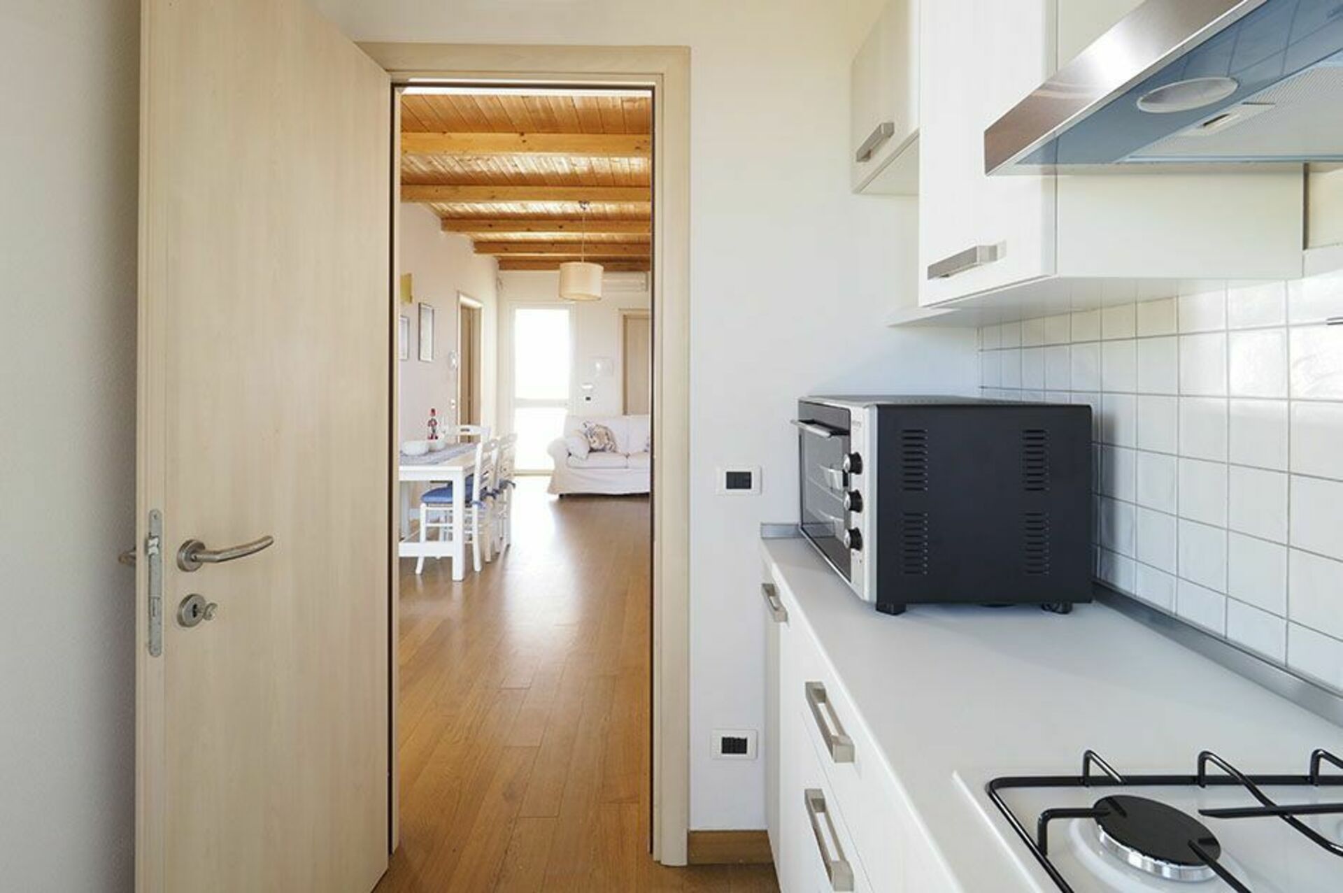 I suoi esterni sono molto curati con prato all'inglese, una veranda arredata con tavolo e sedie permette di consumare pasti all'aperto godendo di una bellissima vista mare.