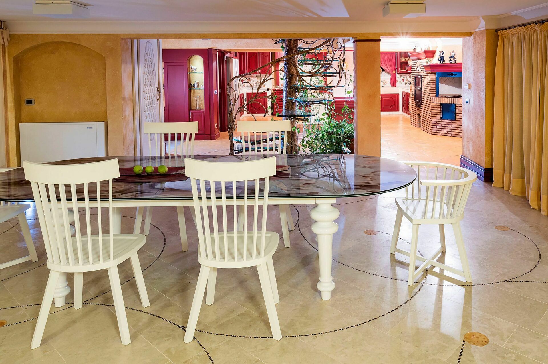 Questi lussuosi ambienti interni, corredati da tendaggi e tessuti coordinati, sono dotati di tutti i moderni comfort quali aria condizionata, internet Wi-Fi, TV satellitare, impianto Hi-Fi con filodiffusione, forno a legna, lavatrice e lavastoviglie.