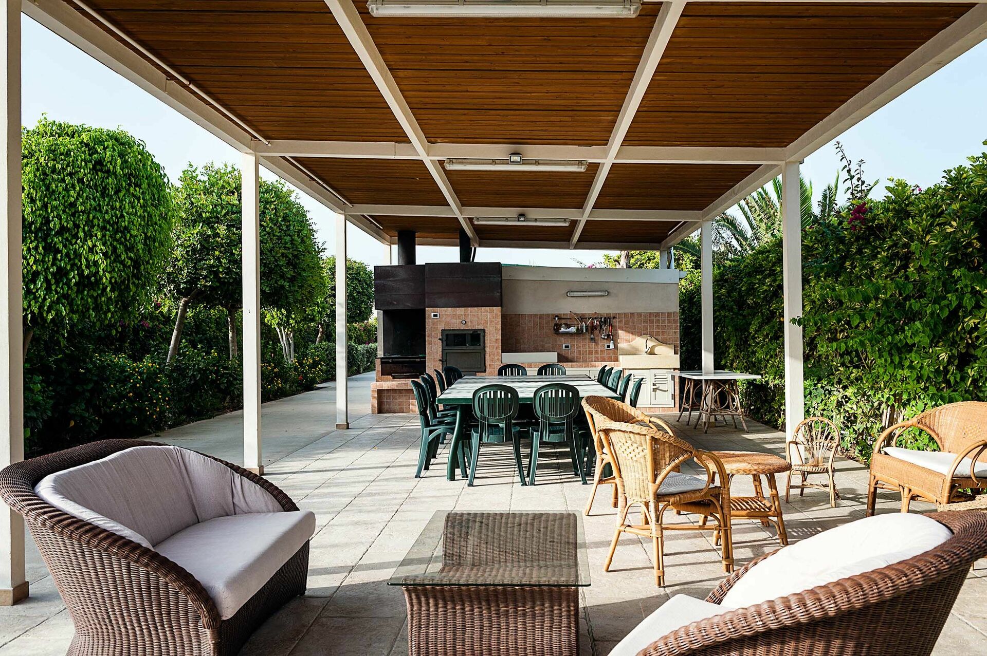 Sul retro della villa si trova anche un'ampia terrazza in comune attrezzata con cucina esterna e barbecue.