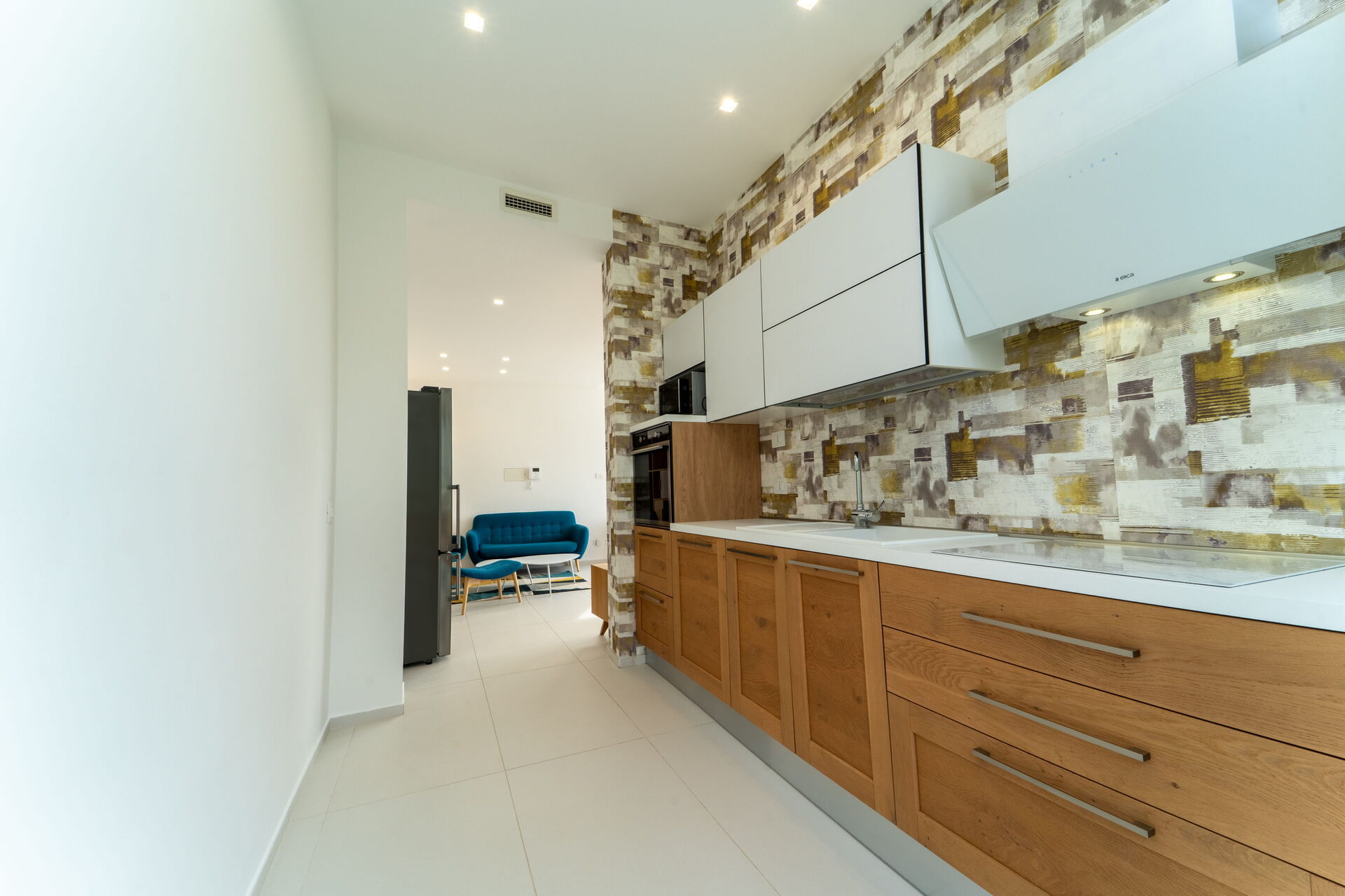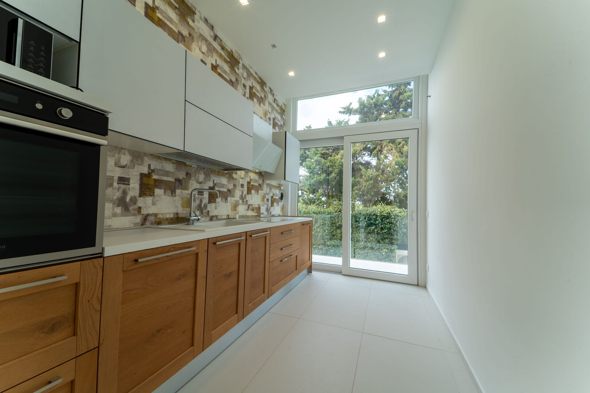 Piano terreno rialzato: soggiorno con zona pranzo e cucina (forno, frigo, freezer, macchina da caffè, lavastoviglie, tostapane), 2 camere matrimoniali, 2 bagni ognuno con doccia.