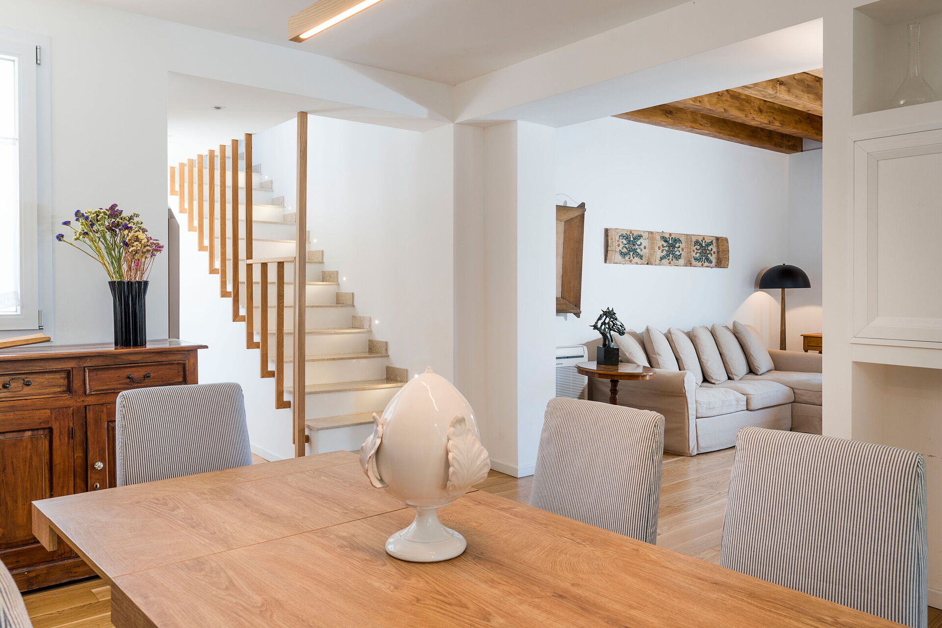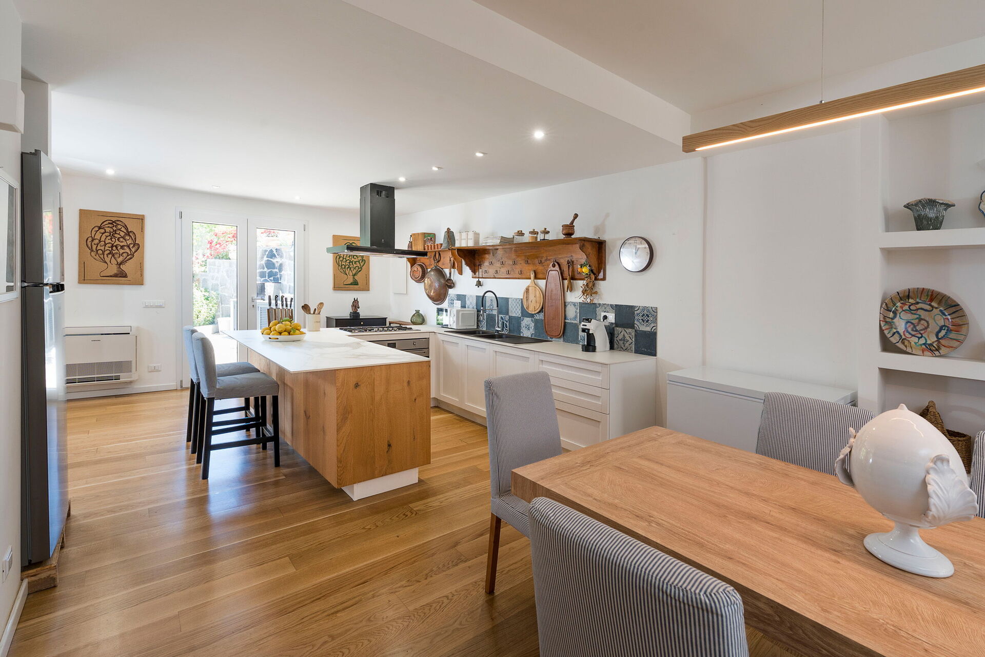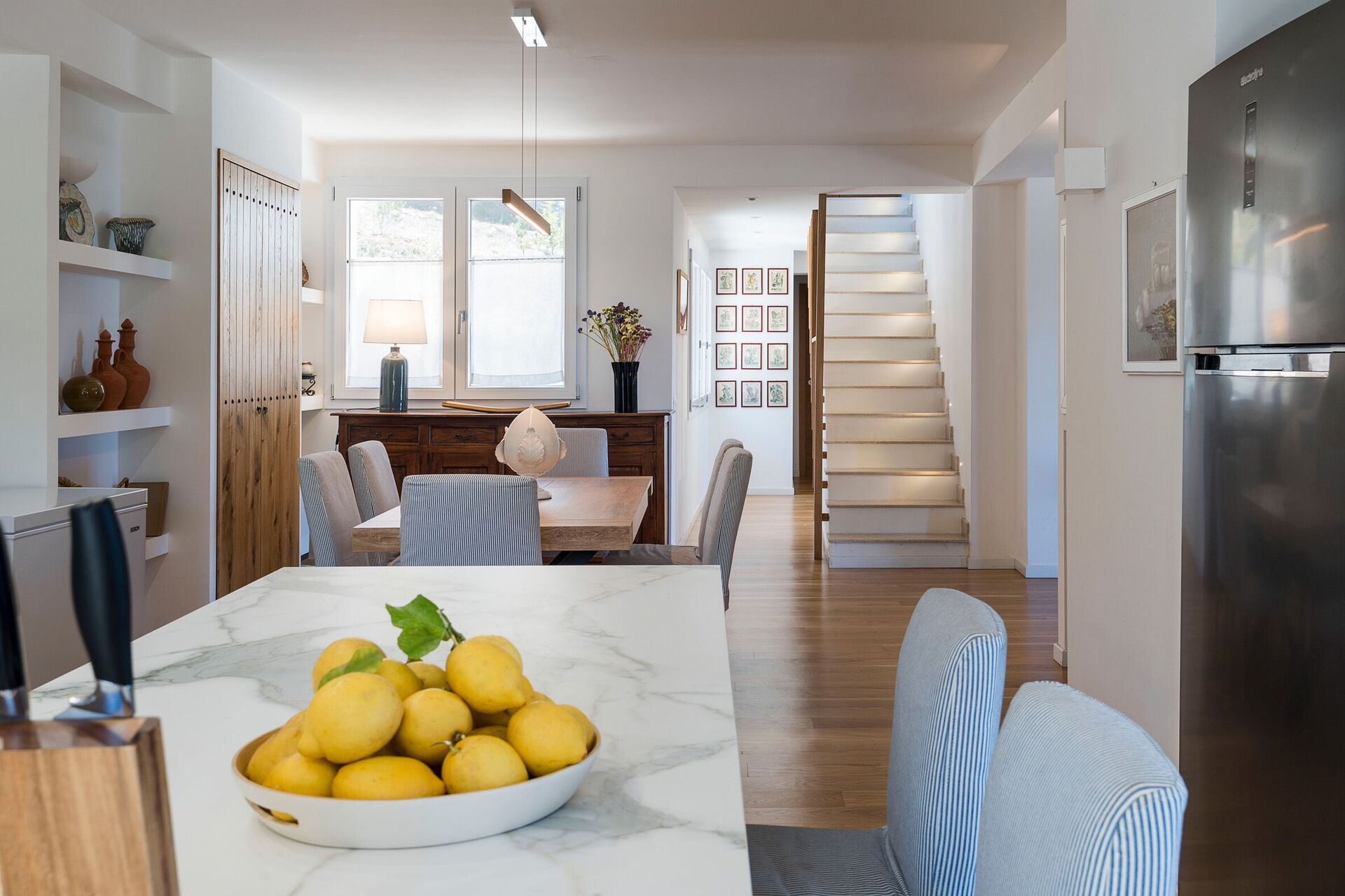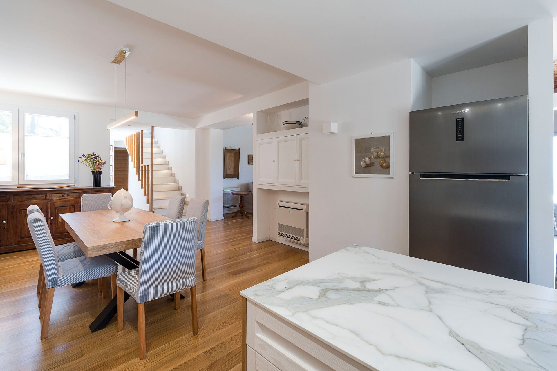 Piano terreno: soggiorno (camino) con cucina (forno, frigorifero, freezer, lavastoviglie, piano cottura, microonde, tostapane, macchina da caffè espresso) e zona pranzo, lavanderia,