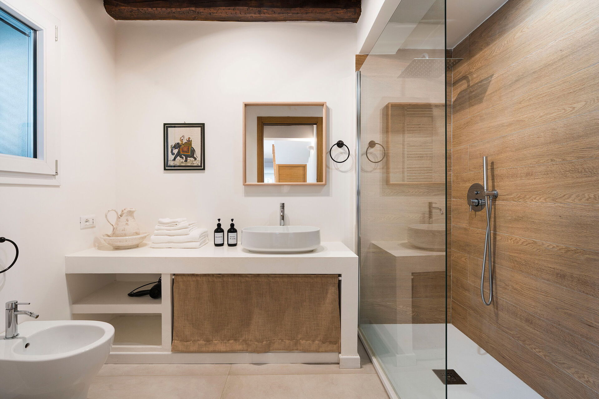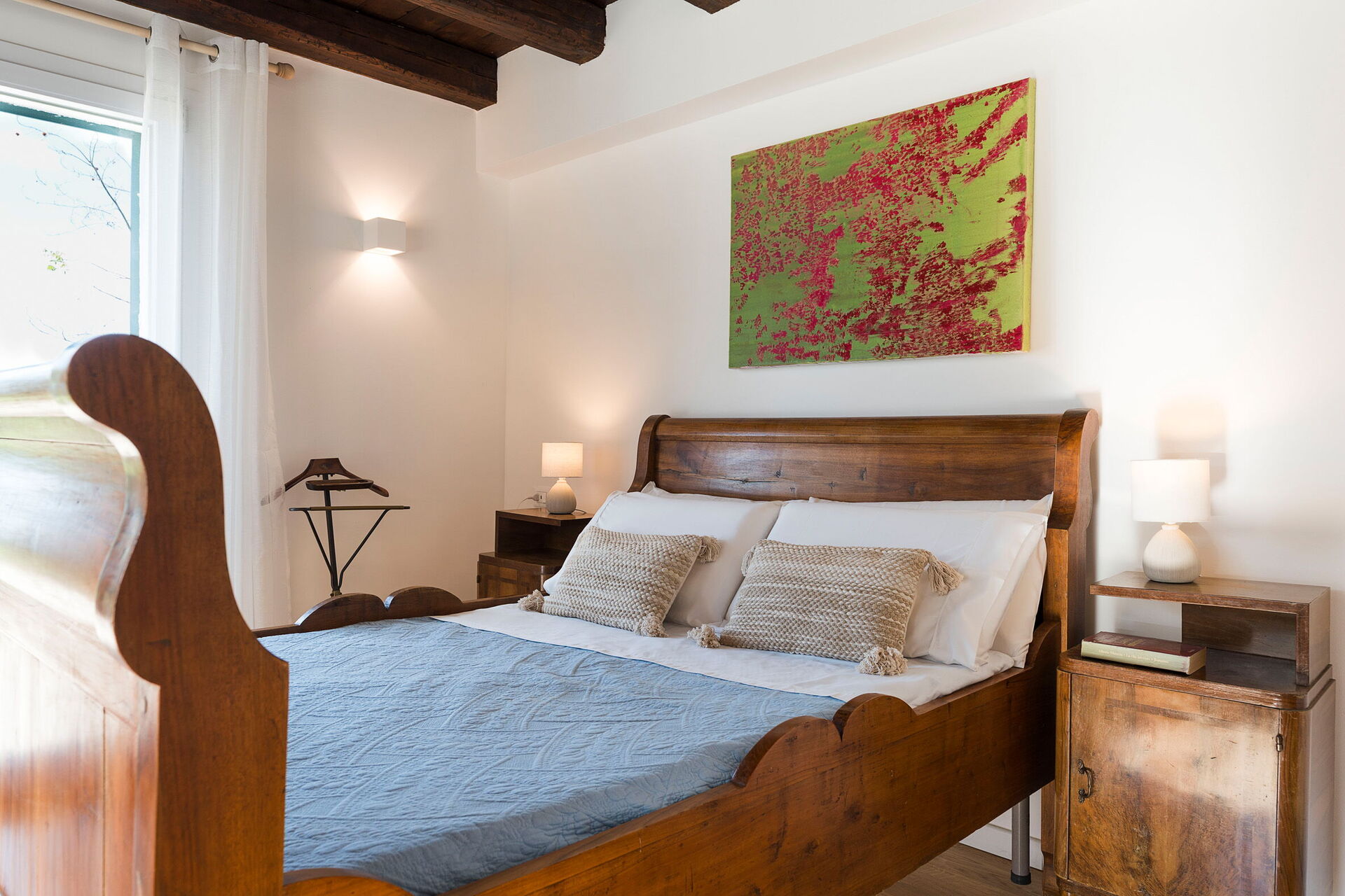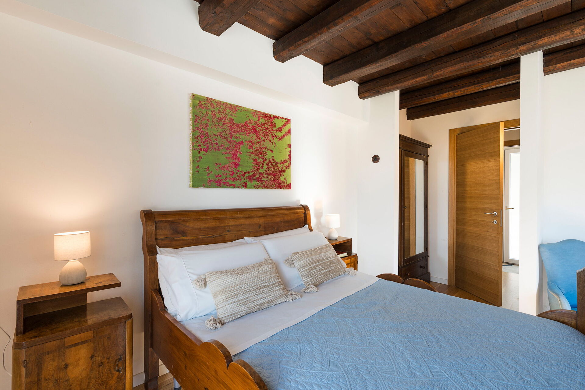camera matrimoniale (misure del letto: 160x200 cm), bagno con doccia, camera con letto alla francese, wc.