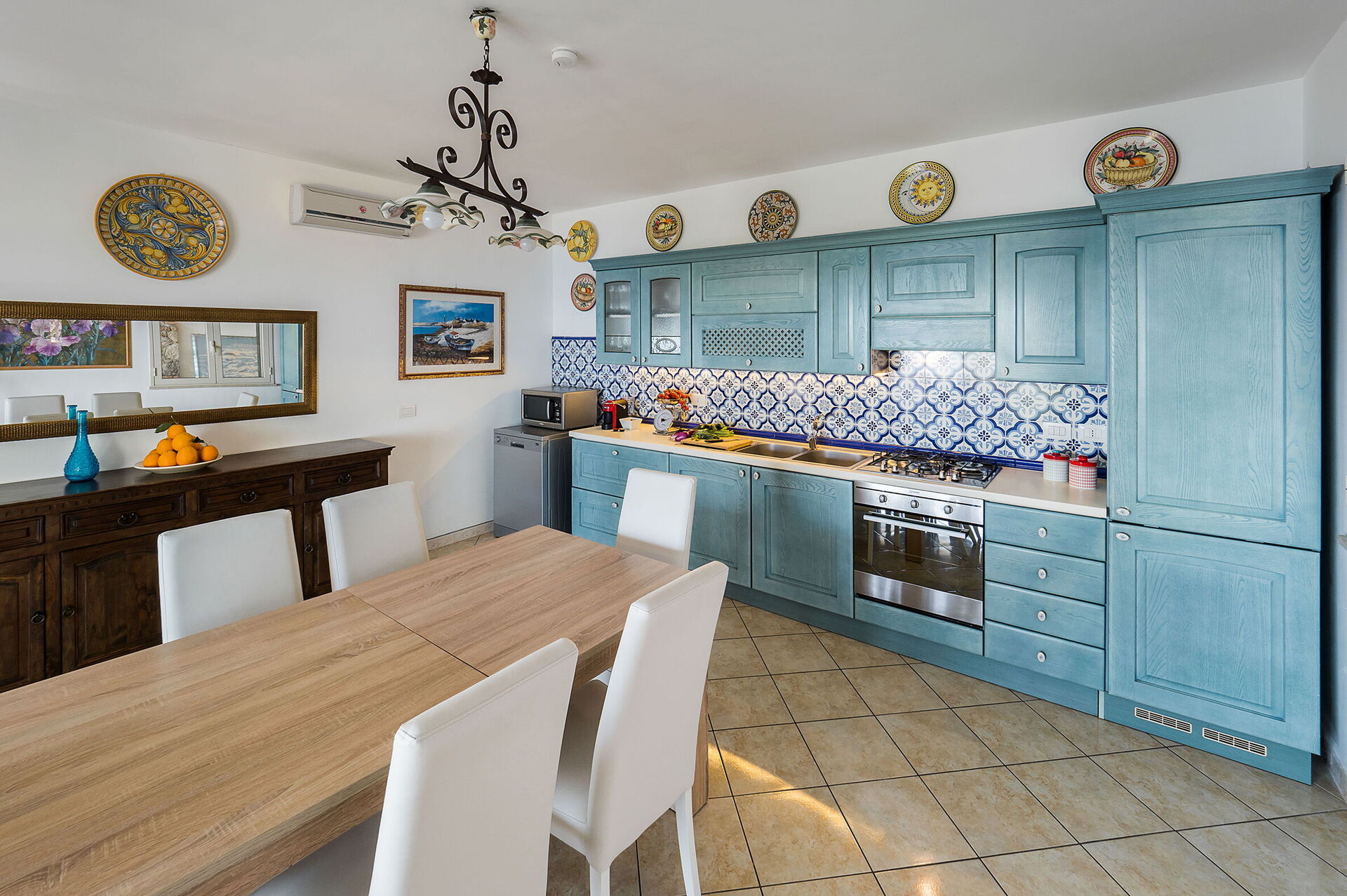 Piano primo:soggiorno con accesso a panoramica terrazza, cucina (piano cottura, forno, frigorifero, freezer, lavastoviglie, microonde, tostapane, macchina da caffè espresso, macchina da caffè americano) con zona pranzo, camera matrimoniale (aria condizionata, tv, zanzariera) con bagno con doccia.