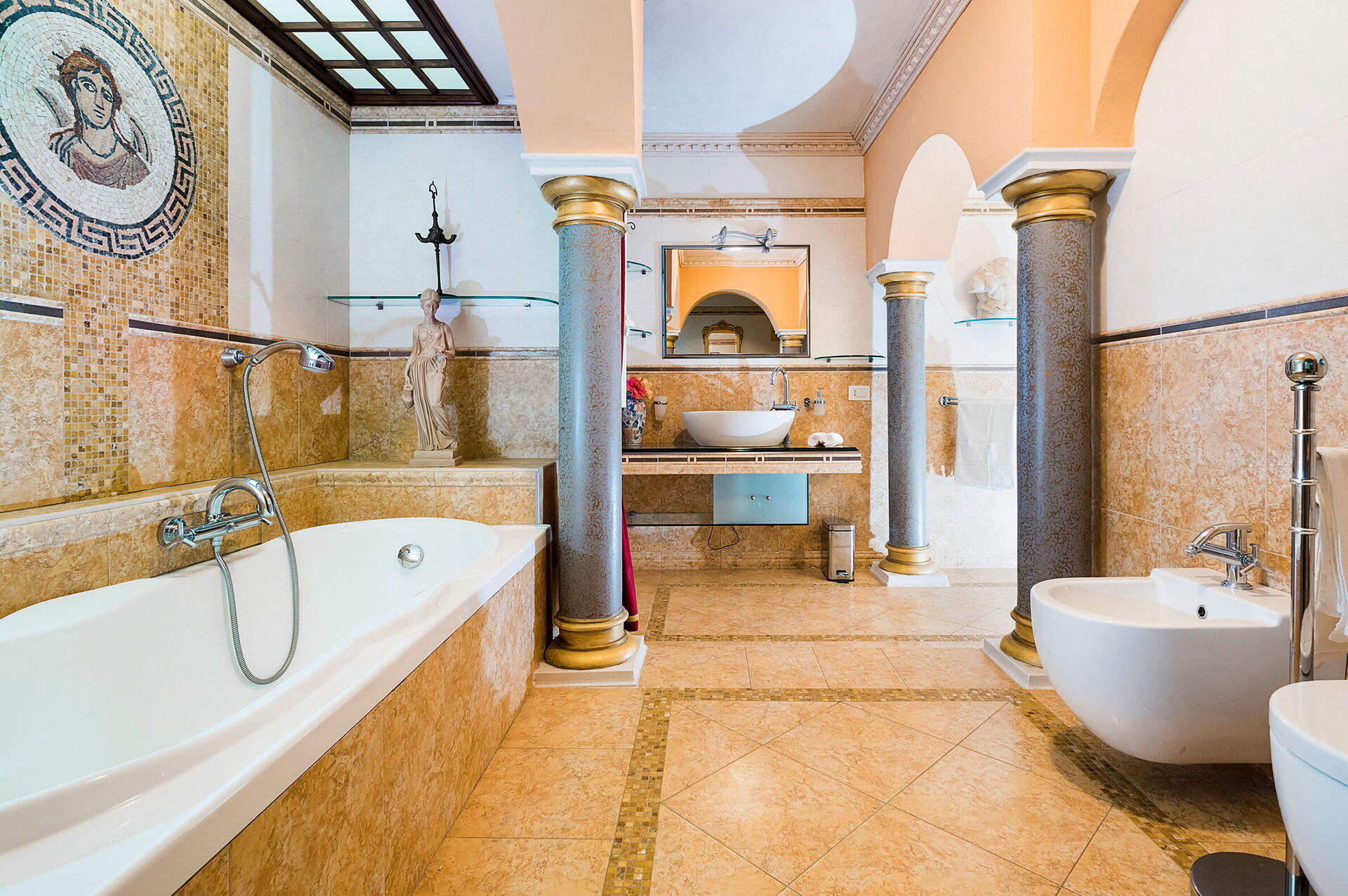 Piano terreno: camera matrimoniale (aria condizionata, frigobar, tv, zanzariera) con bagno privato con vasca e doccia